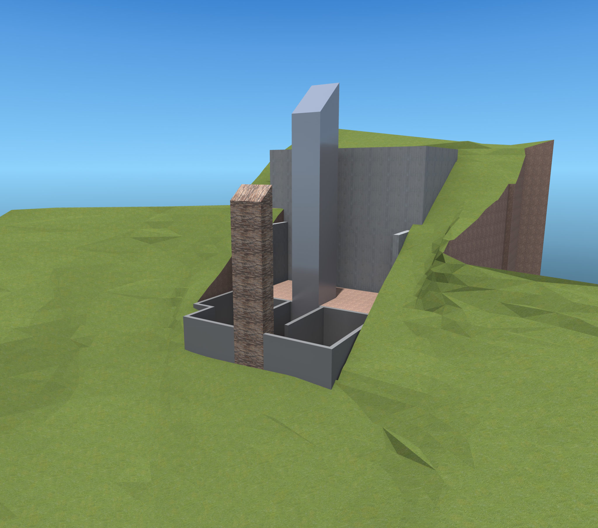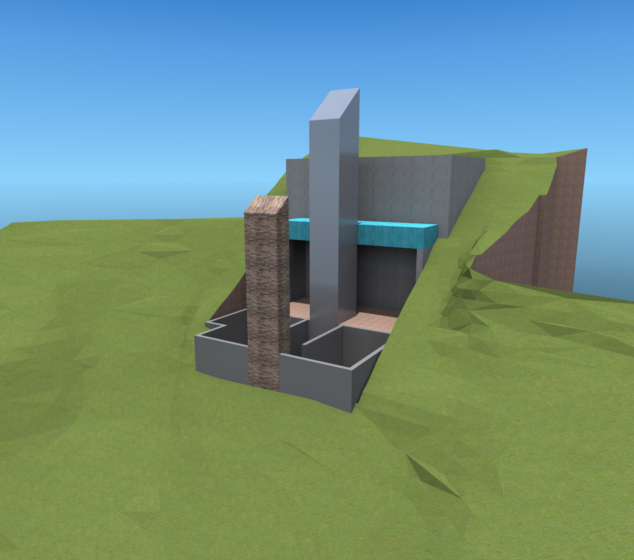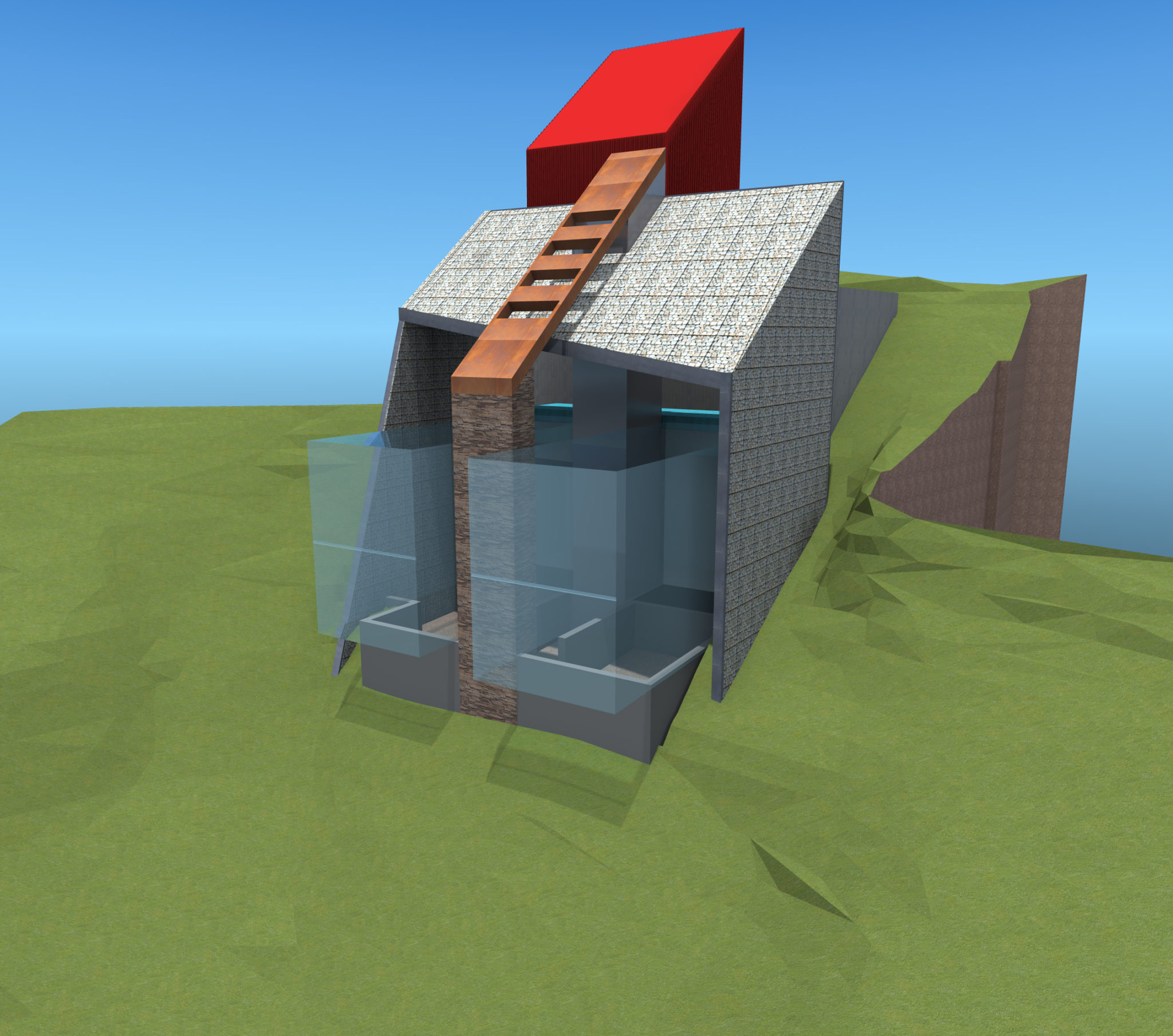 The DTS Project House design concept aims to reconcile two western ideals: the city and the garden. A vertical element establishes a presence on the urban approach to the property. One enters the property through an enclosed urban courtyard of total architecture that doubles as a motor court and a group event space. Exposed concrete walls stabilize and secure the hillside. An above ground, man-made water element (lap pool) marks the transition from city to garden. Two jewel like steel and glass horizontal boxes sit on and cantilever from the concrete walls. In the gap between the two steel boxes is a vertical space connecting ground and sky and housing the stair and glass elevator tower for vertical circulation. A stone fireplace mass visually roots the two transparent glass boxes to the hillside. The two cantilevered glass boxes are “wrapped” and protected with a freestanding, iconic shaped gabion wall and roof structure that literally filters the outside world. The position of the protective gabion structure in relation to the other design elements provides the dual experiences of a protective cave and the freedom of escape.