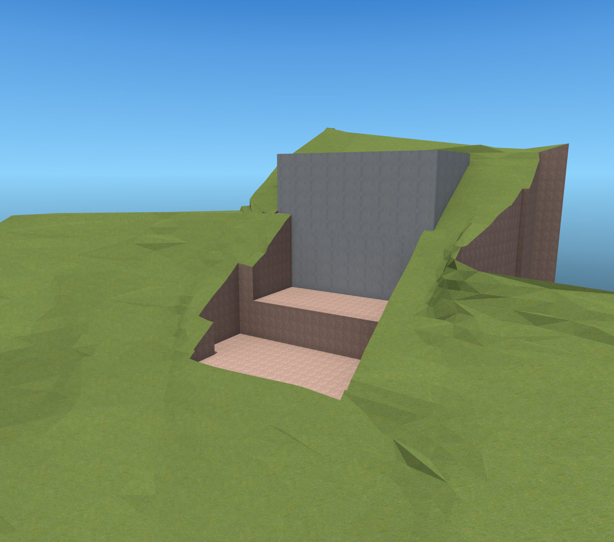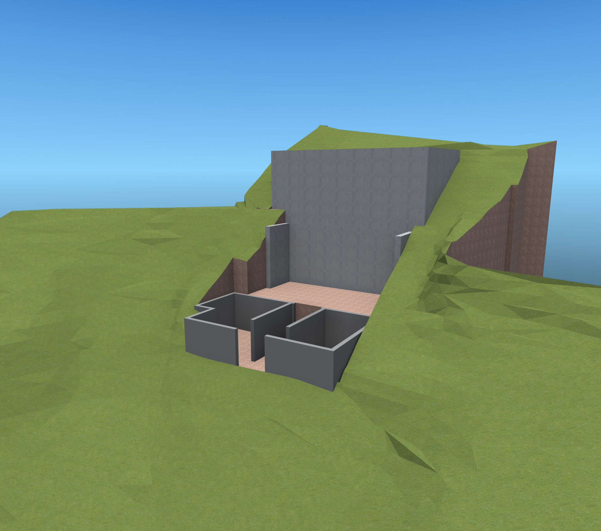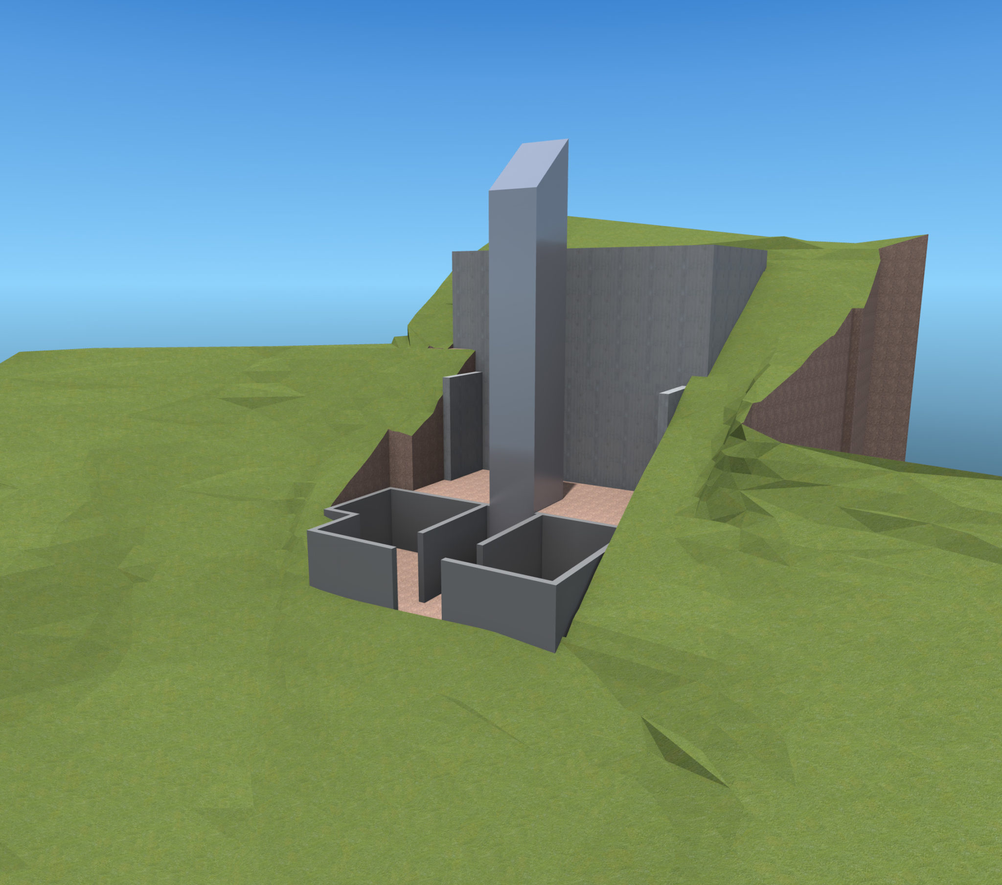 The DTS Project House design concept aims to reconcile two western ideals: the city and the garden. A vertical element establishes a presence on the urban approach to the property. One enters the property through an enclosed urban courtyard of total architecture that doubles as a motor court and a group event space. Exposed concrete walls stabilize and secure the hillside. An above ground, man-made water element (lap pool) marks the transition from city to garden. Two jewel like steel and glass horizontal boxes sit on and cantilever from the concrete walls. In the gap between the two steel boxes is a vertical space connecting ground and sky and housing the stair and glass elevator tower for vertical circulation. A stone fireplace mass visually roots the two transparent glass boxes to the hillside. The two cantilevered glass boxes are “wrapped” and protected with a freestanding, iconic shaped gabion wall and roof structure that literally filters the outside world. The position of the protective gabion structure in relation to the other design elements provides the dual experiences of a protective cave and the freedom of escape.