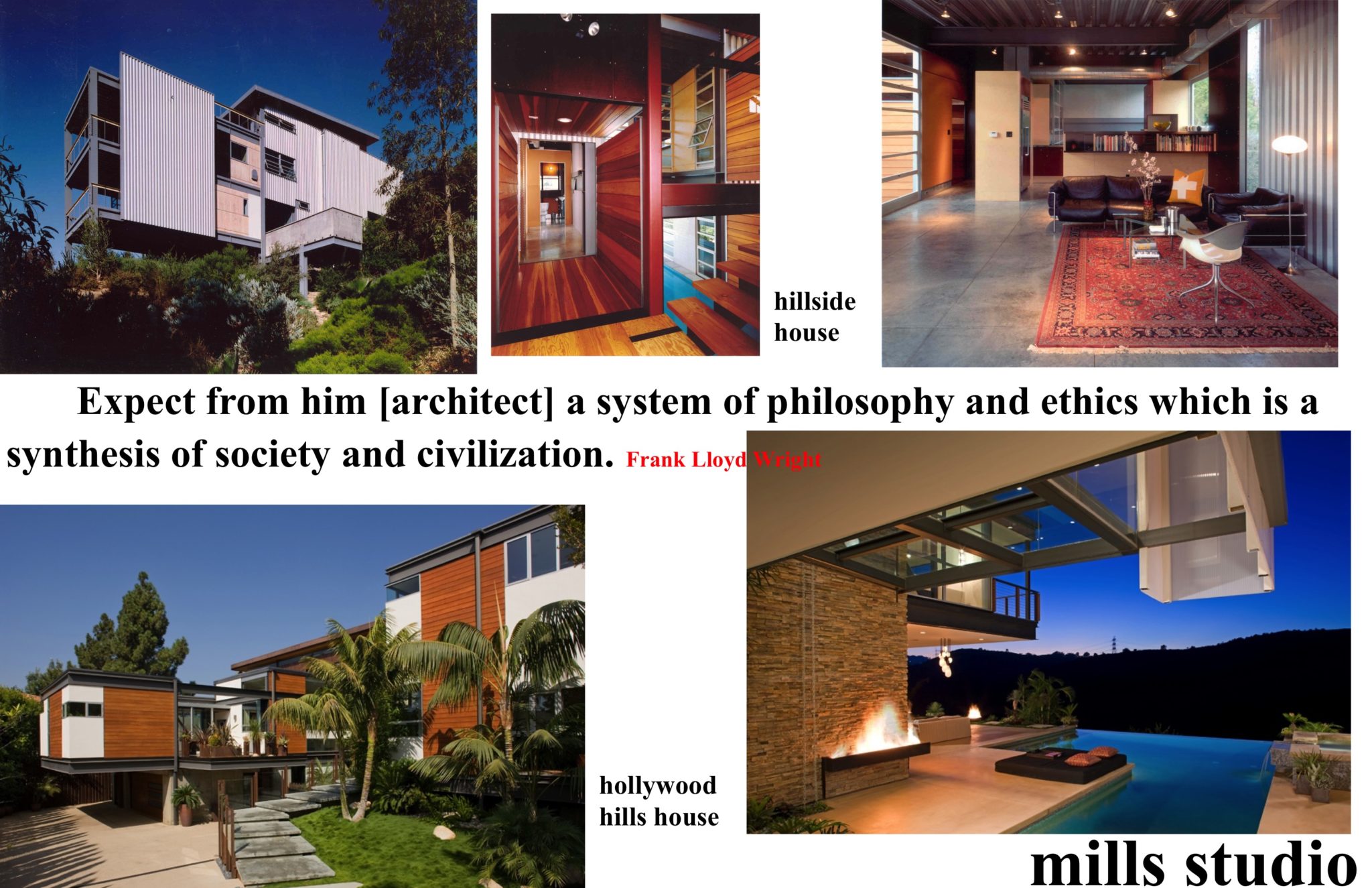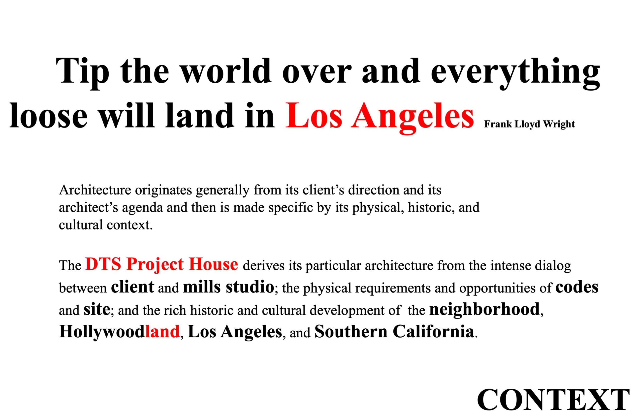 Architecture originates generally from its client’s direction and its architect’s agenda and then is made specific by its physical, historic, and cultural context. The DTS Project House derives its particular architecture from mills studio’s and the Owner’s modern aesthetic sensibilities; the physical requirements and opportunities of codes and site; and the rich historic and cultural development of the immediate neighborhood, Hollywoodland, Los Angeles, and Southern California.