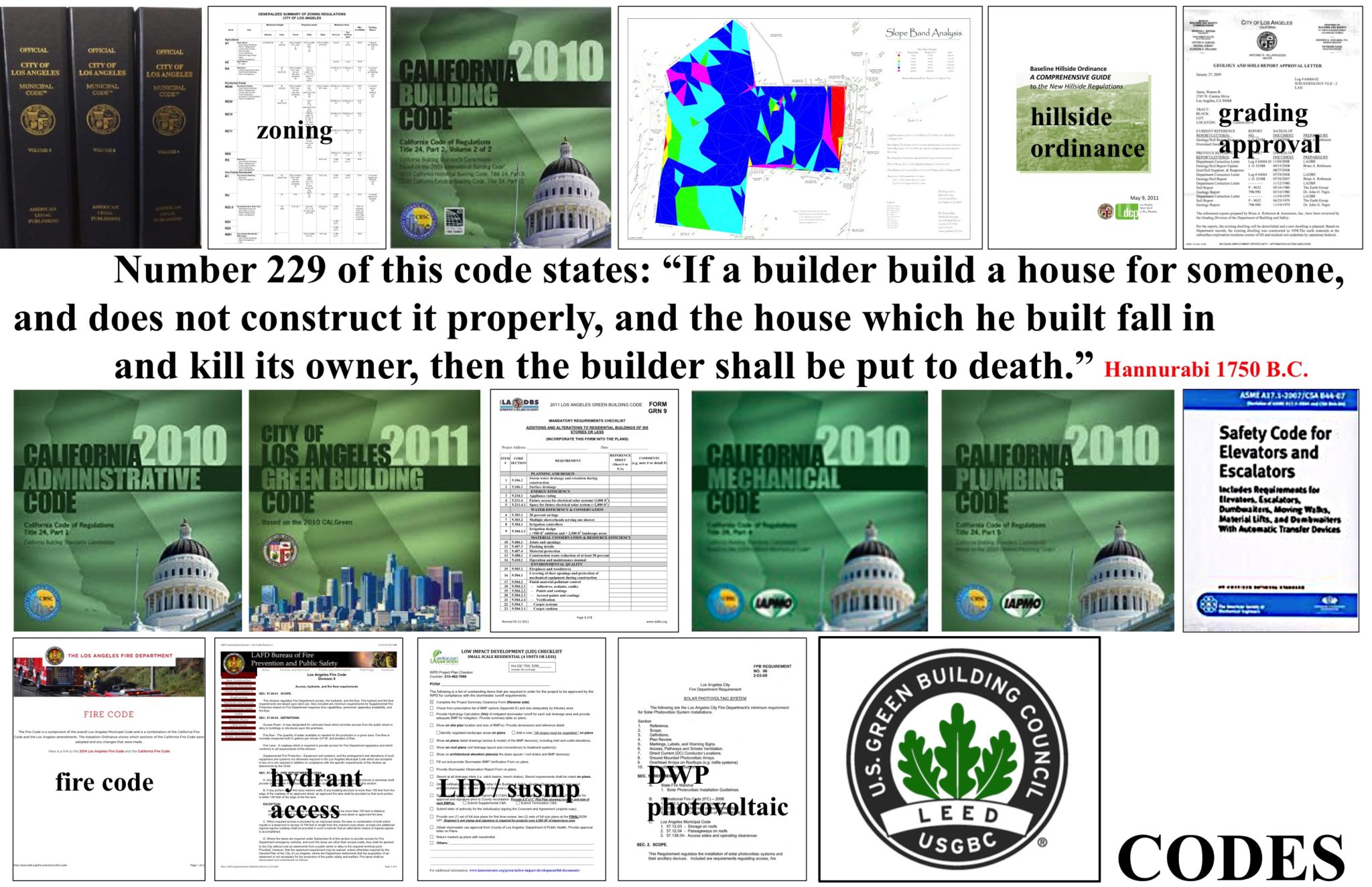 Building Codes and local Ordinances both drive general design approaches and specific design details. The local Hillside Ordinance sets the parameters for the building height at the street and as it steps down the hill, sets the number of on site parking spaces, defines the allowable square footage, and helps determine portion of building to be built above and below grade. The existing geological conditions and the required structural design for resistance to earthquakes affects the structure design and material choices. The California Green Building Code and its and Title 24 requirements affect general design approaches and specific design details and product choices. LID / SUSMP requirements affect overall site planning and landscape / hardscape details. Public Works requirements for Highway Dedication and street widening affect building access and building placement. LEED requirements necessary for Platinum Certification affect everything from general design approach to material and product choices. Unfortunately many of these code requirements compete with one another instead of working in concert and often focus on specific prescriptions instead of allowing solutions that actually address a code’s intent.
