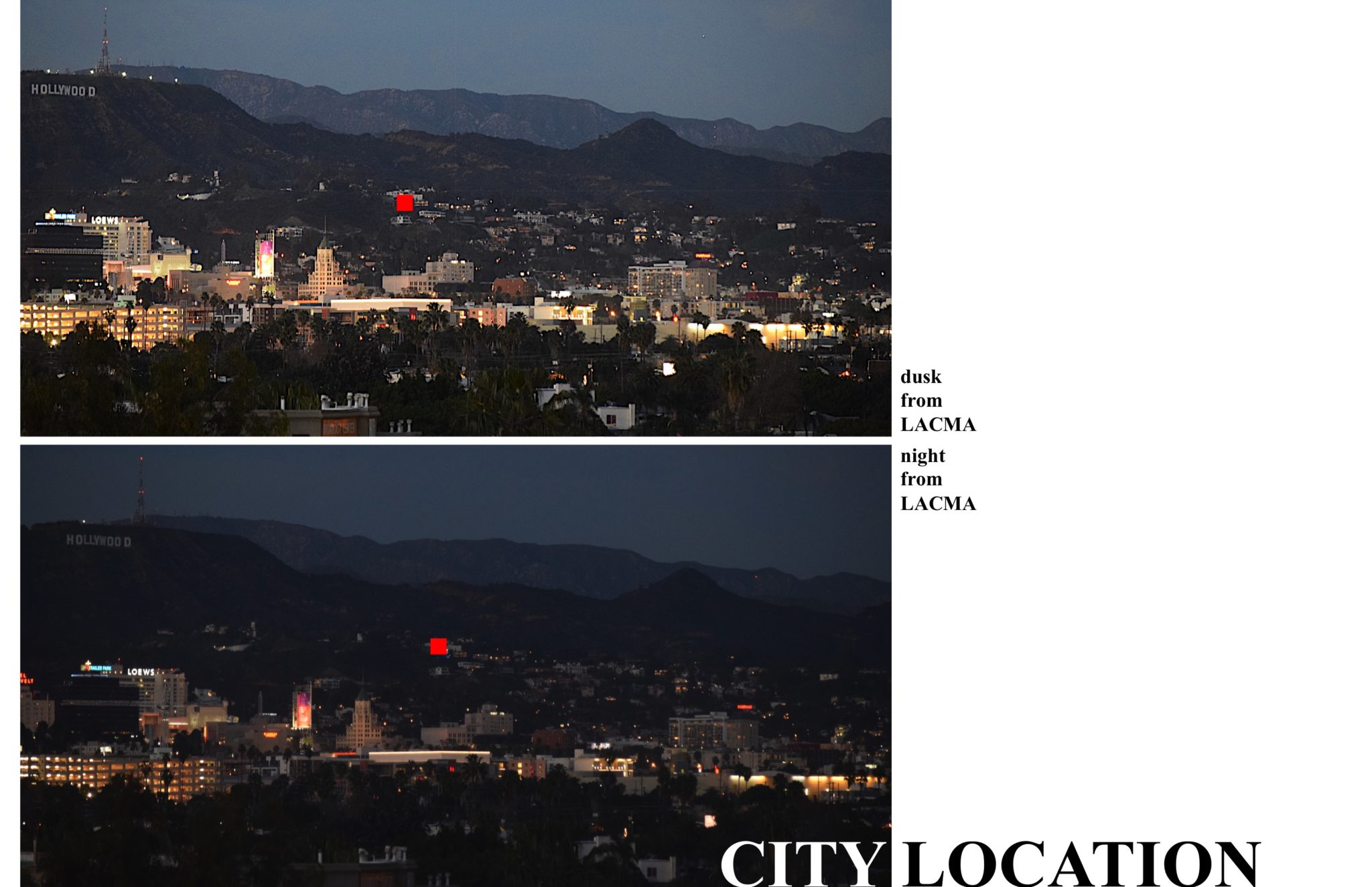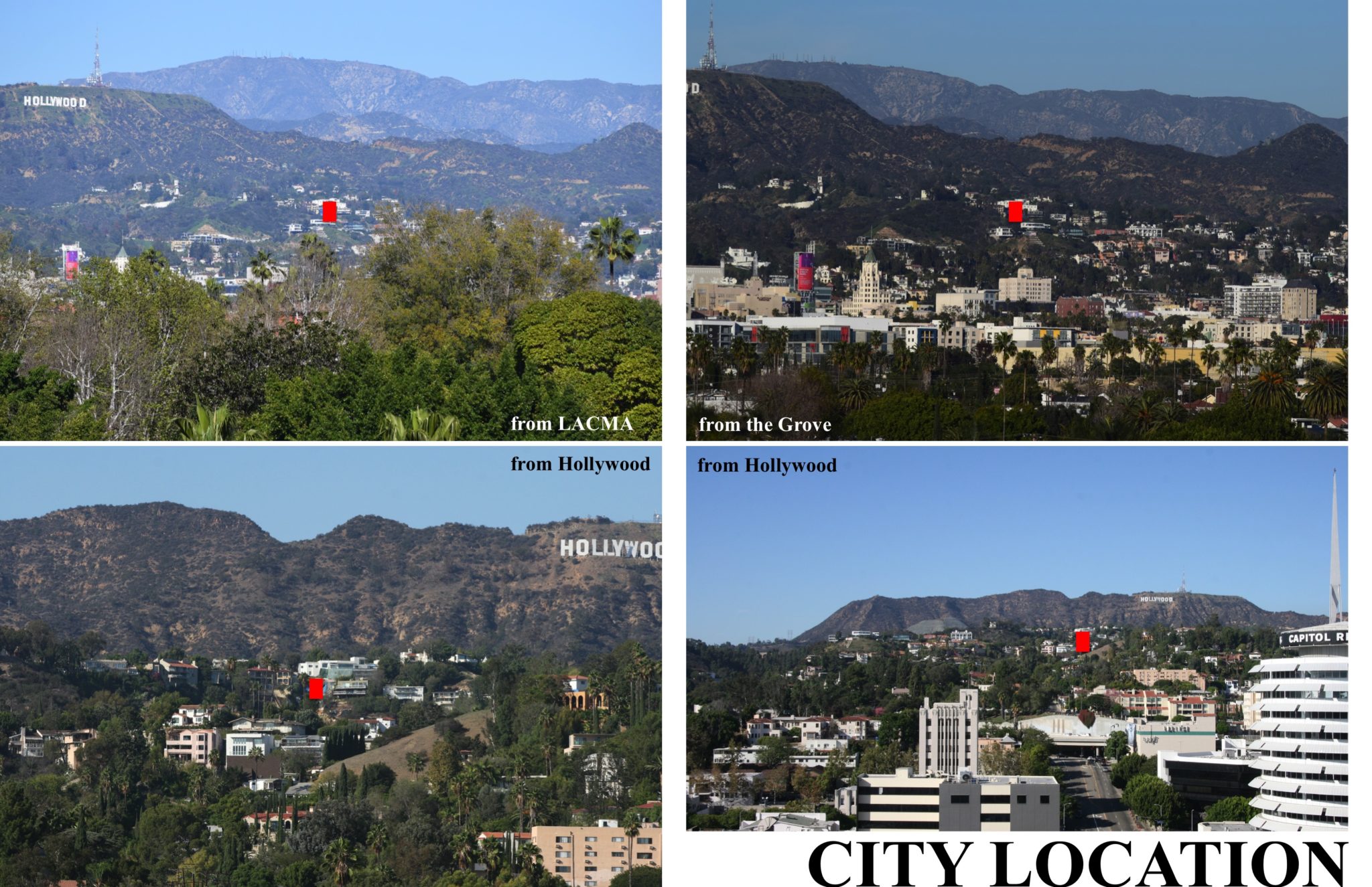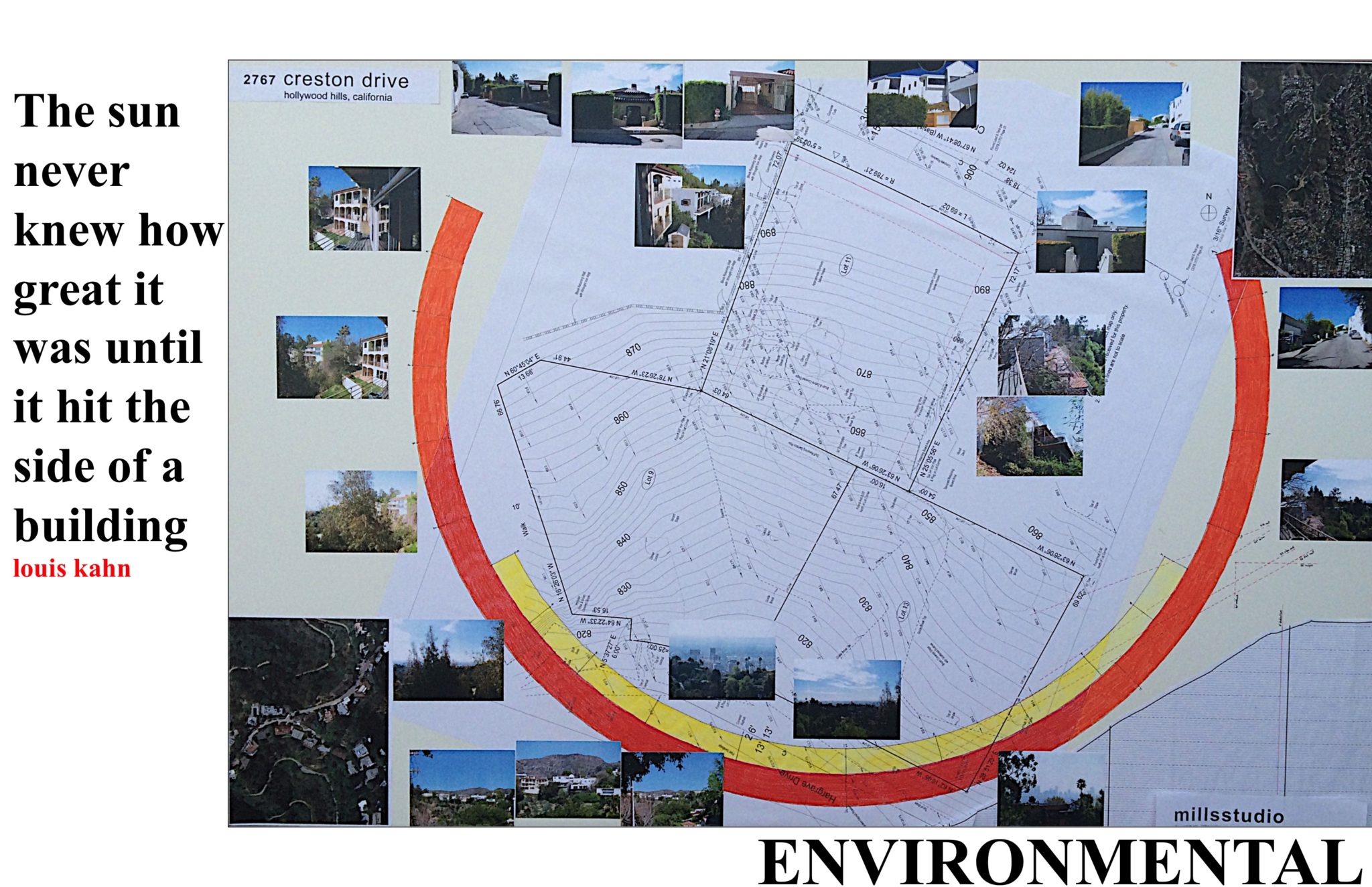 The views of the property from both near and far make the DTS Project House part of a larger physical and metaphorical context. Because of its position relative to the Hollywood Sign, the project is seen from essentially any where in the city that you can see the Hollywood Sign. This provides an opportunity to make a visual and cultural connection to landmarks like Frank Lloyd Wright’s Hollyhock House and the Los Angeles County Museum of Art. Thinking about how the project presents itself visually to the city affects thinking about an Iconic roof shape, a profile against the hillside, and nighttime lighting. Attempting to make a cultural connection to the city hopefully inspires the design to live up to the innovation and excellence of the architects and artists building and creating in the city.