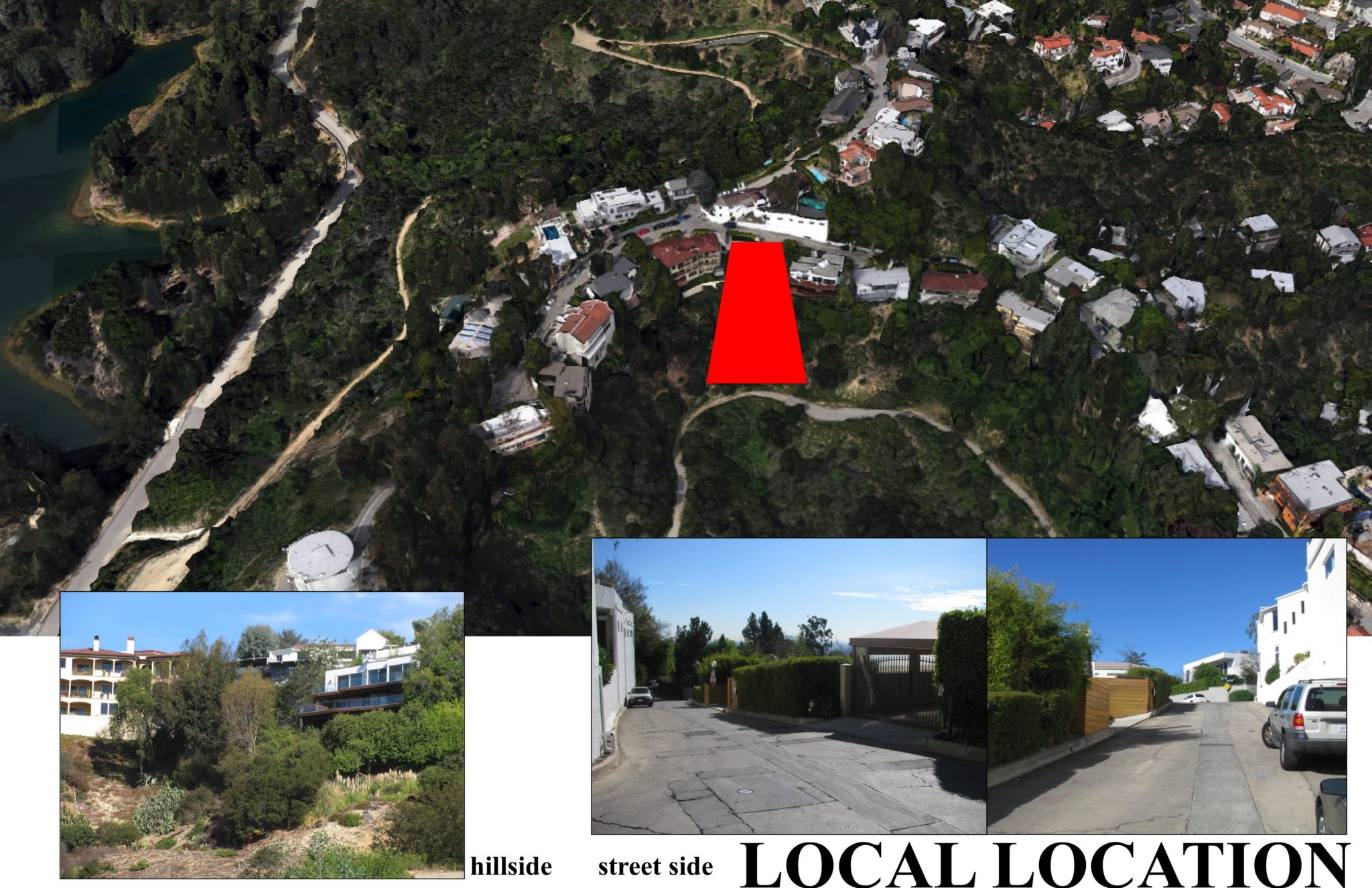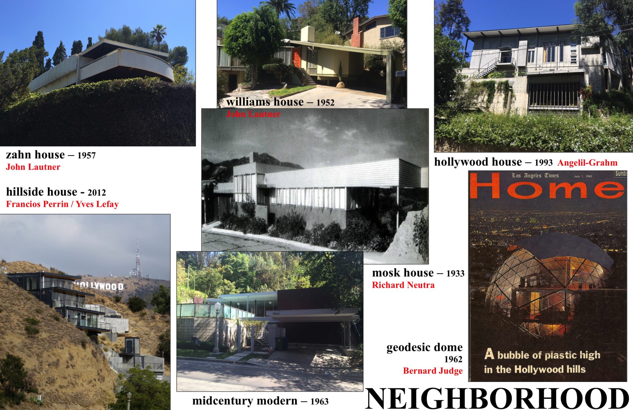 The site’s immediate neighborhood has a tradition of Modern Architecture and experimental structures. Richard Neutra’s Mosk House of 1933 and John Lautner’s Williams House of 1952 and Zahn House of 1957 are examples of Modern Architecture by two of its most celebrated practitioners. John Lautner also completed an addition to the Beachwood Market in 1954 and combined his modern tradition with the Norman inspired castle, Wolf’s Lair originally built in 1928. Architect Bernard Judge may have built the neighborhood’s most experimental structure beginning the construction of his Geodesic Dome in 1960 and completing it in 1962. The goal was similar to other architects and programs of the day: develop a construction system for economical housing with the use of the most current technology. Judge called his Hollywood Hills home the “Triponent House” as an expression of what he though were the three elements that made up the experimental structure: the envelope, the utility core, and the interior spaces. The envelope was a mylar and photo-electric cell covered 50’ diameter dome. All of the utilities such as the kitchen and bathrooms and the mechanical and electrical systems were placed in a prefabricated utility core. The interior spaces were an open framework for individual Owners to divide and design for themselves. Judge was awarded a patent for his innovative structural system and the geodesic framework has been moved to the Smithsonian Institution in Washington, D.C. What new houses were built in the 70’s and 80’s rarely exceeded generic boxes, sometimes with hints of mid century modern architecture. A nostalgia for the original styles of the past, a growing interest in preservation, and the passage of progressively more restrictive codes and planning requirements were among the factors that discouraged architectural innovation. Architects Mark Angelil and Sarah Grahm’s own house of 1993 and Francois Perrin and Yves Lefay’s multistory house of 2012 are two examples of attempts to reignite the neighborhood’s tradition of architectural innovation.