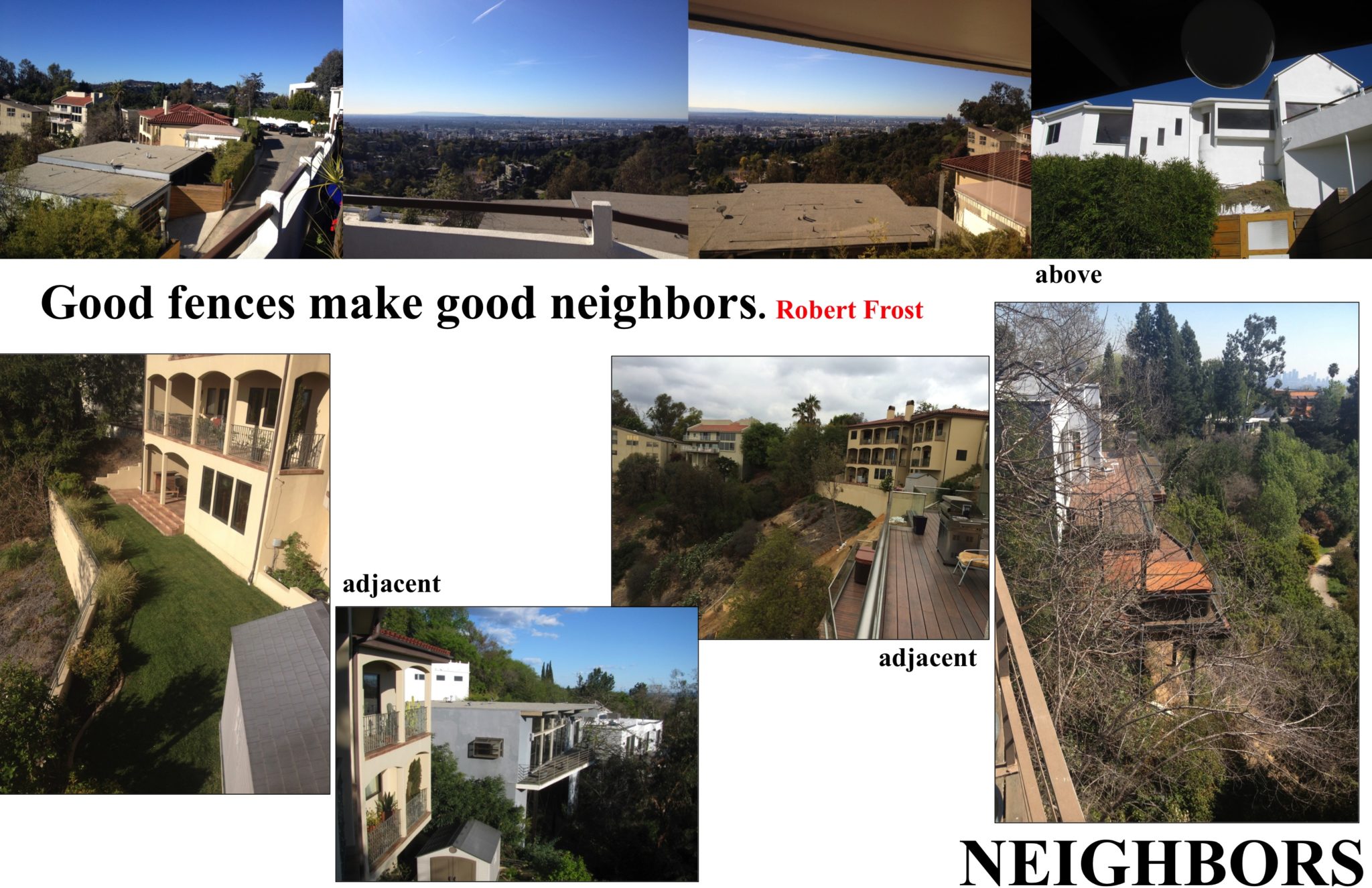 Living in the hills is often a balance of competing interests: desire for physical and psychological seclusion while simultaneously being part of a neighborhood with neighbors. The proximity of neighbors above and below and the closeness of neighbors on the immediate sides of the property makes privacy screening a concern that leads to specific approaches to positioning on the site in plan and elevation, positioning of elements like the pool, and landscaping, and leads to specific architectural elements like rock filled gabions and automated screening. The design addresses a desire to both physically and psychologically block views of the neighbors and an ability to alternatively open up or stay hidden from neighbors as desired and as daytime turns into nighttime.