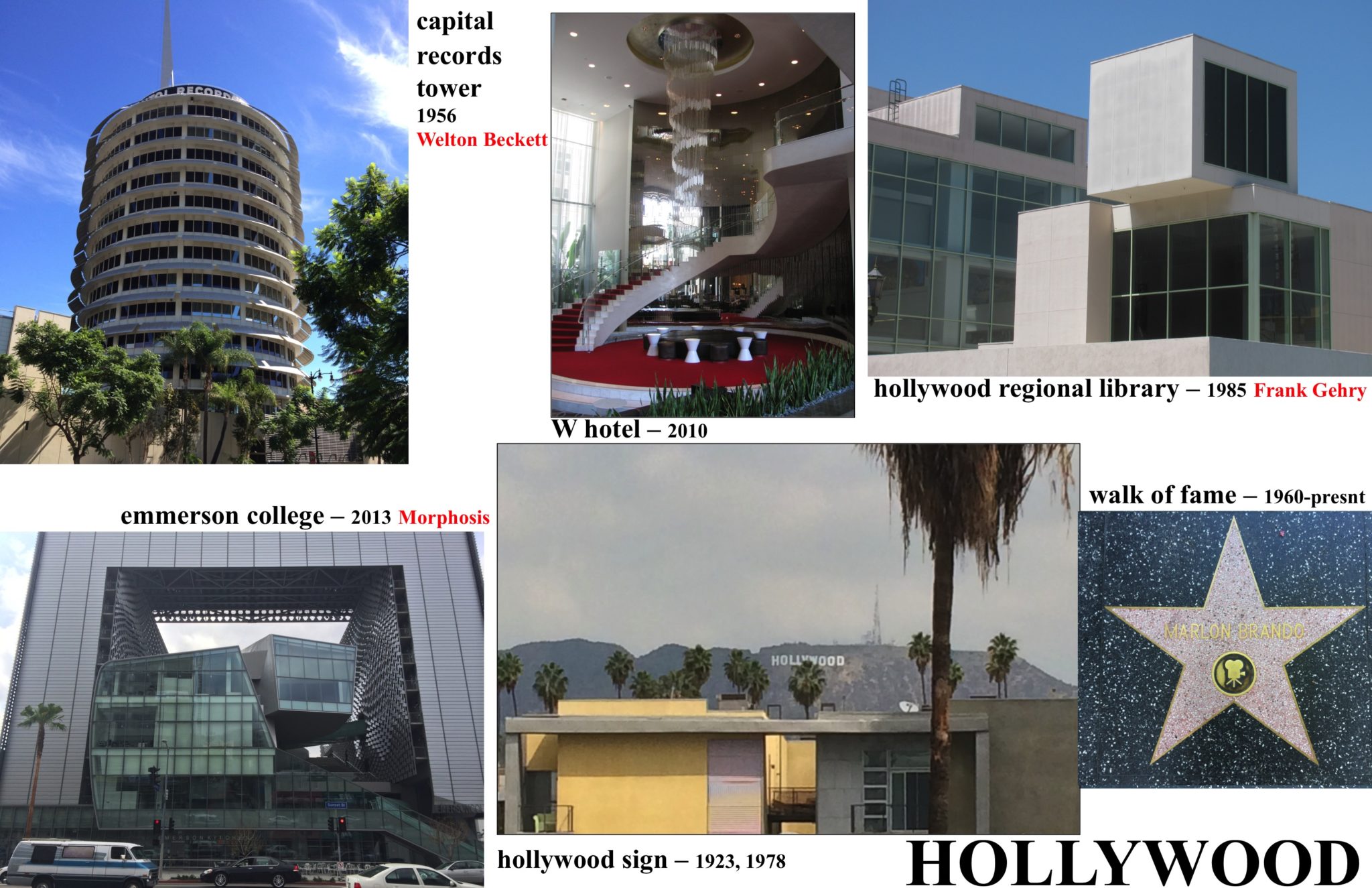 One of the buildings that best captures the “drama” of Hollywood is the firm Welton Becket’s 13 story Capital Records Building of 1956. It was one of the world’s first circular highrises and many thought that the combination of its circular, wide awnings projecting at each floor and the tall spike projecting through the roof, alluded to a stack of records sitting on a turntable. Whether true or not, the architecture was used to brand the company, especially as the first on the west coast. The 1985 Hollywood Regional Library by Frank Gehry was a fresh take on what a library should feel like, a dark, musty formal place or as Gehry proposed, an informal, light filled space connected to the California sunshine. One of the newest architectural additions to Hollywood, Morphosis’ 2013 Emerson College, loosely mirrors the architectural concept of the DTS Project House: a set of “precious” inner glass volumes protected by a “tough” outer skin.
