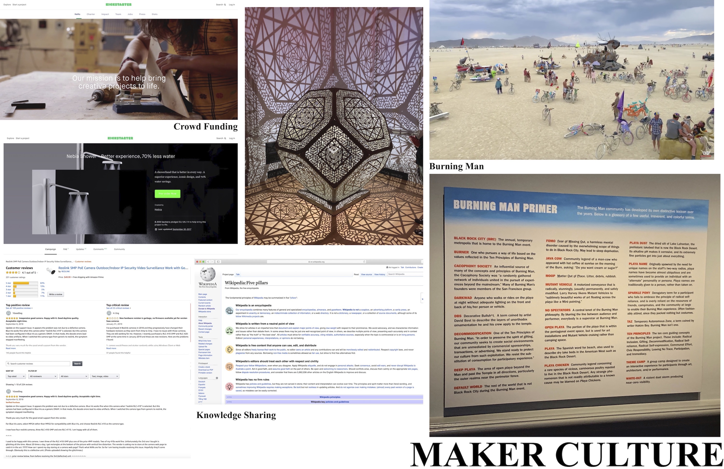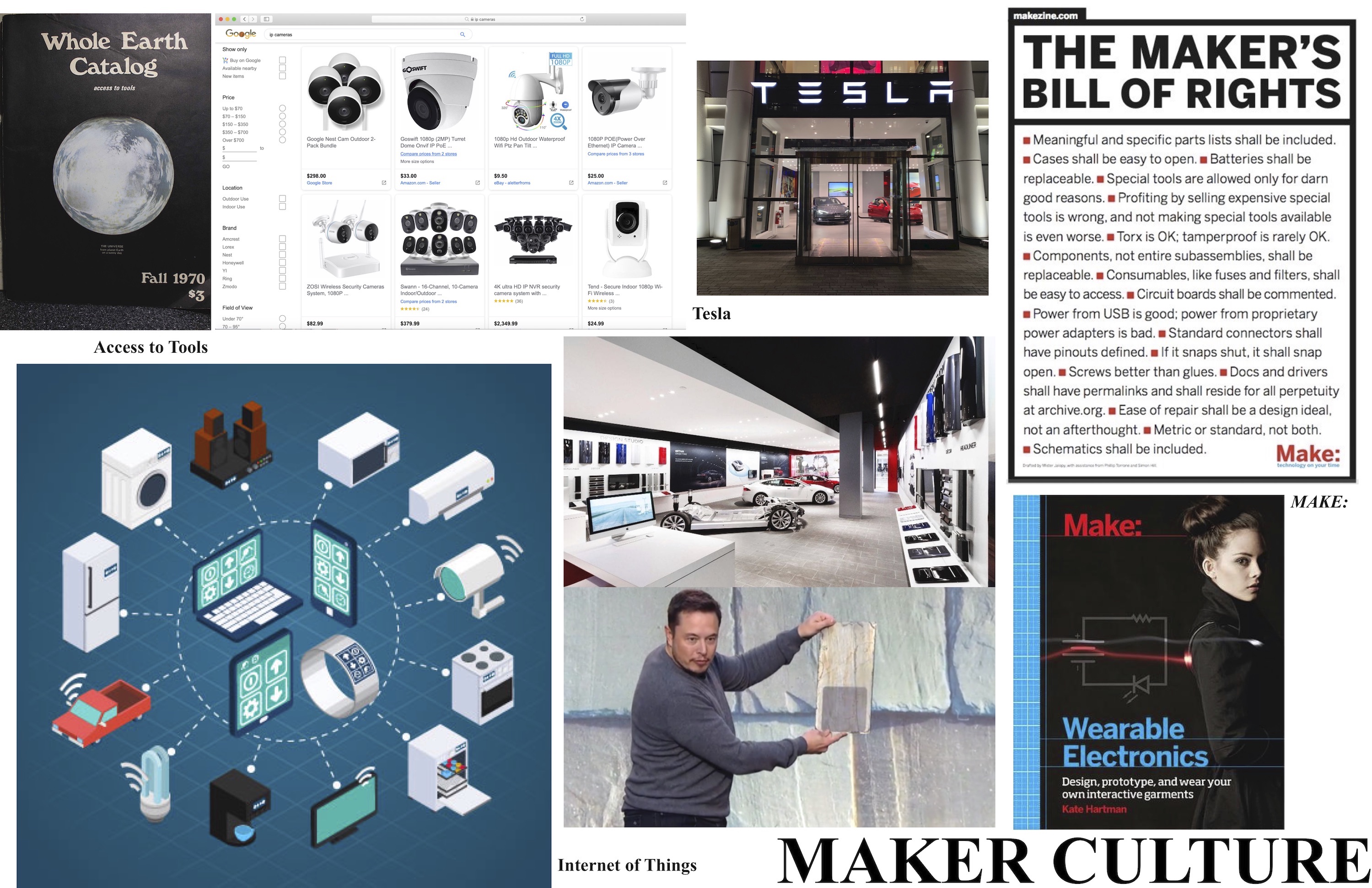 Maker Culture is an extension of DIY culture that stresses technology as a tool of personal growth and liberation. Maker Culture grew out of a California design ethos, what Justin McQuirk has labeled “Designed in California”, commencing in the 1960’s. This “designed in California” ethos stresses applications of technology and intersections between traditionally separate domains. Stuart Brand’s Whole Earth Catalog, the personal computer (especially Apple), and amazon.com, are among the manifestations of Makers belief that tools, in the broadest definition of tool, should be readily available and accessible to individuals to use – often to use in ways never foreseen or intended by their creators. Makers treat networking as a tool that allows them to share in the experience, skills, and knowledge of the community – a version of the “wisdom of the crowd.” The appeal and usefulness of Customer Reviews from sites like Amazon to Yelp, is an expression of the attitude that peers offer as much useful knowledge as so called experts. This emphasis on communal input has led to knowledge sharing platforms such as Wikipedia, crowd funding platforms such as Kick Starter, and shared collaboration platforms like cloud computing. Cloud computing has converged with sensor and embedded technologies to make the Internet of Things (IoT) a reality.