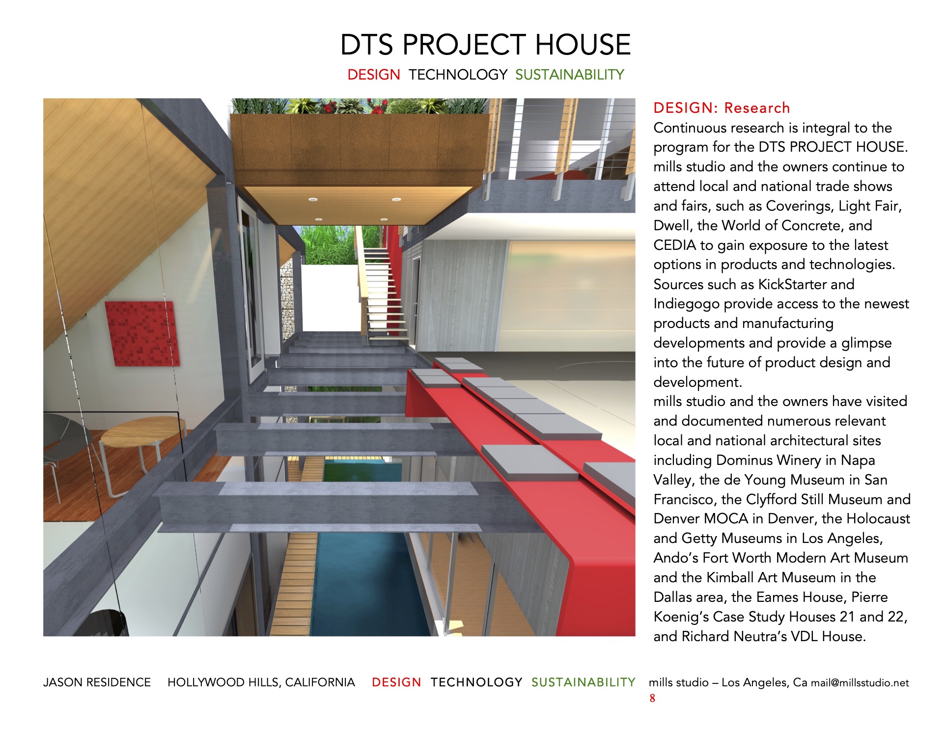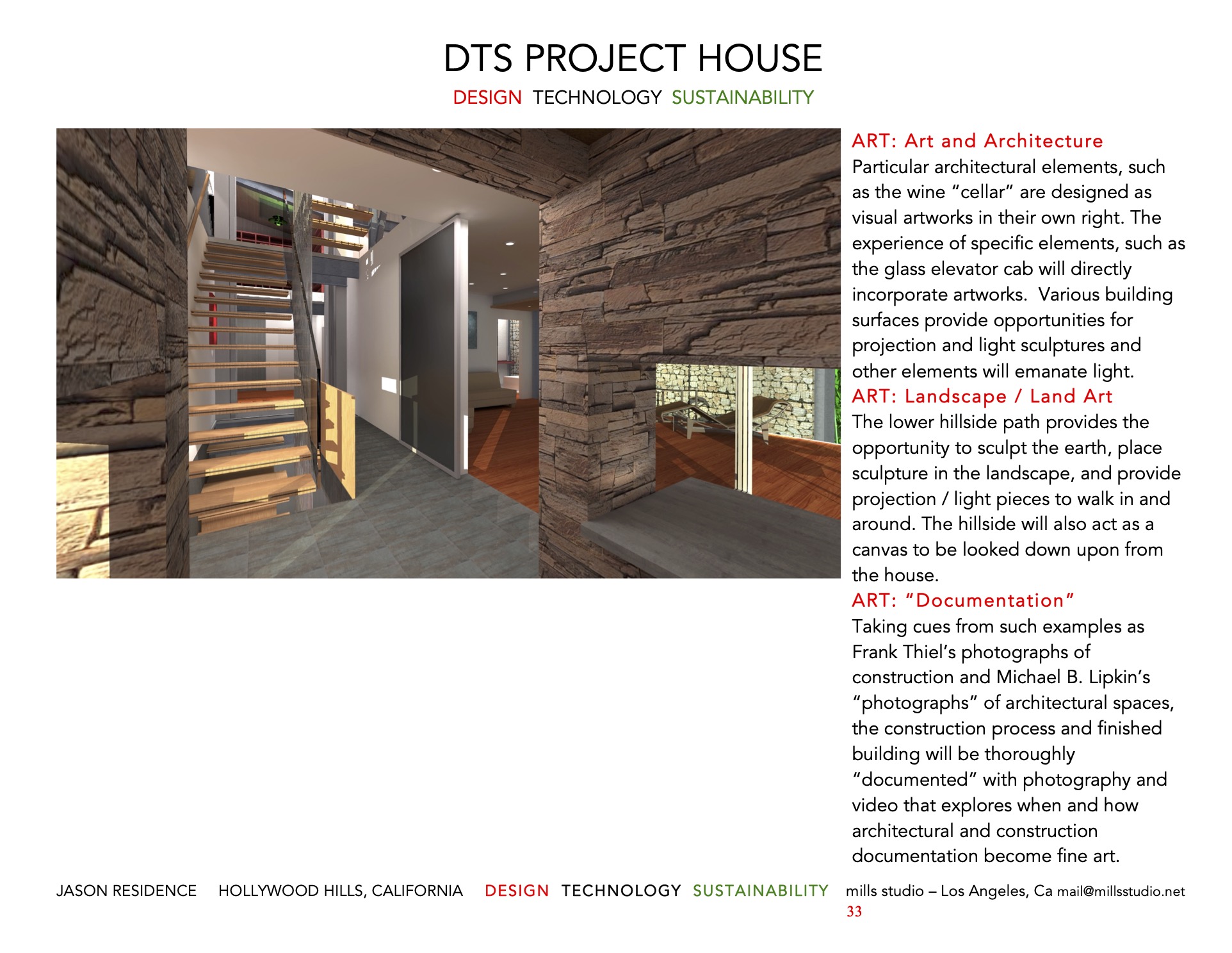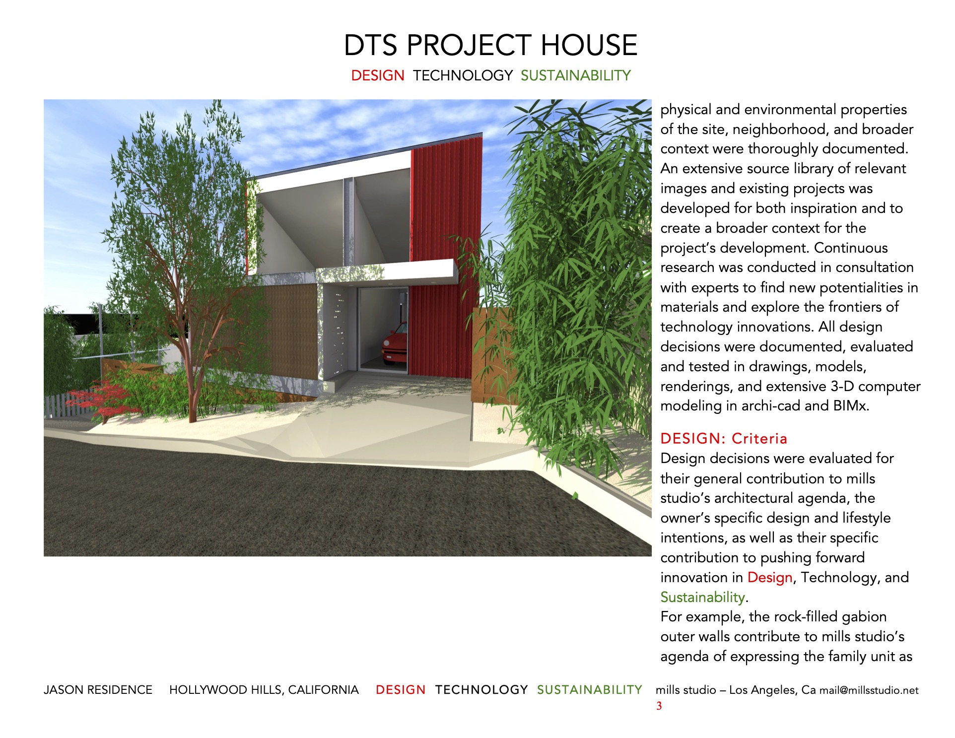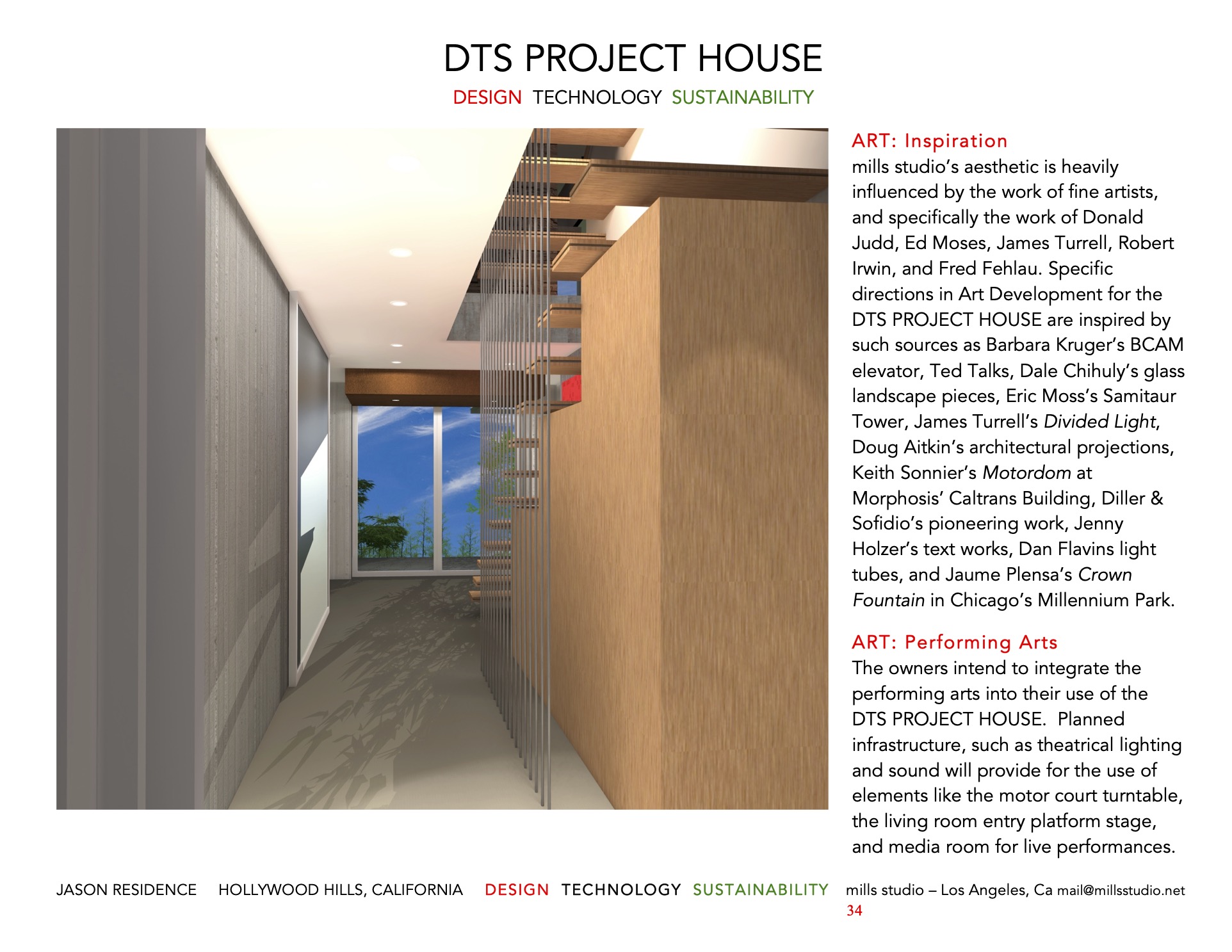 As part of the Schematic Design Phase, a Project Narrative was prepared to tell the story of the DTS Project House. The Narrative attempts to delineate the Owners’ and mills studio’s intentions for the project and the effort required to express those intentions. The Narrative attempts to reveal the people, works, and ideas that inspire and inform the DTS Project House and attempts to show the discipline and holistic approach required to create the DTS Project House. The Narrative attempts to covey that communicating and making tangible the primal importance of the institution of the family is what makes the single family residence as significant a work of architectural art as any other building type.