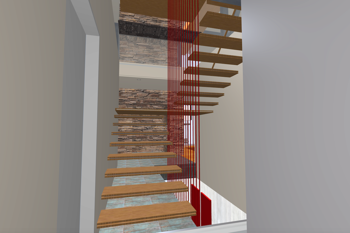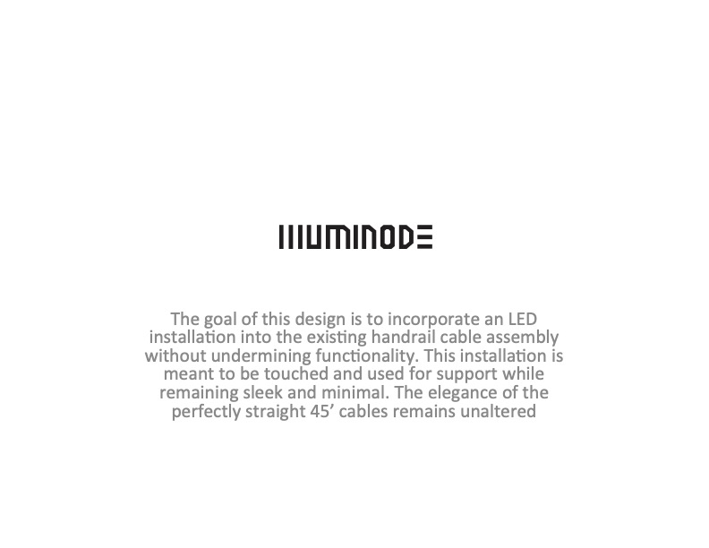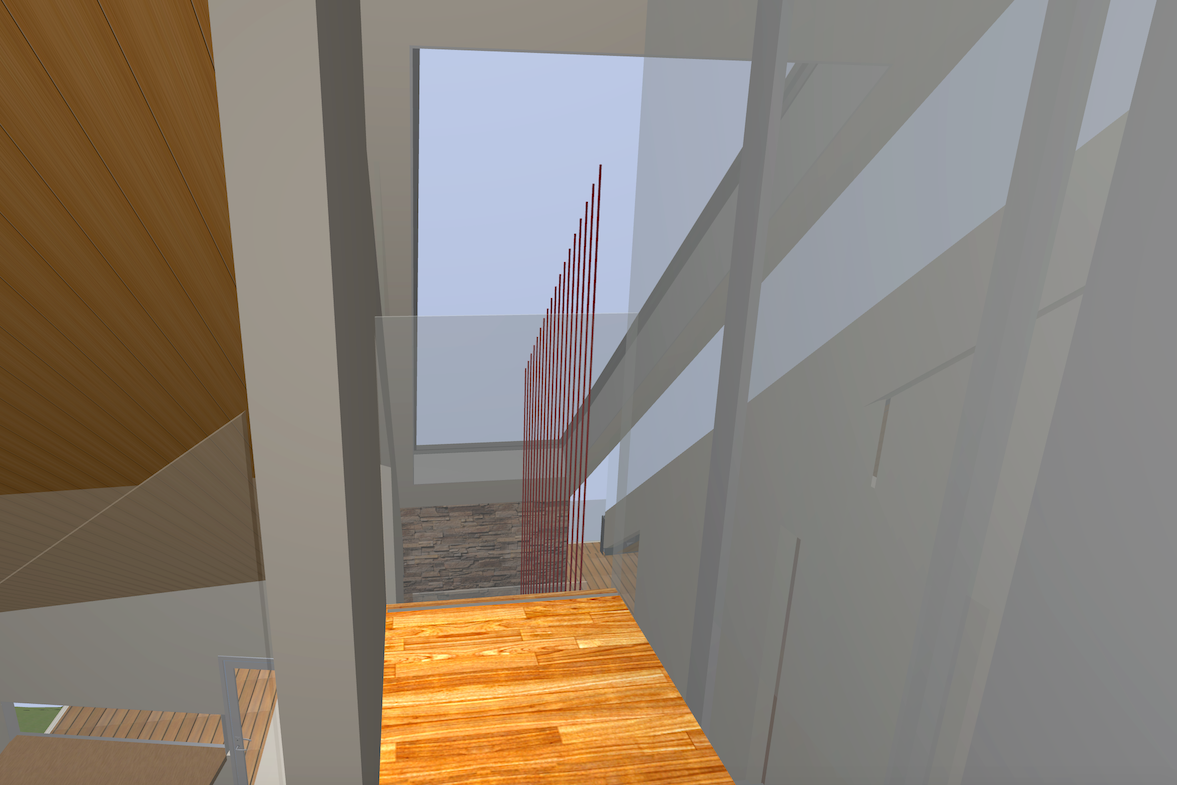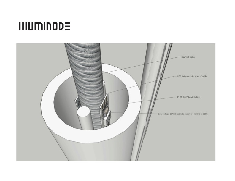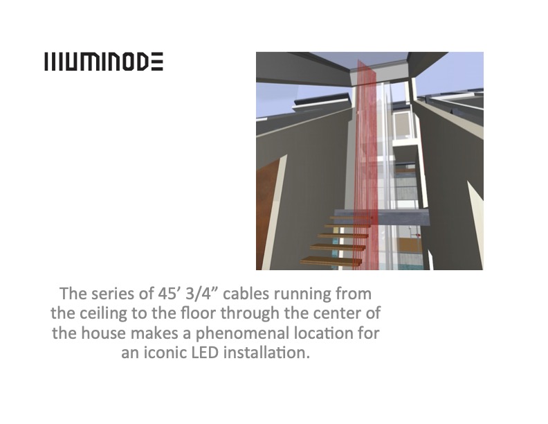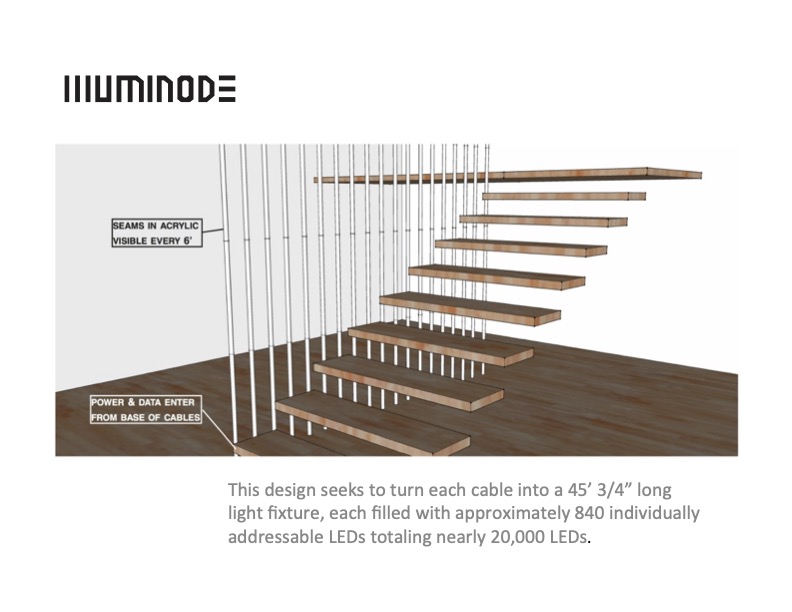 mills studio and the Owners engaged several light artists / fabricators / technologists to look at potential artistic / technological development of various locations in the DTS Project House, including the five story Central Stair. Illuminode of Los Angeles, with artist Mads Christensen among their team members, envisioned attaching continuous ground to roof LED light strips to the vertical stainless-steel cables in the narrow gap between stair runs and encasing the lights and cables with round white acrylic tubing. Illuminode labeled their vision for the Central Stair as “Focal Chords.” These initial thoughts of possibilities spurred mills studio and the Owners to think in further detail and more expansively about how to integrate functional and artistic intentions in a Central Stair art piece, and thought “Focal Chords” captured the appropriate notion of how the Central Stair should be developed as an art piece.