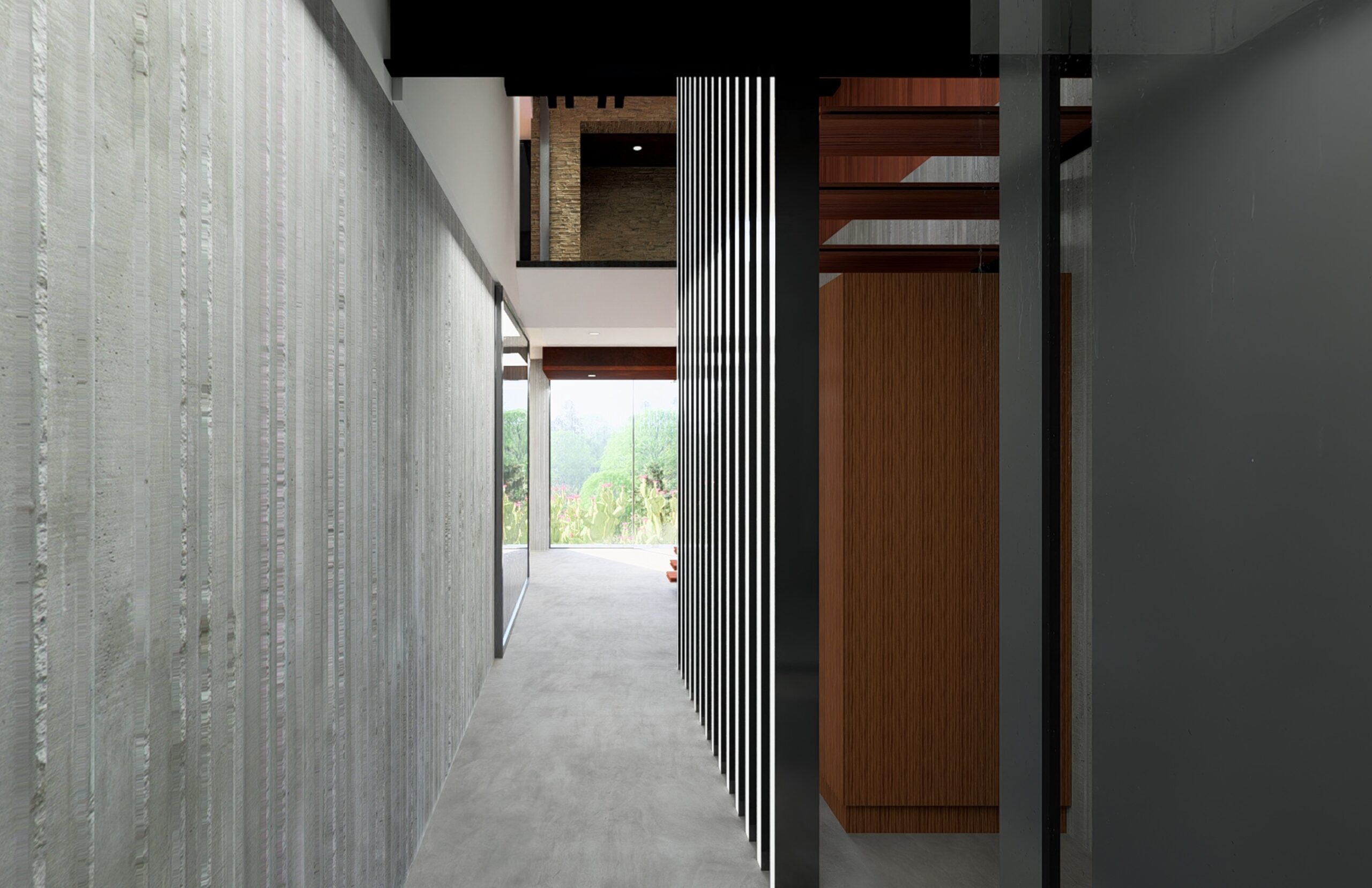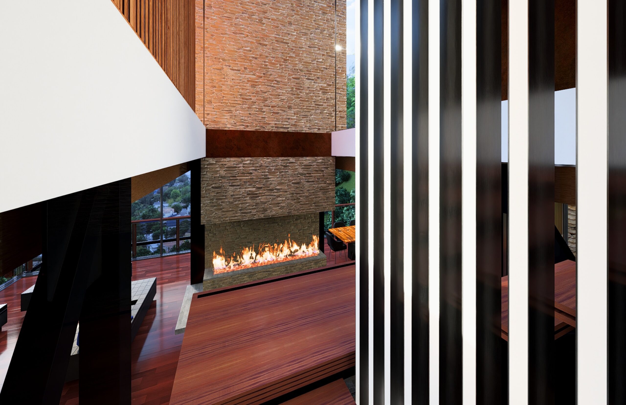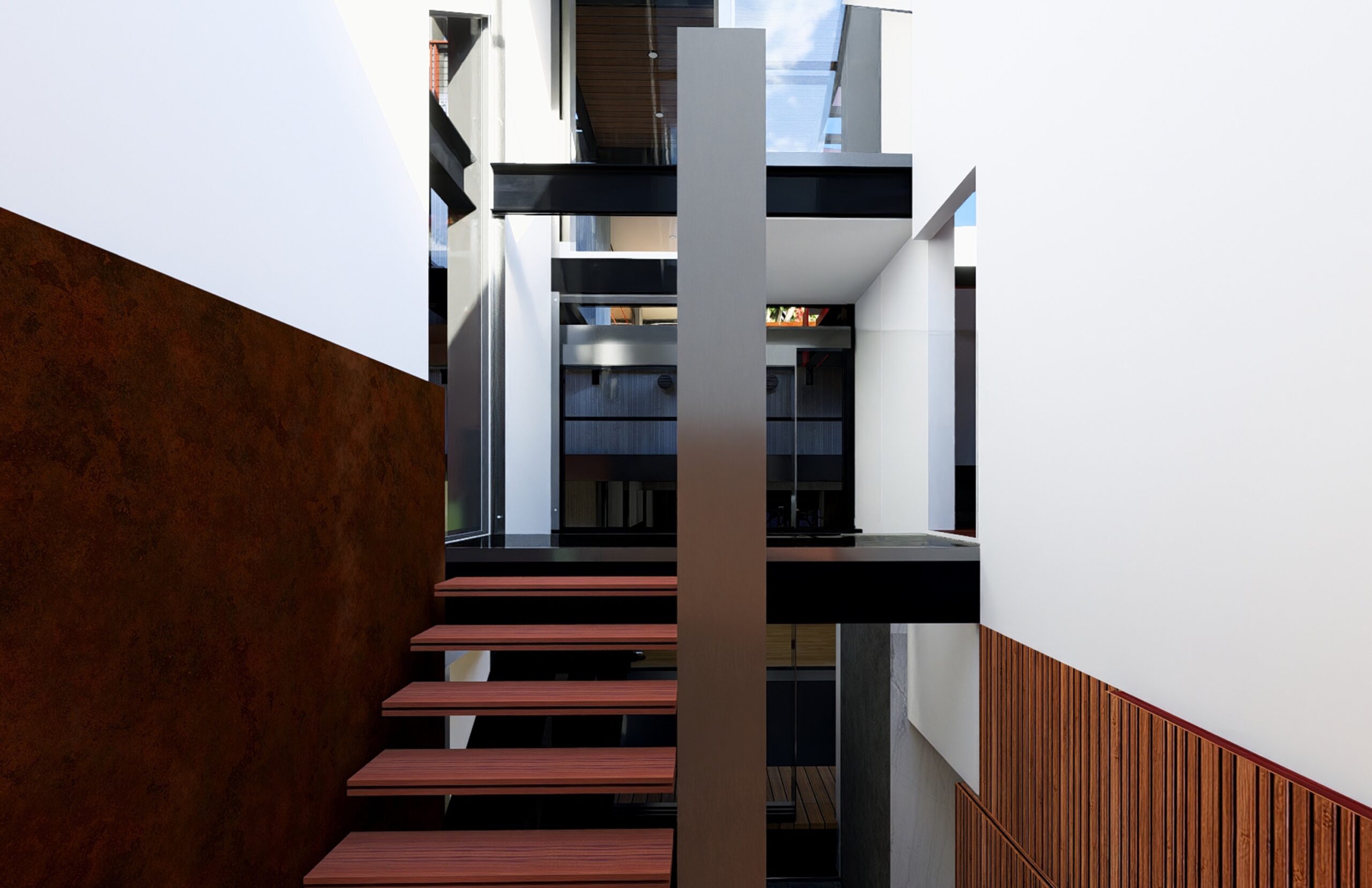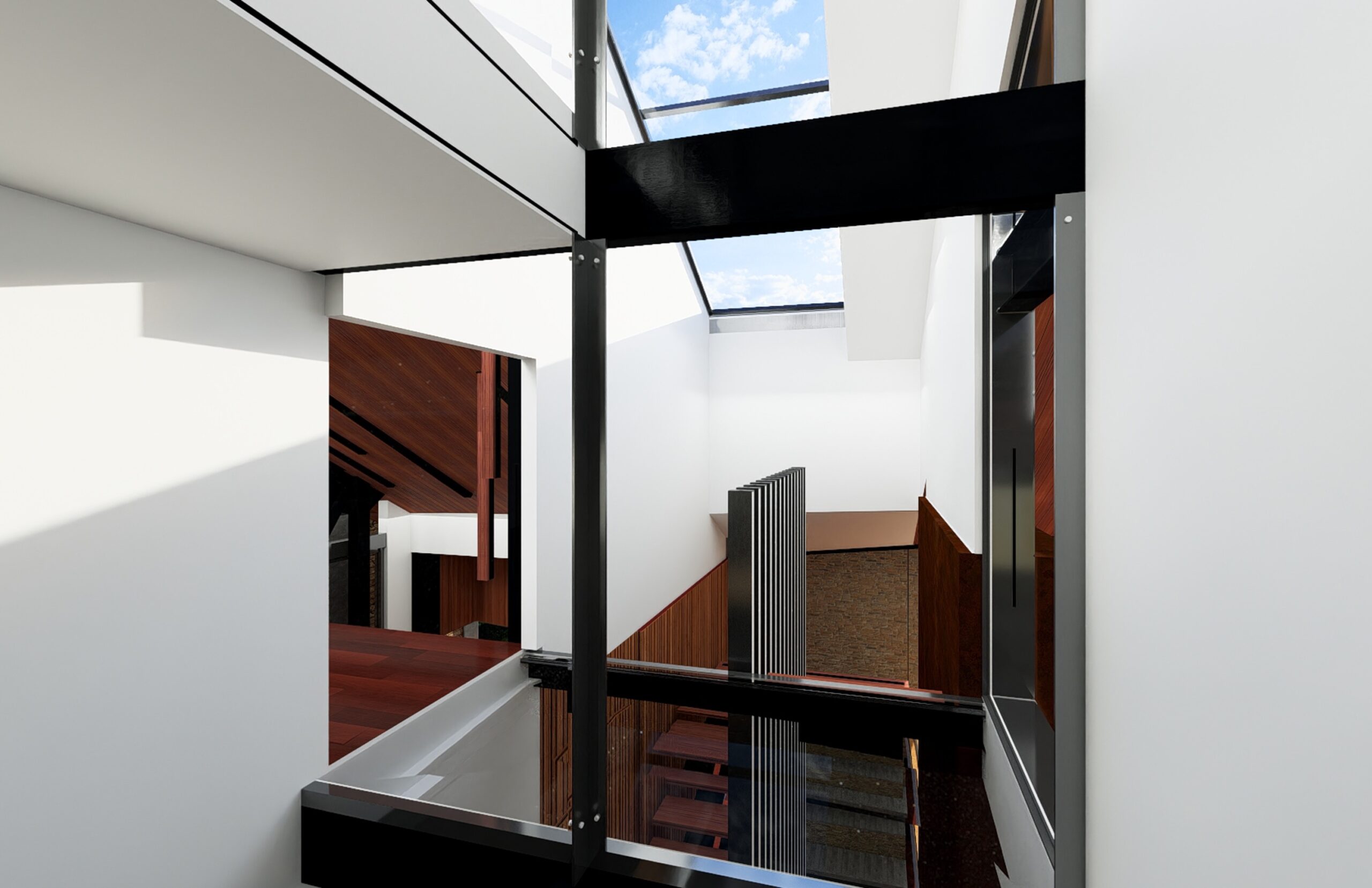The Central Stair is a vertical spatial and visual element physically connecting the various horizontal levels of the DTS Project House. The Central Stair acts as the building’s connective tissue in both plan and elevation connecting the earthen hillside to the sky. The Central Stair provides for circulation but is also itself a space with varying degrees of enclosure at different levels and changing enclosure with the deployment of scrims at its perimeter on certain levels. The Central Stair is inwardly focused with no direct elevational views to the exterior. Peripheral glimpses of diagonal views are intended to create a dynamic circulation experience about up and down. During the daytime, the Central Stair is filled with natural light from its transparent glass skylight and at nighttime this reverses and interior artificial light escapes from the skylight.