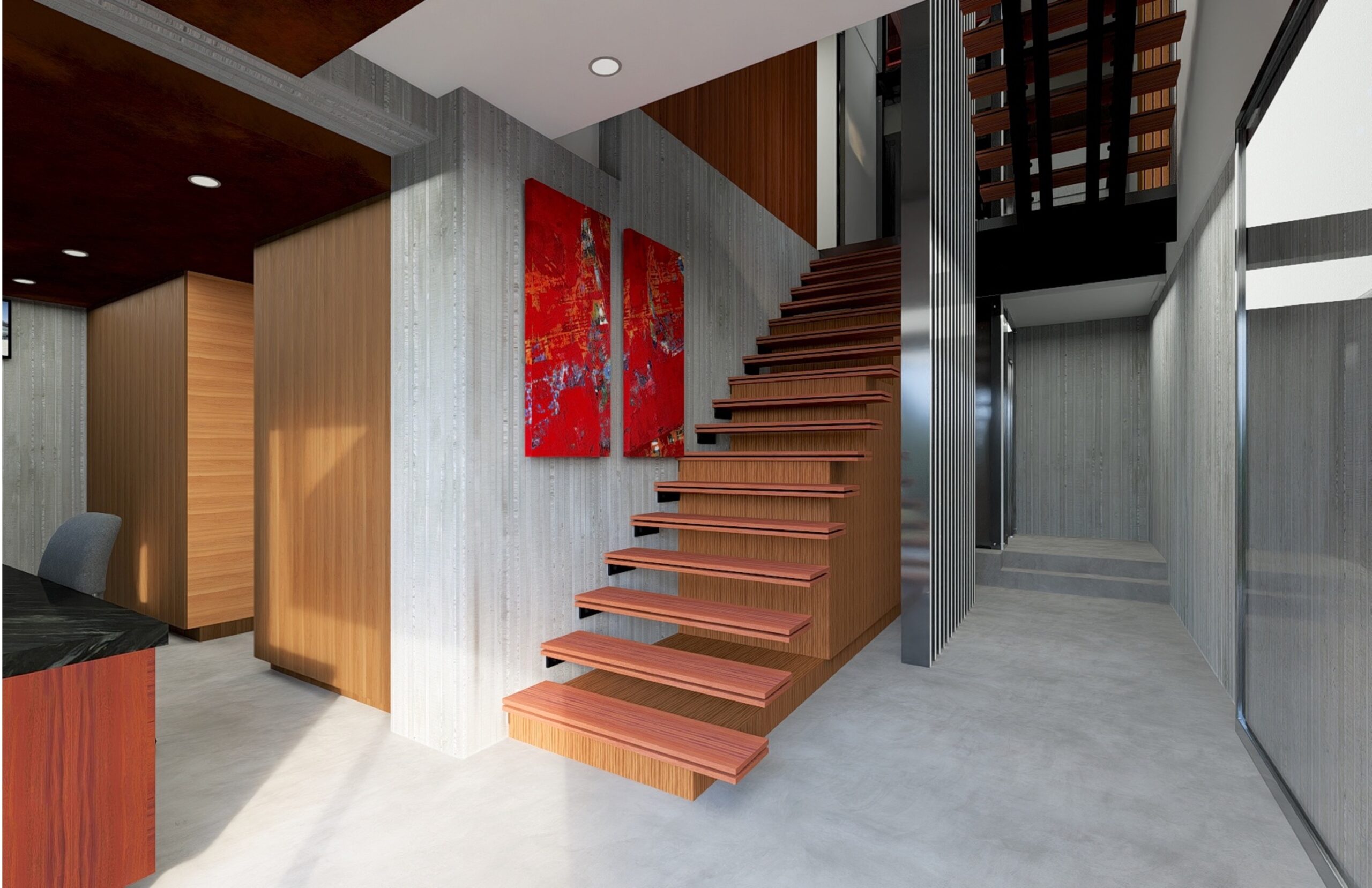 The Central Stair provides the opportunity for a site-specific “artwork(s)” that addresses individual contexts of single levels or multiple levels or the staircase space itself; that accentuates or opposes the stair’s vertical nature and function; provides a presence from both distance and from close enough to touch. Maybe the most interesting opportunity the Central Stair offers to a site-specific installation is using the large-scale operable glass skylight at the top of the stair to make the piece “visible” from the wider community connecting The DTS Project House to Hollywood and Los Angeles. The Central Stair is literally about movement and thus an interactive site-specific piece could use acknowledgement and reaction to human presence as a generative force.