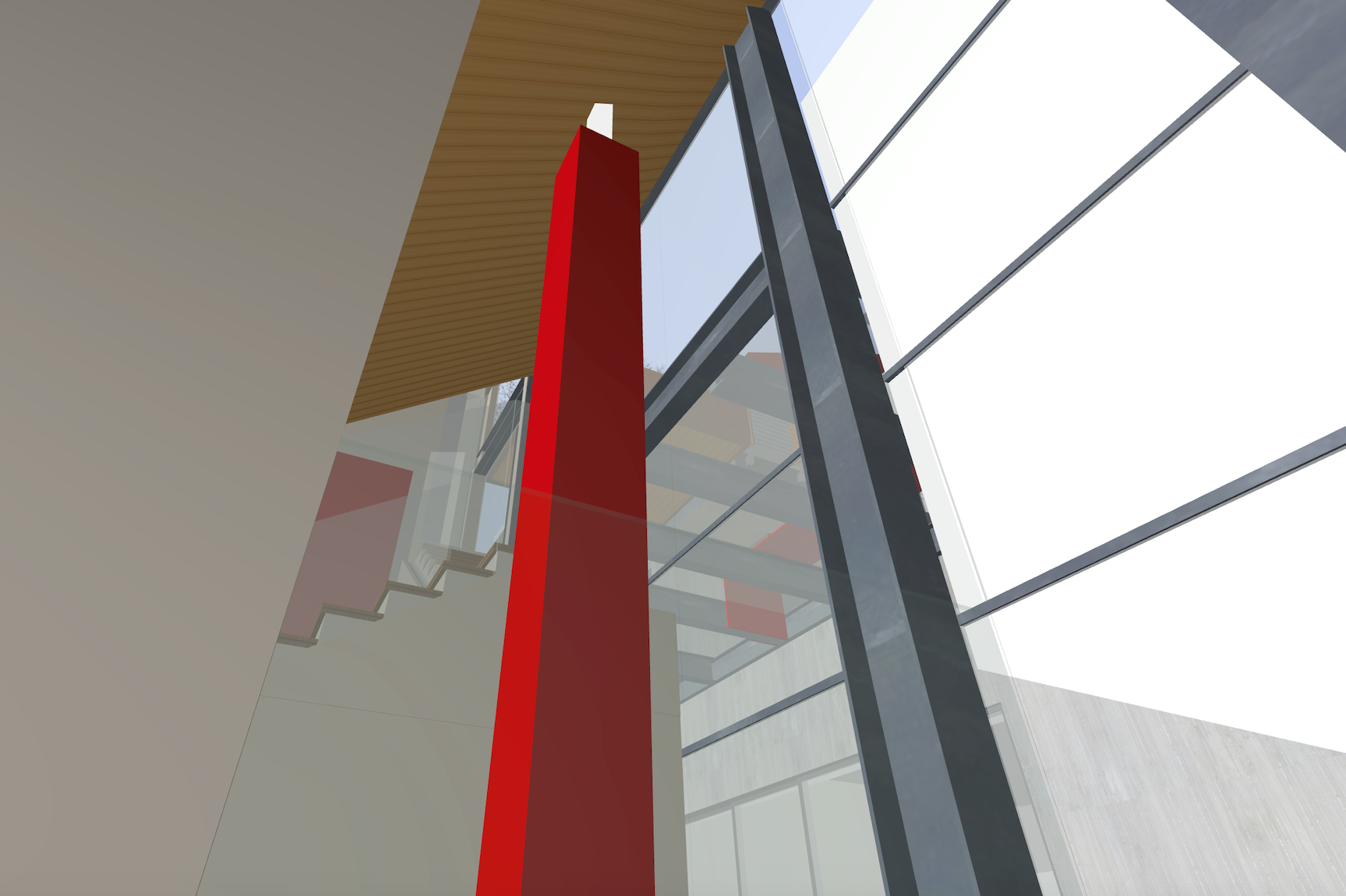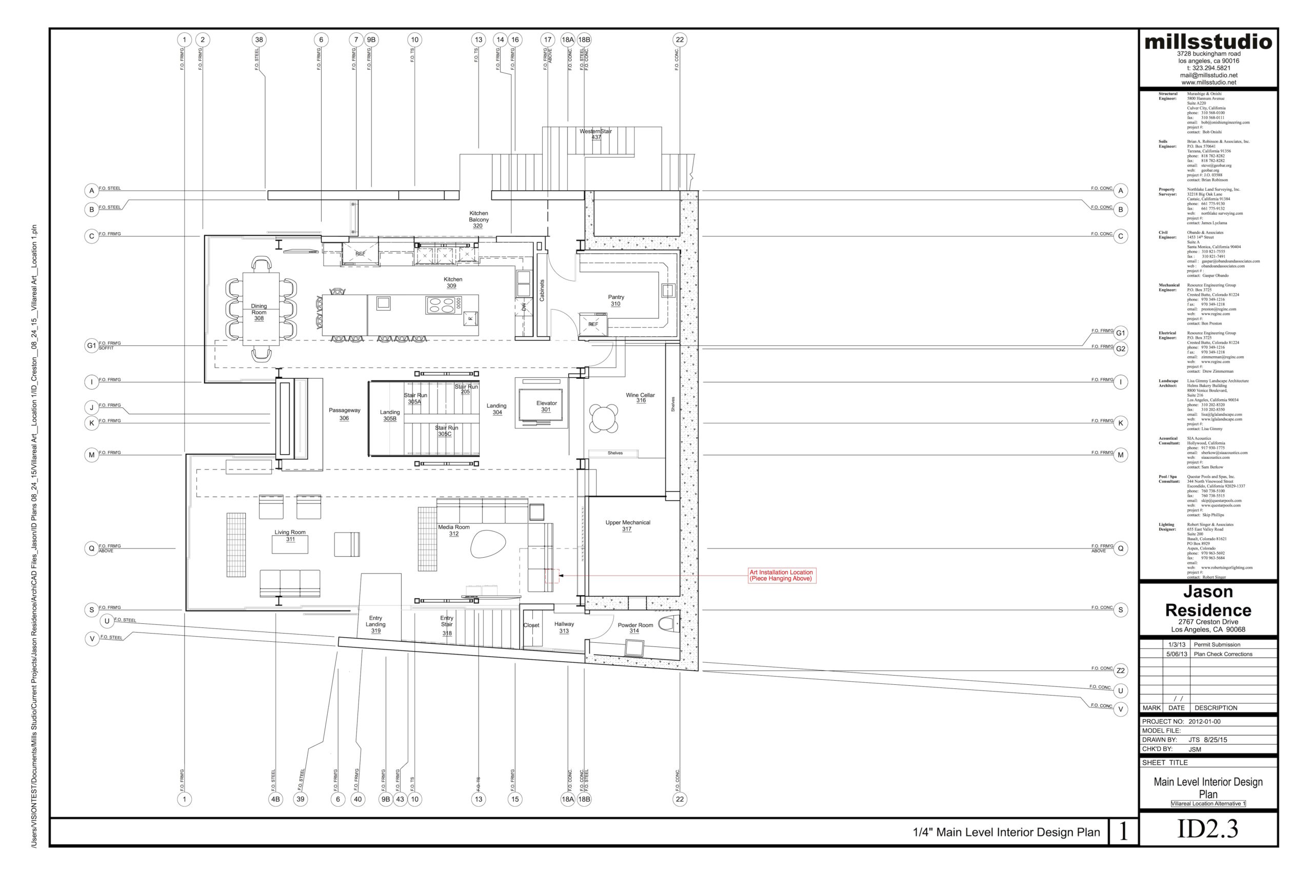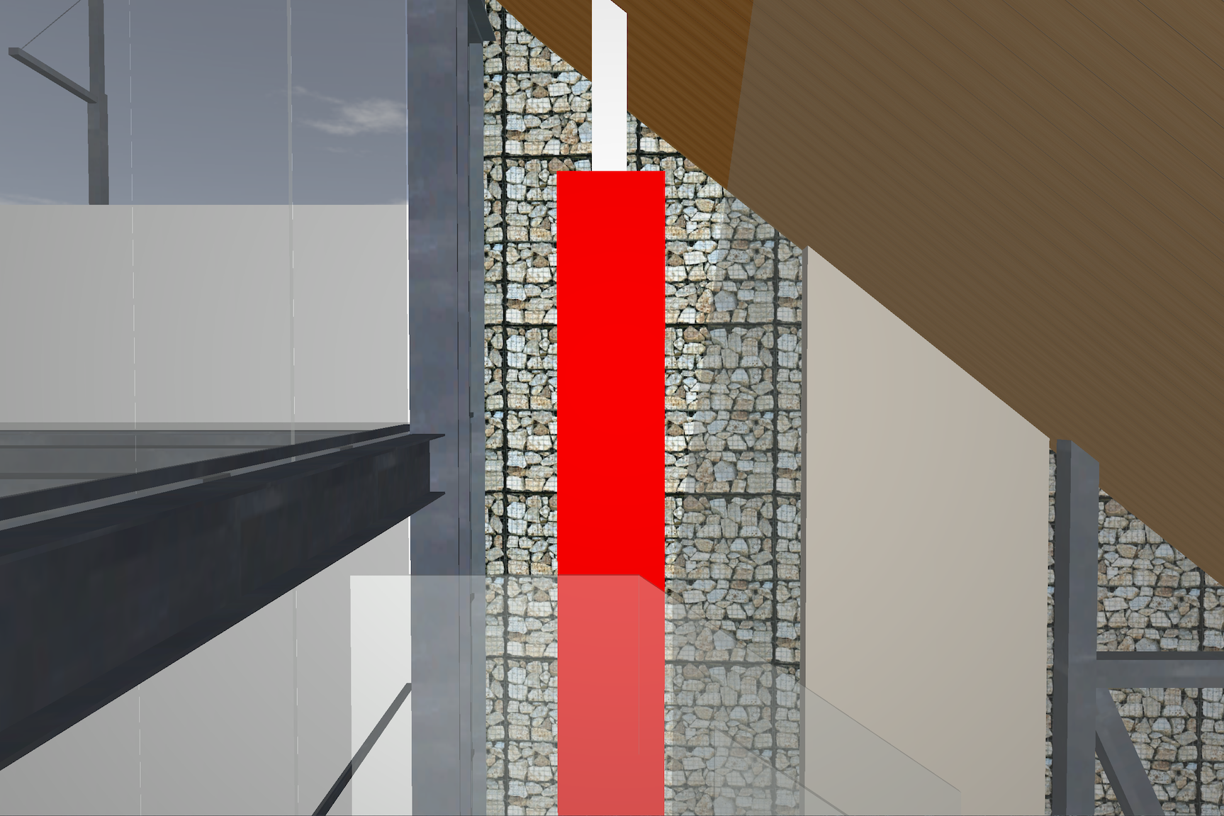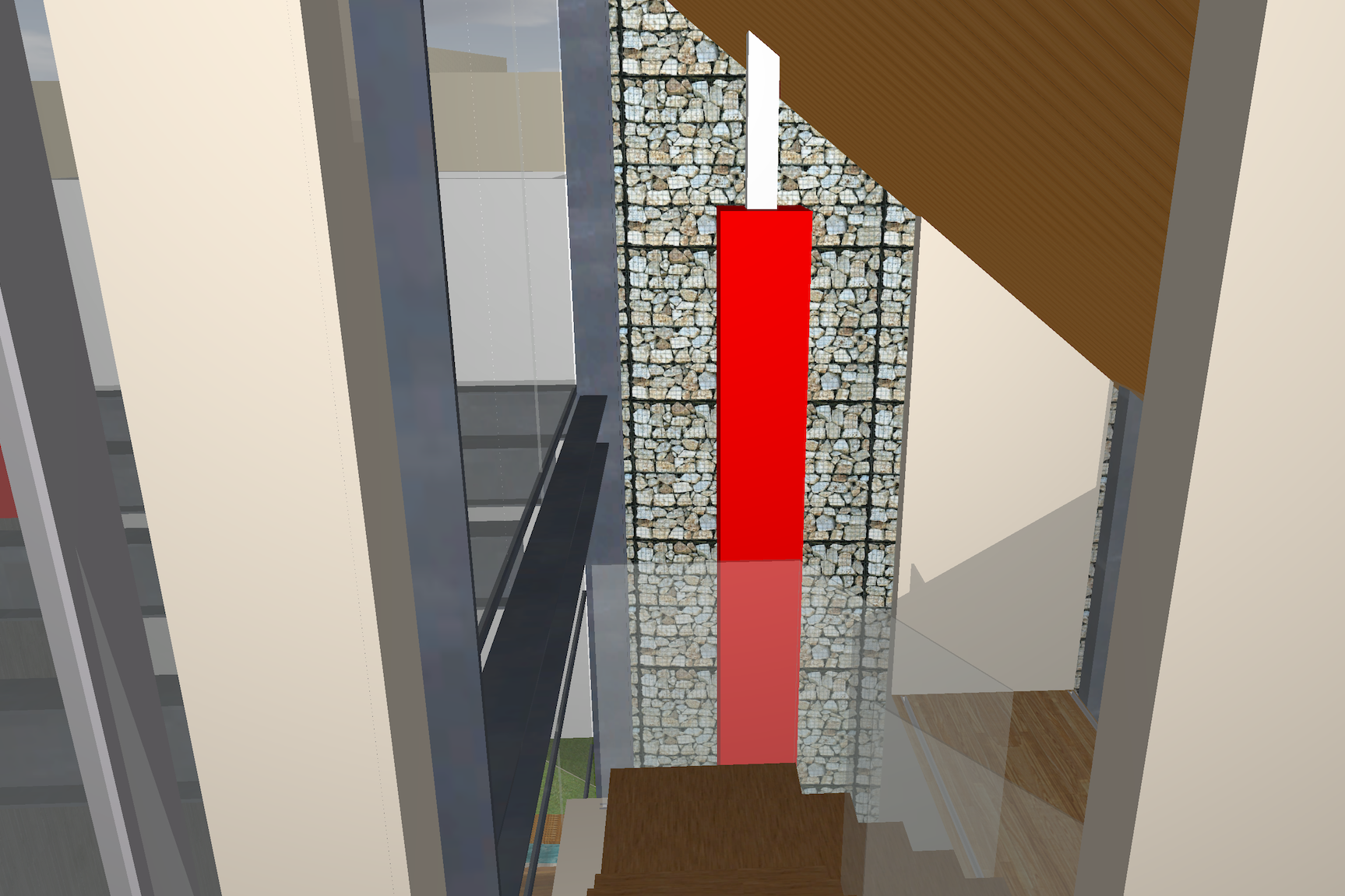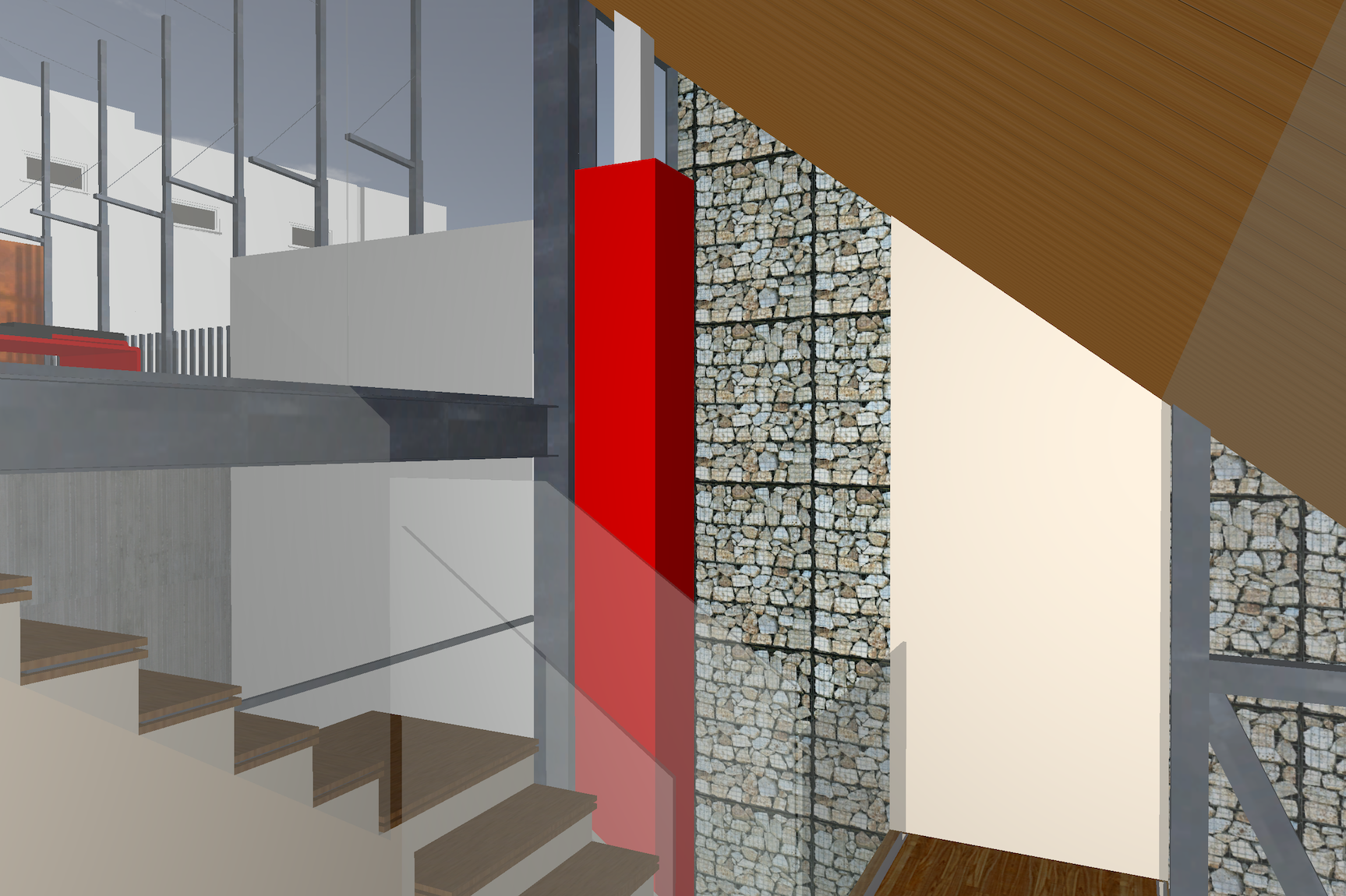 mills studio identified the shaft like location for what artist Mads Christensen dubbed the “Chandelier” because it provided the opportunity for a single object or event to be experienced from many multiple perspectives, especially in elevation. The location is a smallish square space in plan enclosed by different configurations of opaque and transparent and nonexistent surfaces at the various floor levels. The qualities of the space and its enclosing surfaces change depending on the time of day and time of year, such as the existence and quality of the filtered light through the rock filled gabion wall. The enclosed space extends thirty to forty feet in height from the main level floor up past the upper level and intermediate level to the underside of the main sloped roof. The nature of the site-specific piece will determine the actual perceptible height of the “shaft.”