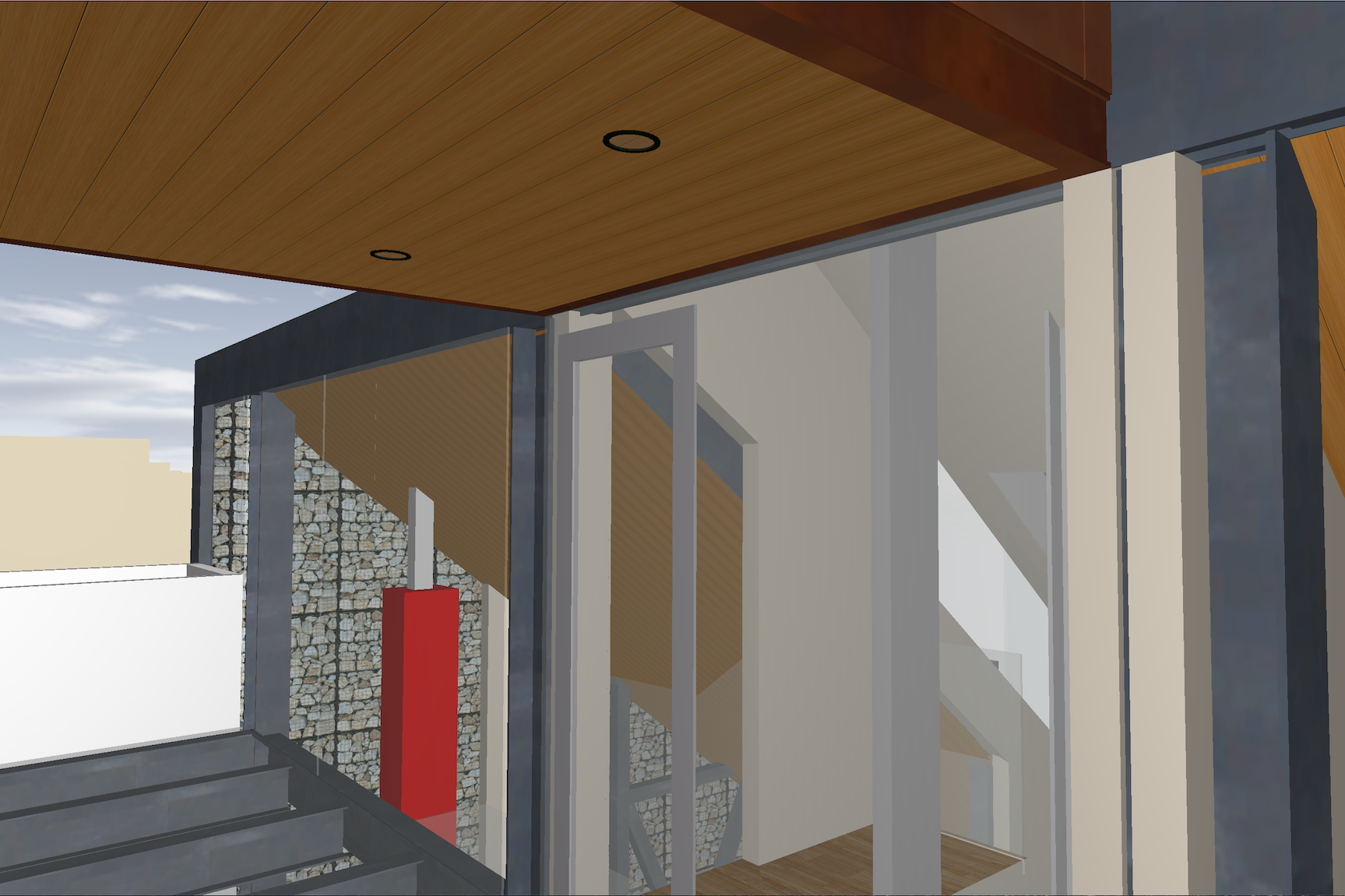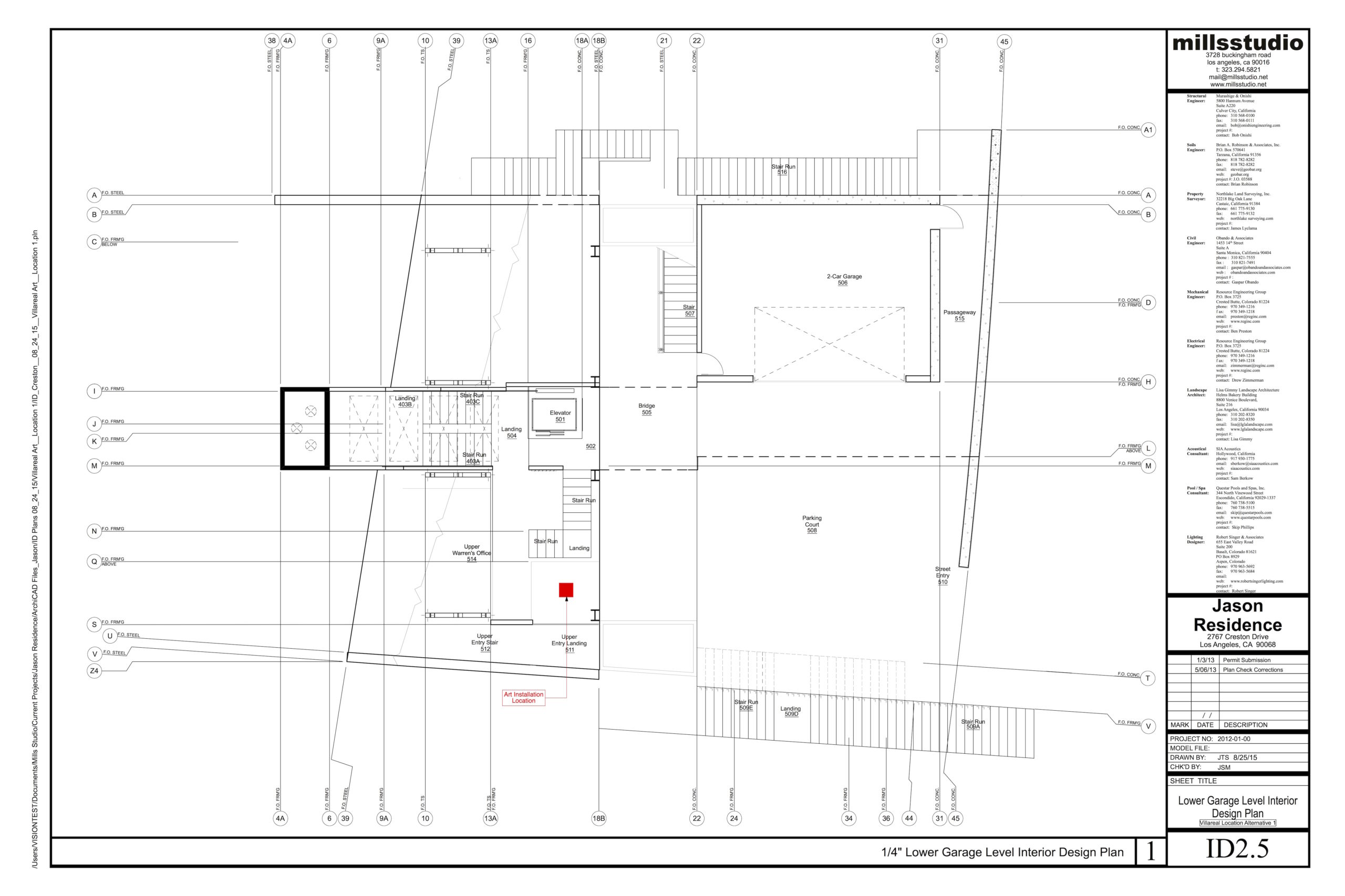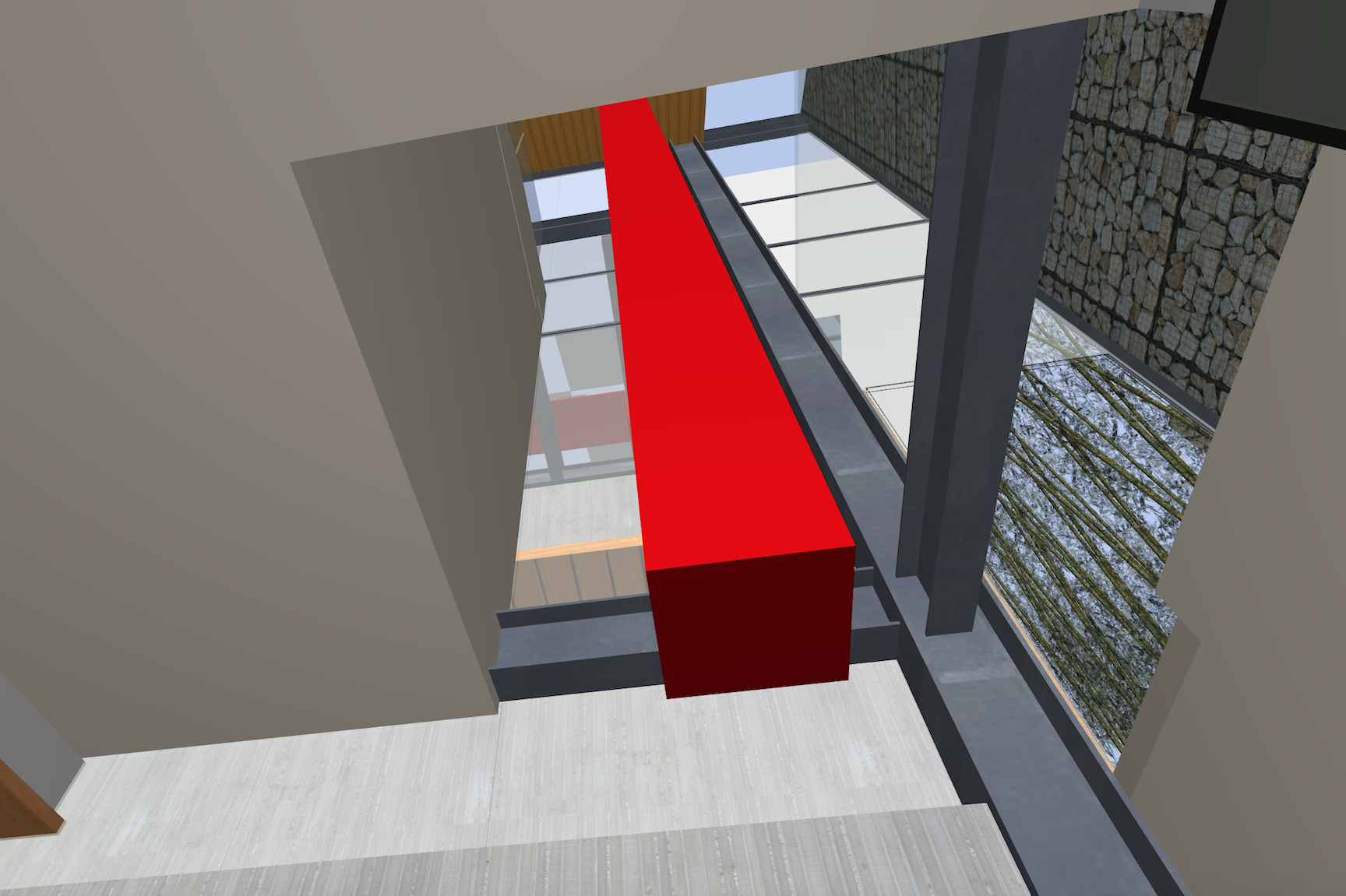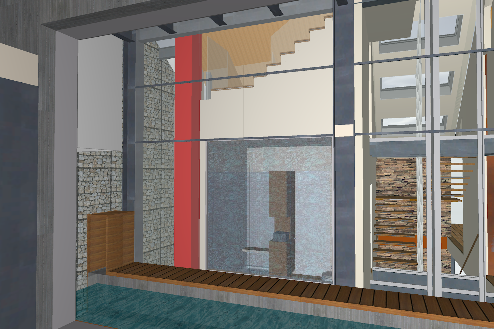 mills studio identified the shaft like location for what artist Mads Christensen dubbed the “Chandelier” because it provided the opportunity for a single object or event to be experienced from many multiple perspectives, especially in elevation. The location is a smallish square space in plan enclosed by different configurations of opaque and transparent and nonexistent surfaces at the various floor levels. The qualities of the space and its enclosing surfaces change depending on the time of day and time of year, such as the existence and quality of the filtered light through the rock filled gabion wall. The enclosed space extends thirty to forty feet in height from the main level floor up past the upper level and intermediate level to the underside of the main sloped roof. The nature of the site-specific piece will determine the actual perceptible height of the “shaft.”