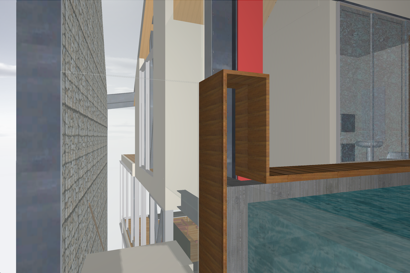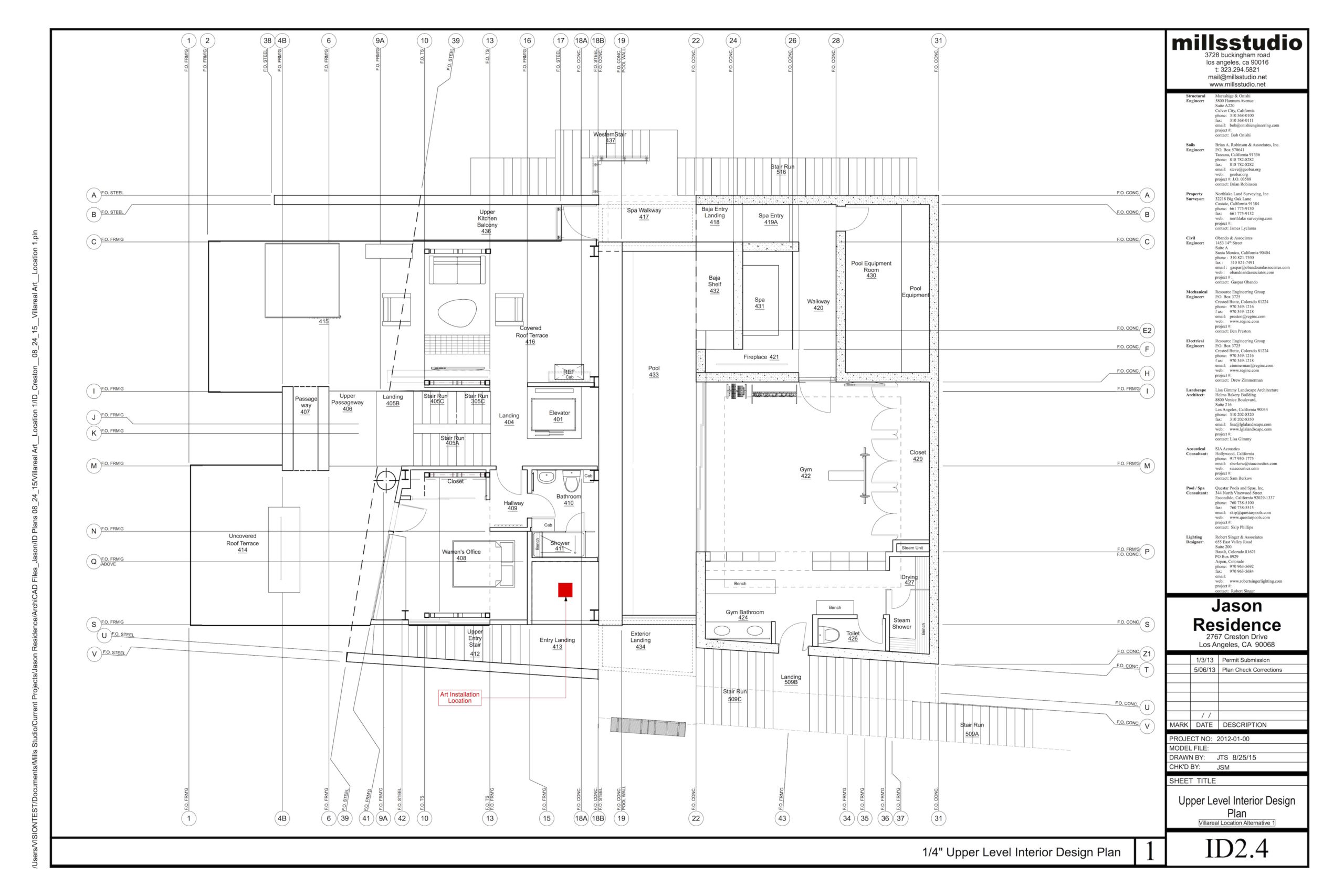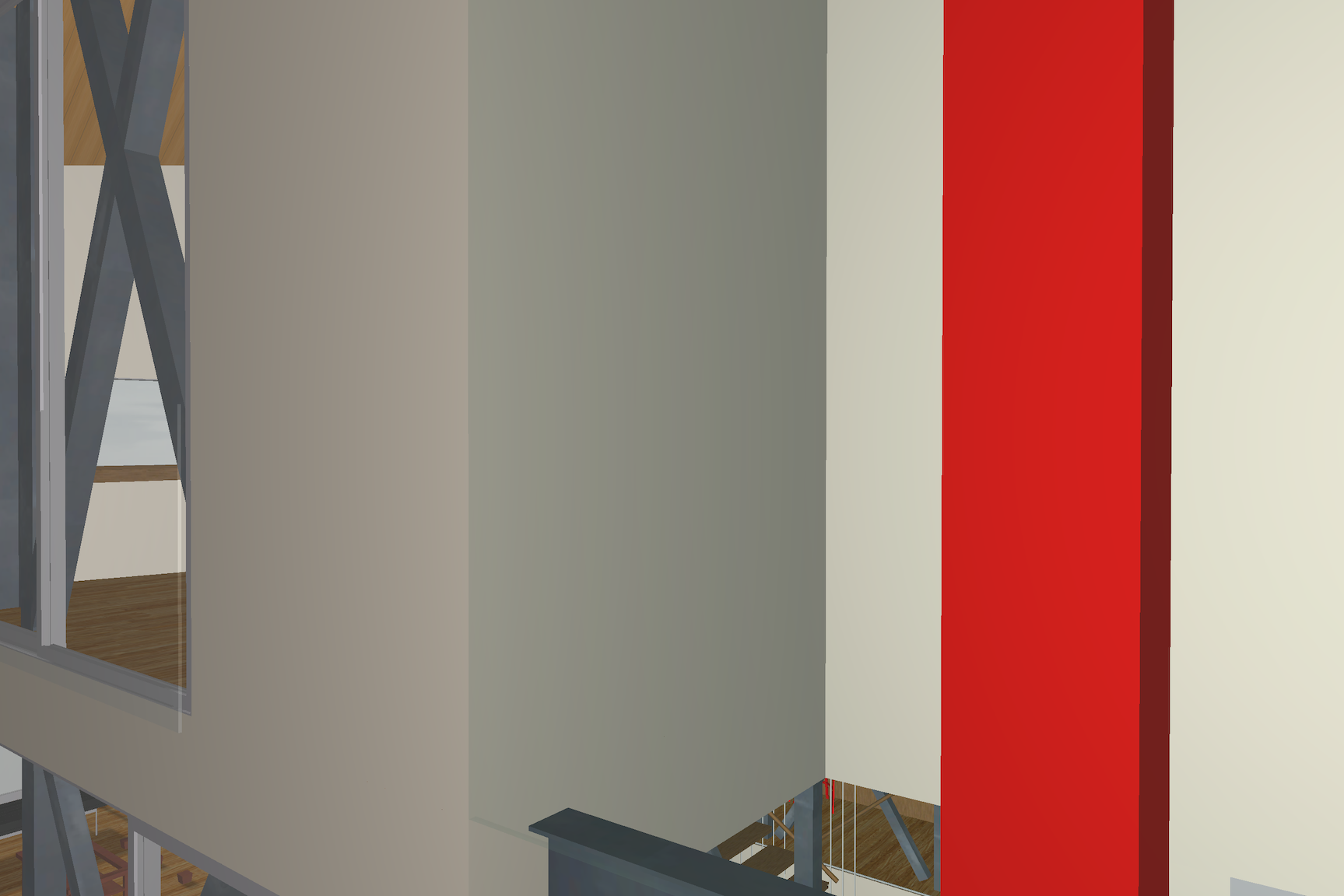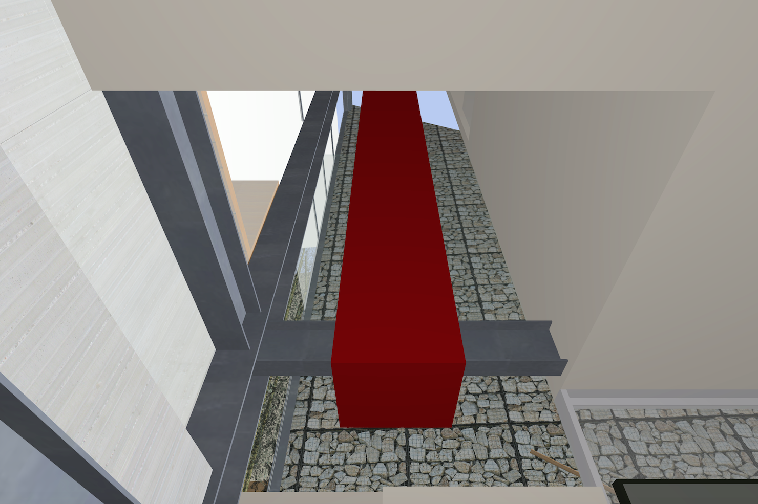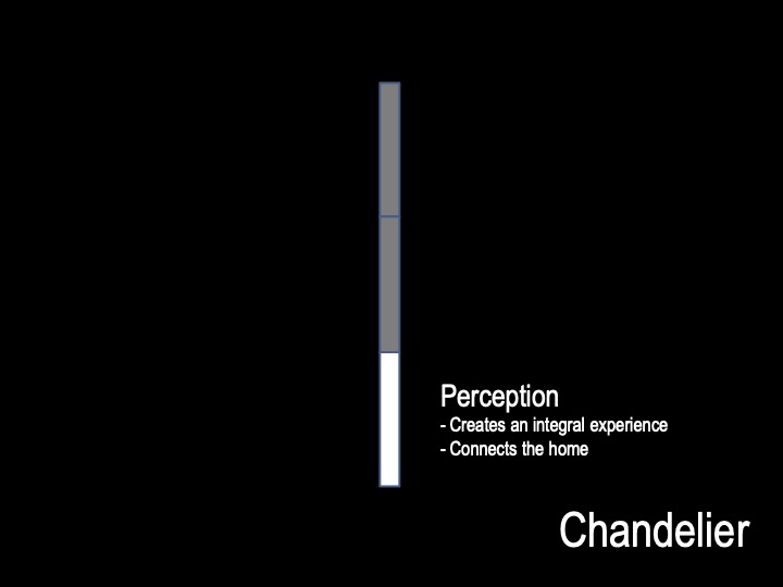mills studio identified the shaft like location for what artist Mads Christensen dubbed the “Chandelier” because it provided the opportunity for a single object or event to be experienced from many multiple perspectives, especially in elevation. The location is a smallish square space in plan enclosed by different configurations of opaque and transparent and nonexistent surfaces at the various floor levels. The qualities of the space and its enclosing surfaces change depending on the time of day and time of year, such as the existence and quality of the filtered light through the rock filled gabion wall. The enclosed space extends thirty to forty feet in height from the main level floor up past the upper level and intermediate level to the underside of the main sloped roof. The nature of the site-specific piece will determine the actual perceptible height of the “shaft.”
