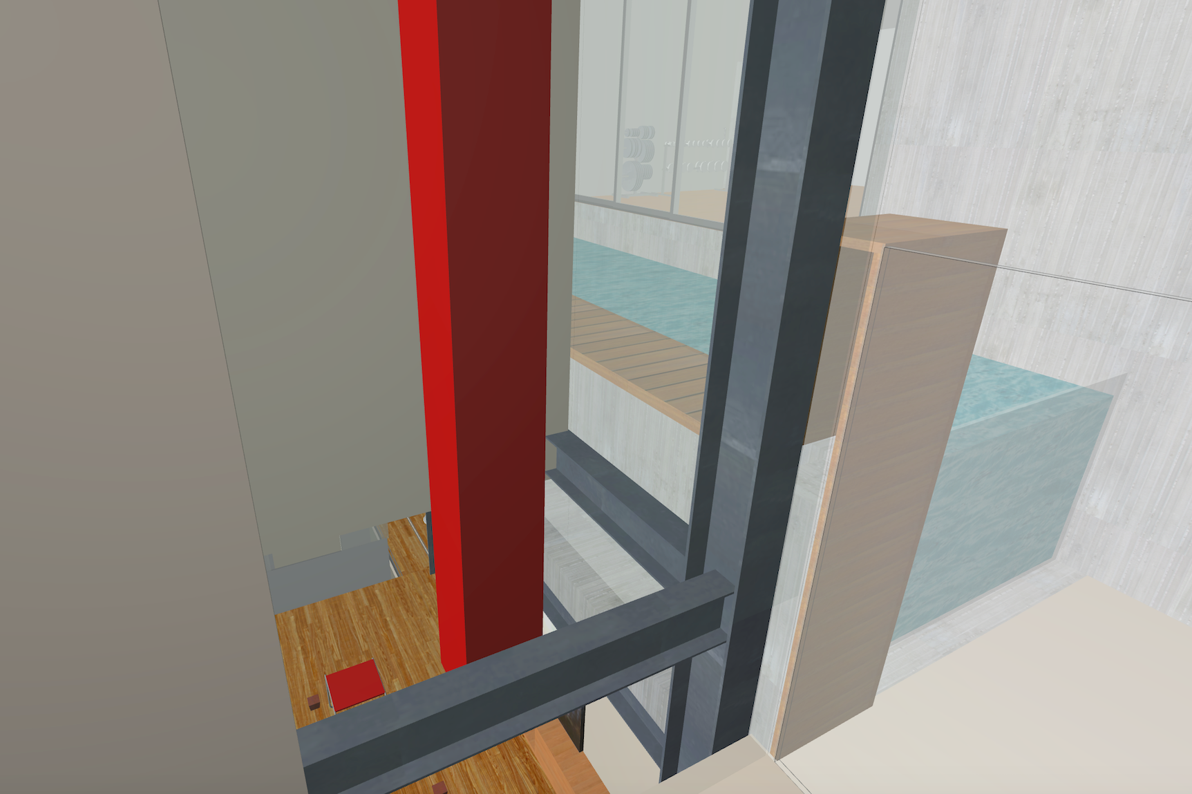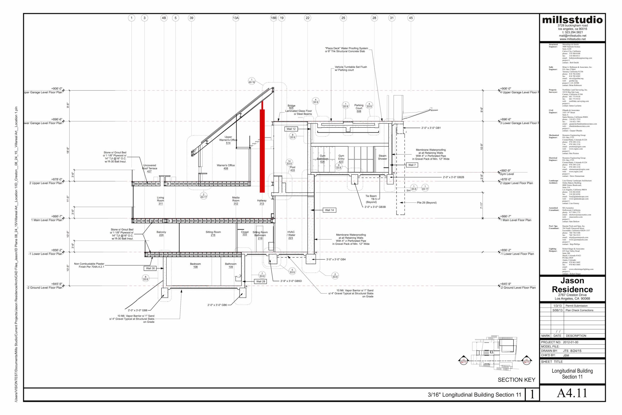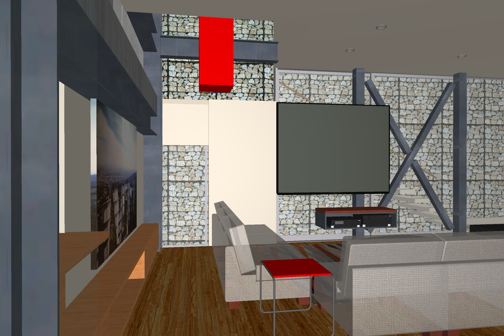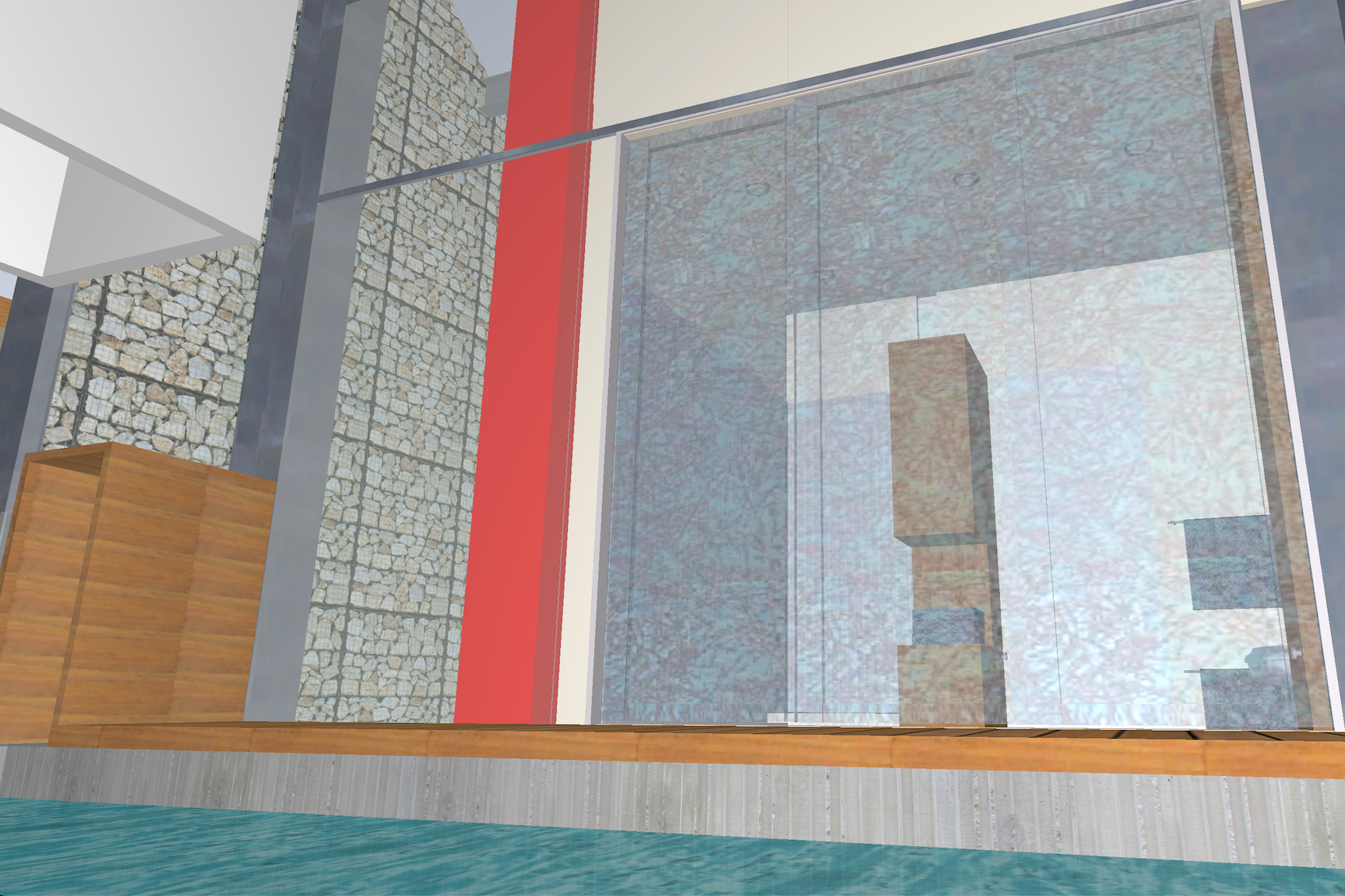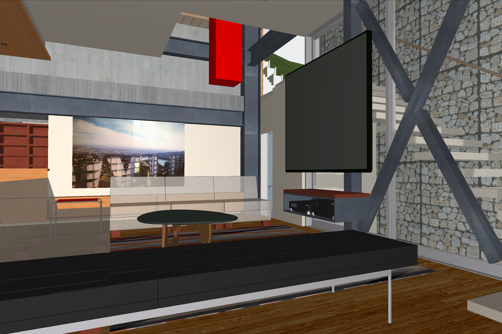 mills studio identified the shaft like location for what artist Mads Christensen dubbed the “Chandelier” because it provided the opportunity for a single object or event to be experienced from many multiple perspectives, especially in elevation. The location is a smallish square space in plan enclosed by different configurations of opaque and transparent and nonexistent surfaces at the various floor levels. The qualities of the space and its enclosing surfaces change depending on the time of day and time of year, such as the existence and quality of the filtered light through the rock filled gabion wall. The enclosed space extends thirty to forty feet in height from the main level floor up past the upper level and intermediate level to the underside of the main sloped roof. The nature of the site-specific piece will determine the actual perceptible height of the “shaft.”