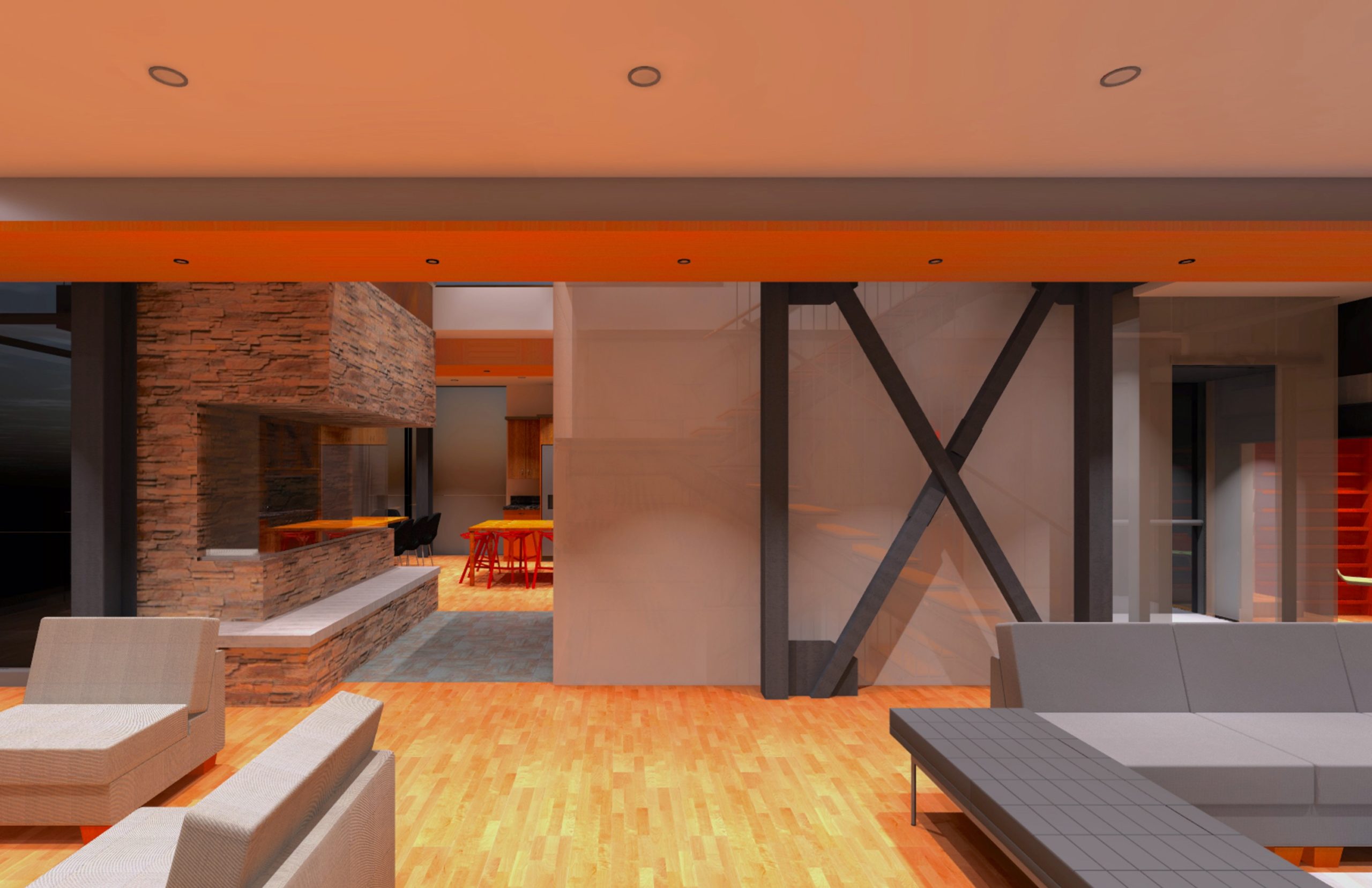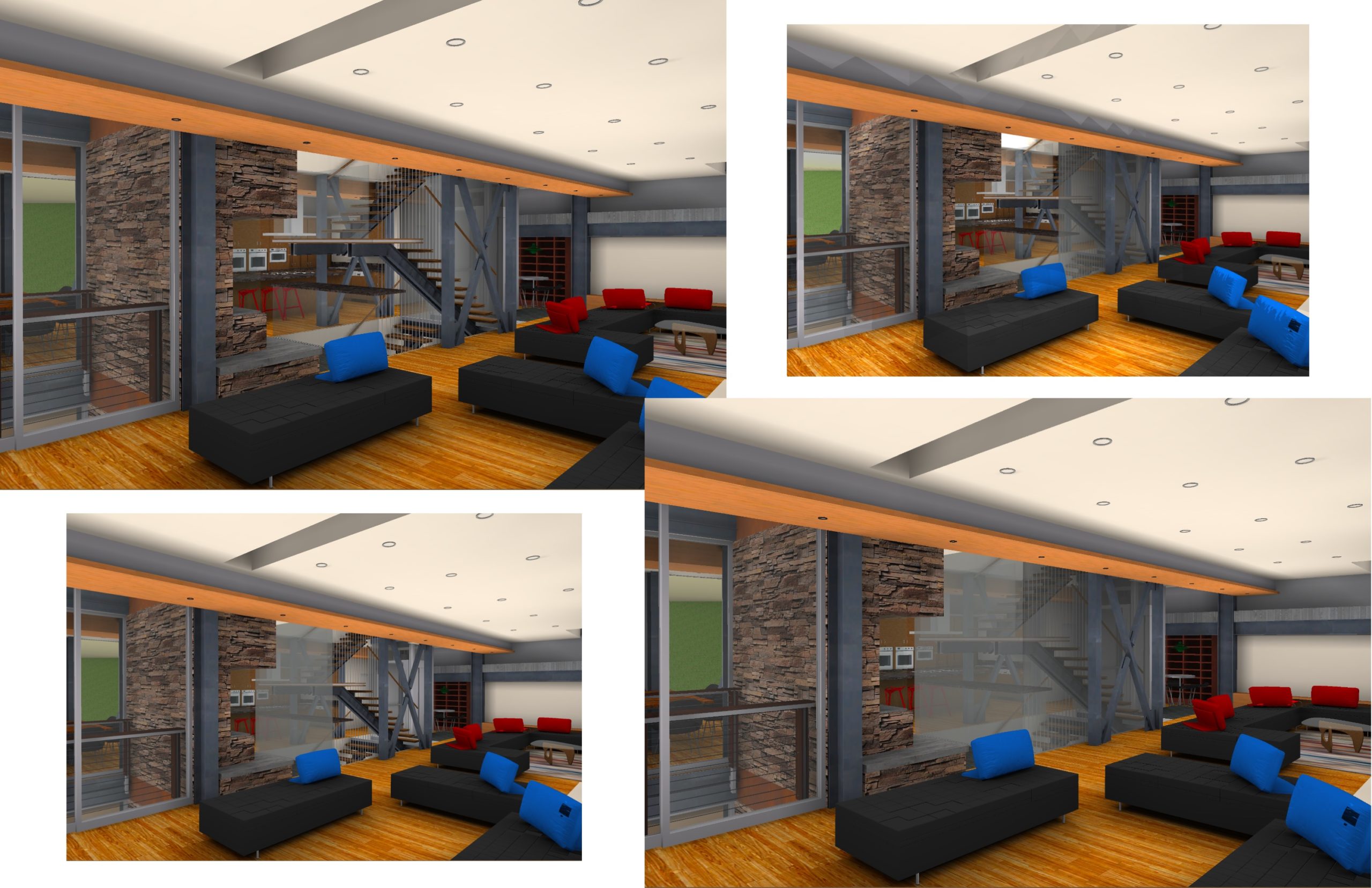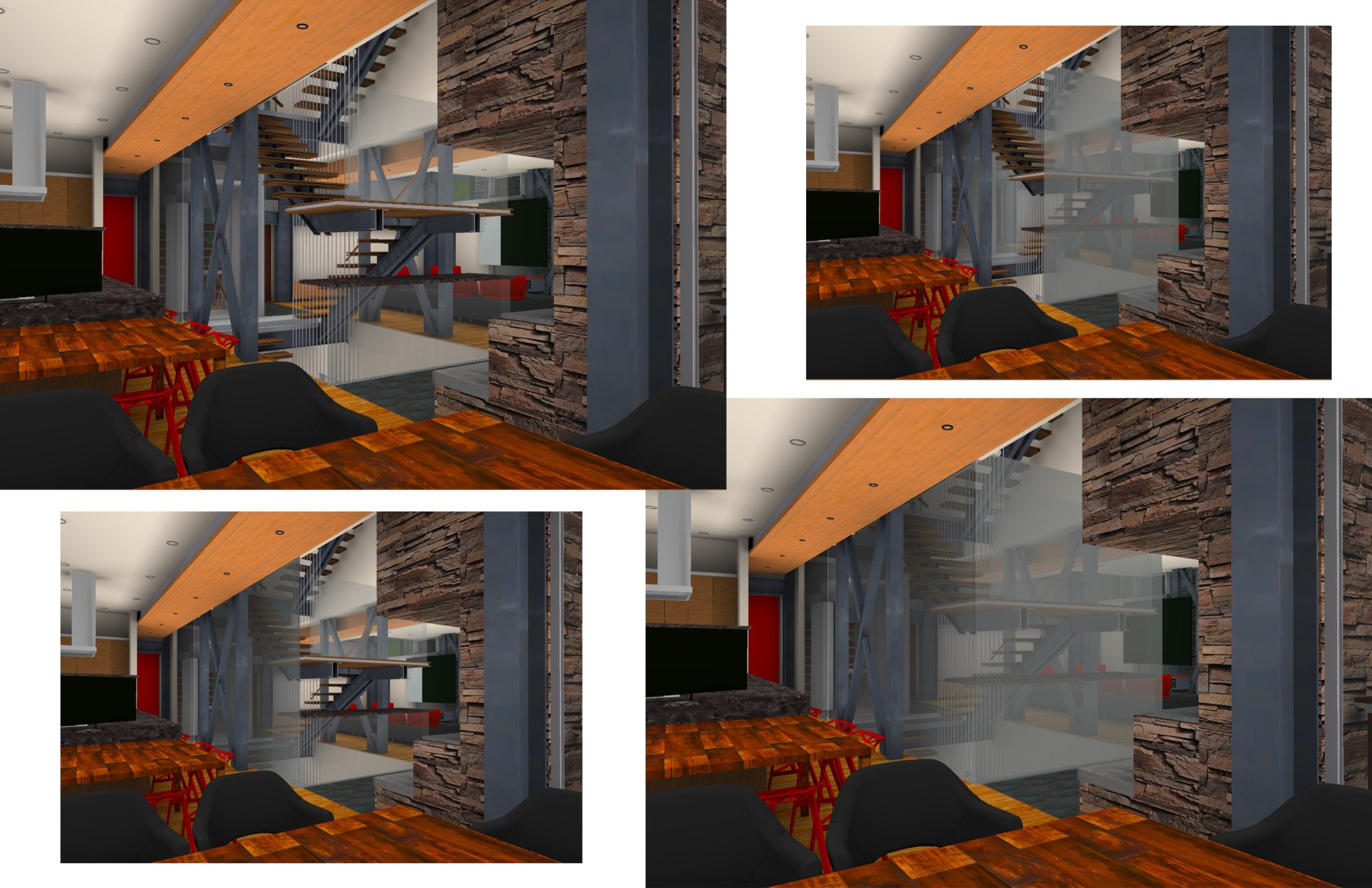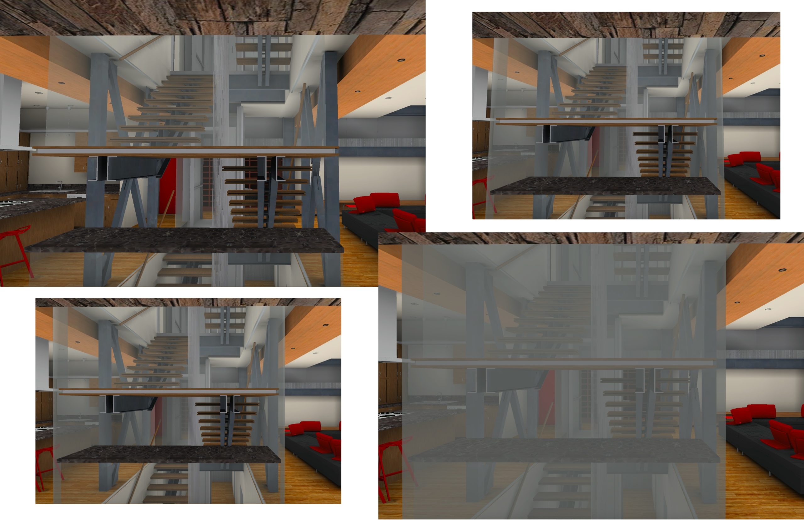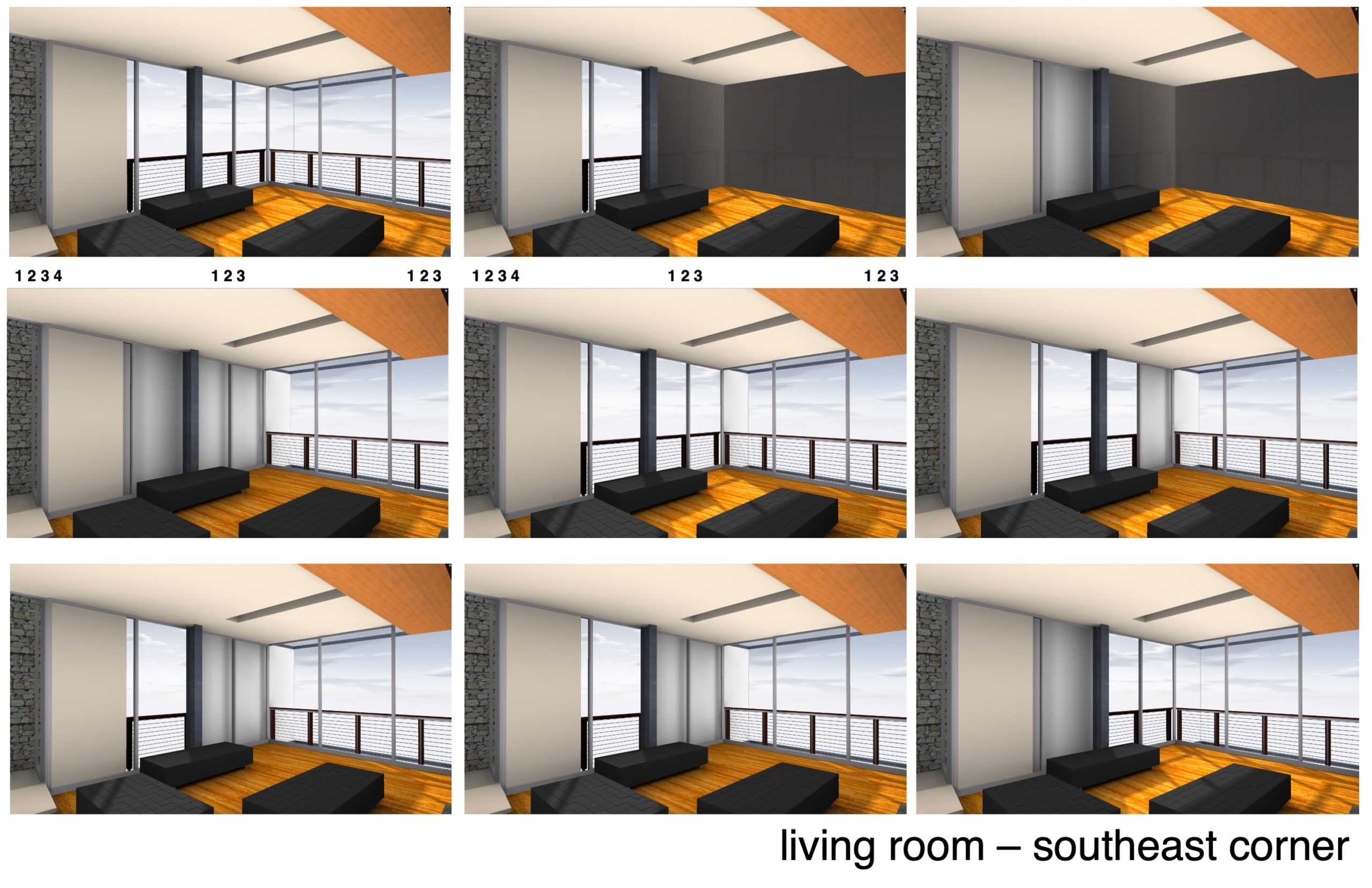 The eight individual shades in differing combinations provide both functional and visual configurations that change the use and perception of the main living space. The shades can direct how the house functions by blocking or allowing access to the up and or down portions of the main stair from the main level. The shades can both functionally and visually separate the open main living level into separate areas of living / media and kitchen / dining. The amount of visual separation can be controlled by the number of layers in the down position, the height of the shades in the down position, and the lighting of the two sides of each shade. Different height configurations address how the visual connections and spatial experiences differ when standing, when seated at the dining table or on sofas, and when laying on the sofas. Different lighting configurations alter the level of transparency and color of the shades. The shades are more opaque when lighted from the front, become transparent when lit from behind, and can become immaterial, approaching pure light when lit equally from front and rear.