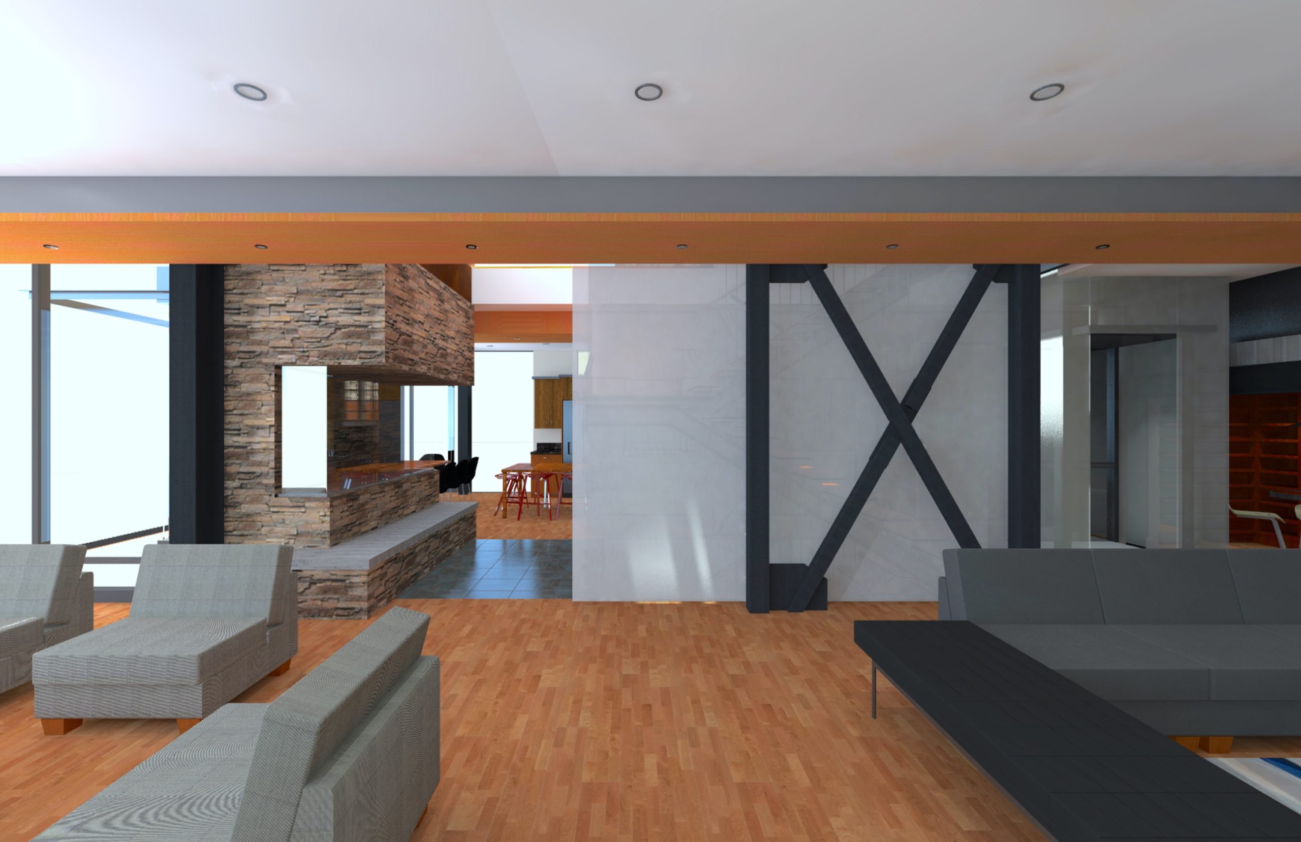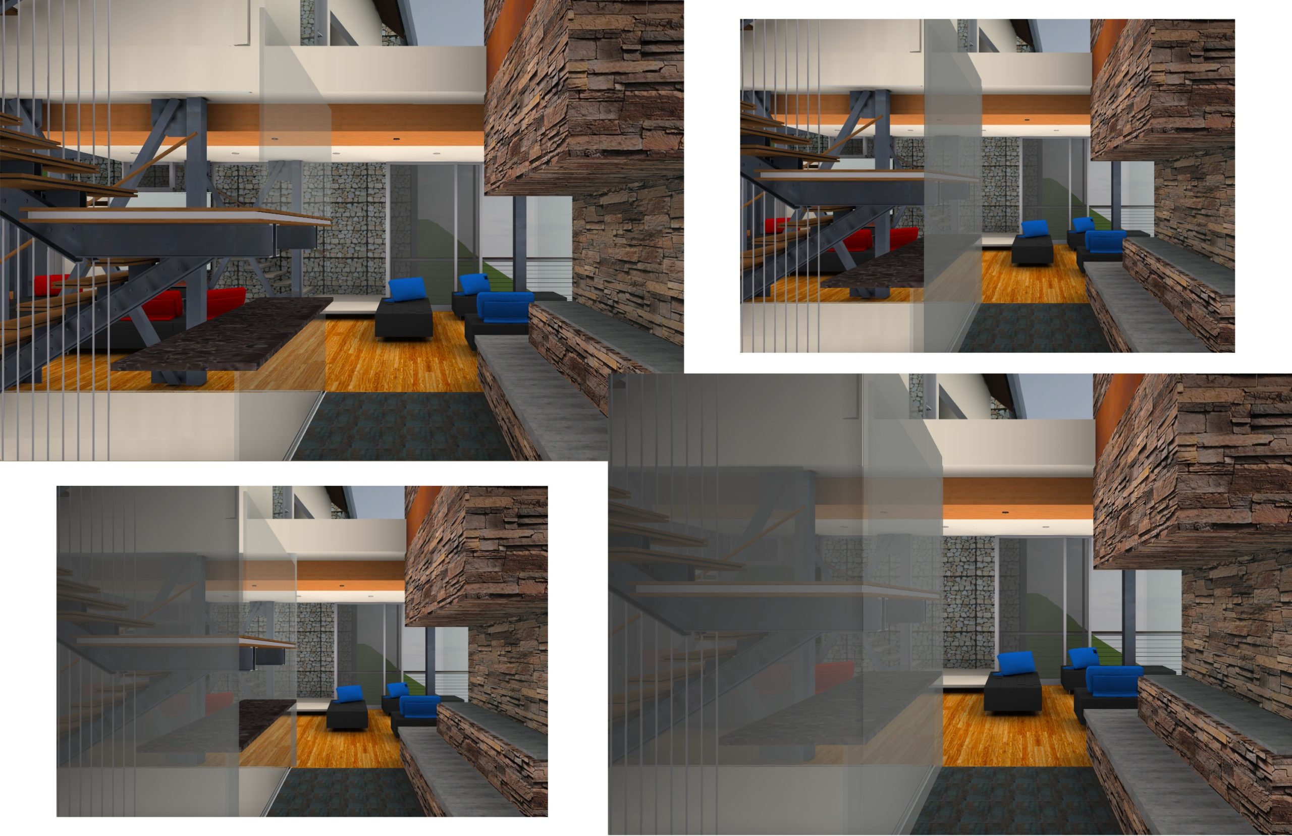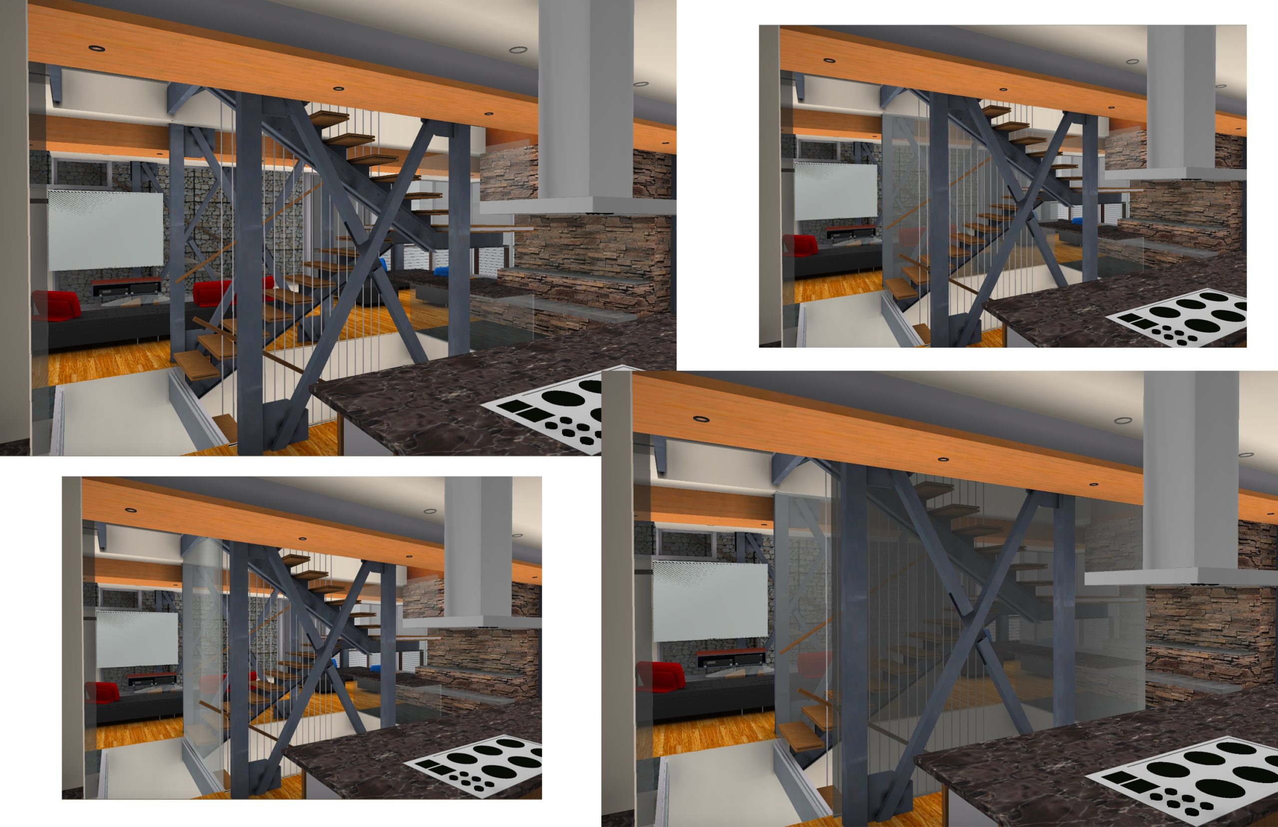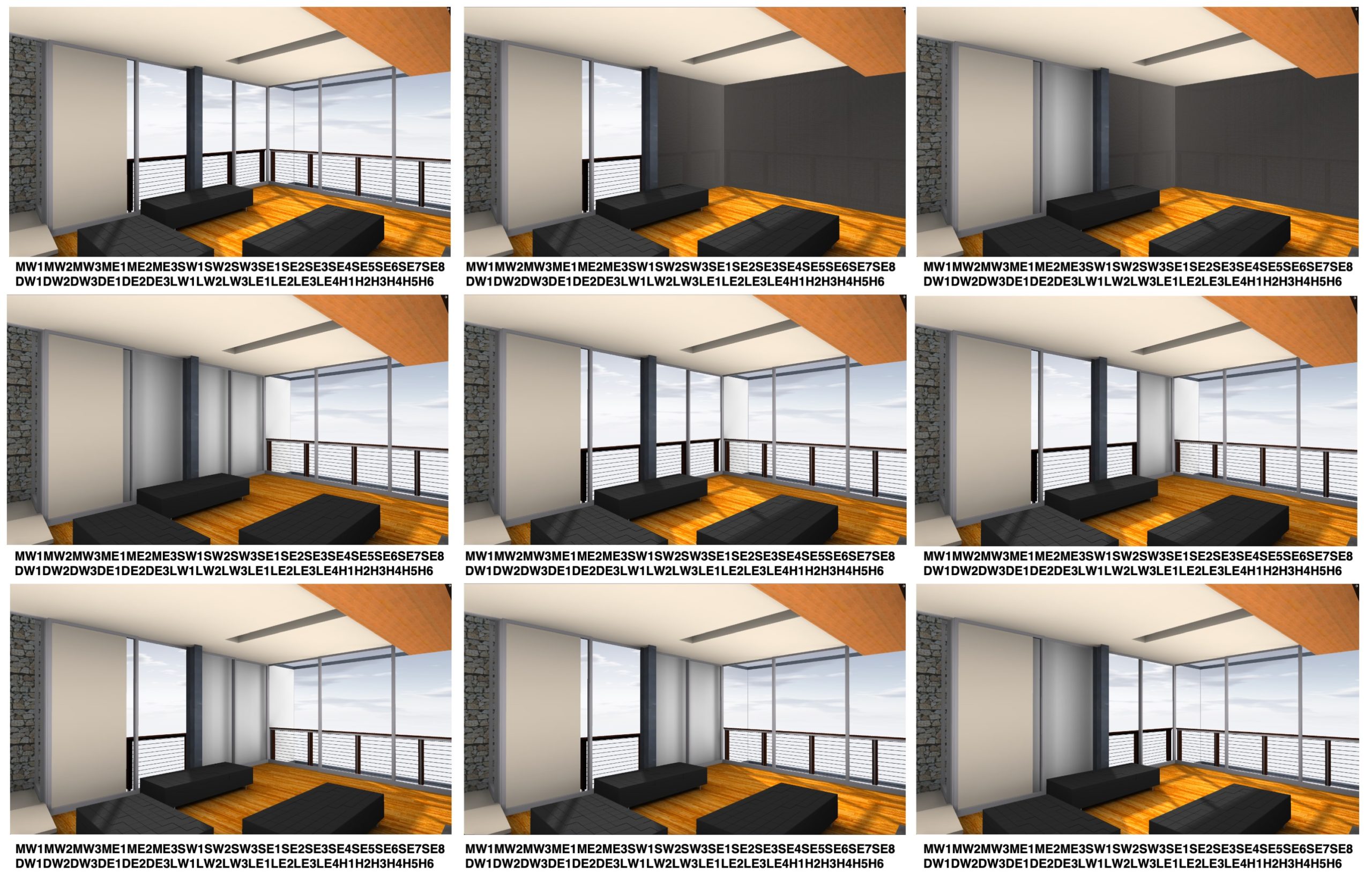 The eight individual shades in differing combinations provide both functional and visual configurations that change the use and perception of the main living space. The shades can direct how the house functions by blocking or allowing access to the up and or down portions of the main stair from the main level. The shades can both functionally and visually separate the open main living level into separate areas of living / media and kitchen / dining. The amount of visual separation can be controlled by the number of layers in the down position, the height of the shades in the down position, and the lighting of the two sides of each shade. Different height configurations address how the visual connections and spatial experiences differ when standing, when seated at the dining table or on sofas, and when laying on the sofas. Different lighting configurations alter the level of transparency and color of the shades. The shades are more opaque when lighted from the front, become transparent when lit from behind, and can become immaterial, approaching pure light when lit equally from front and rear.