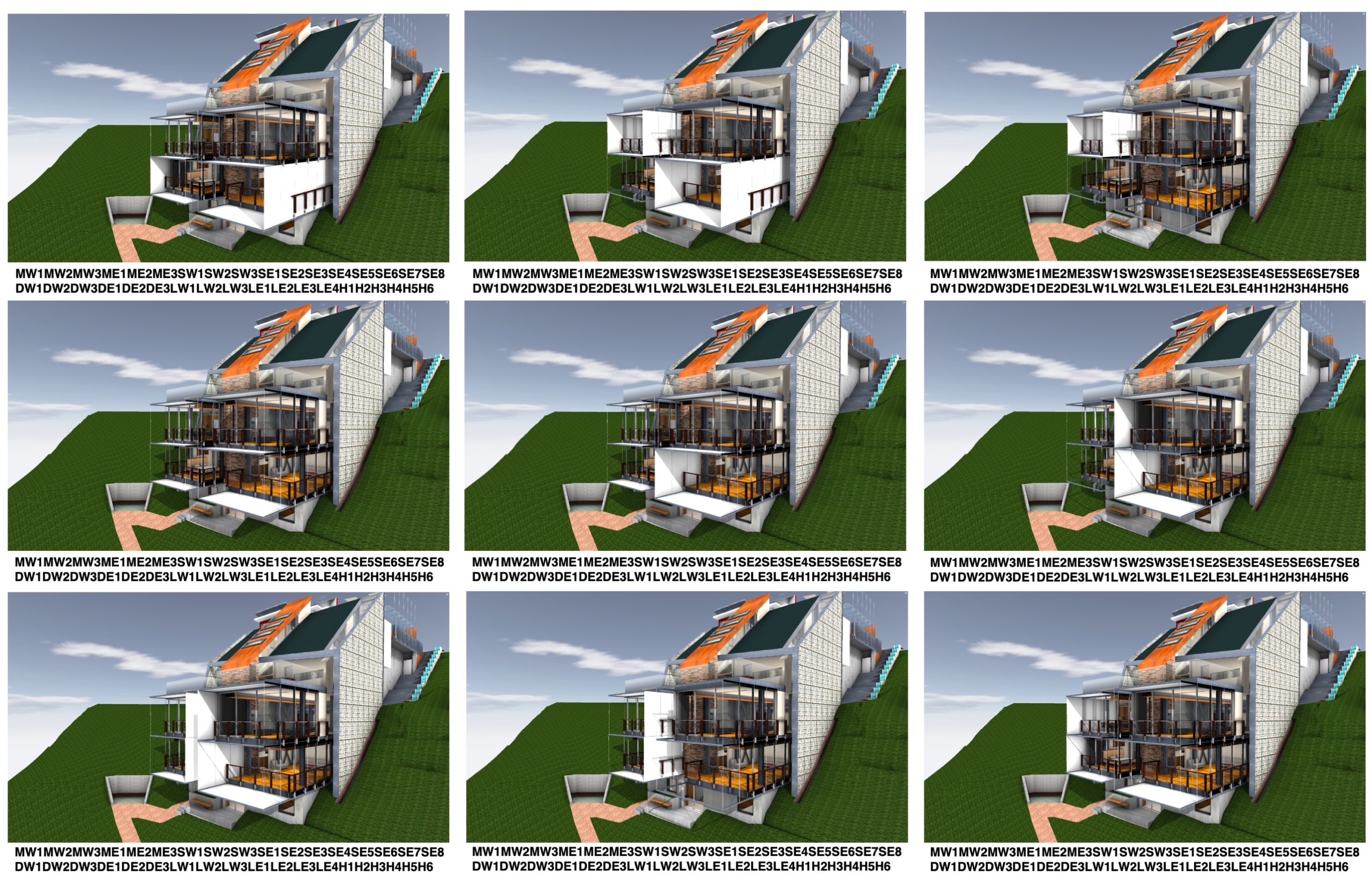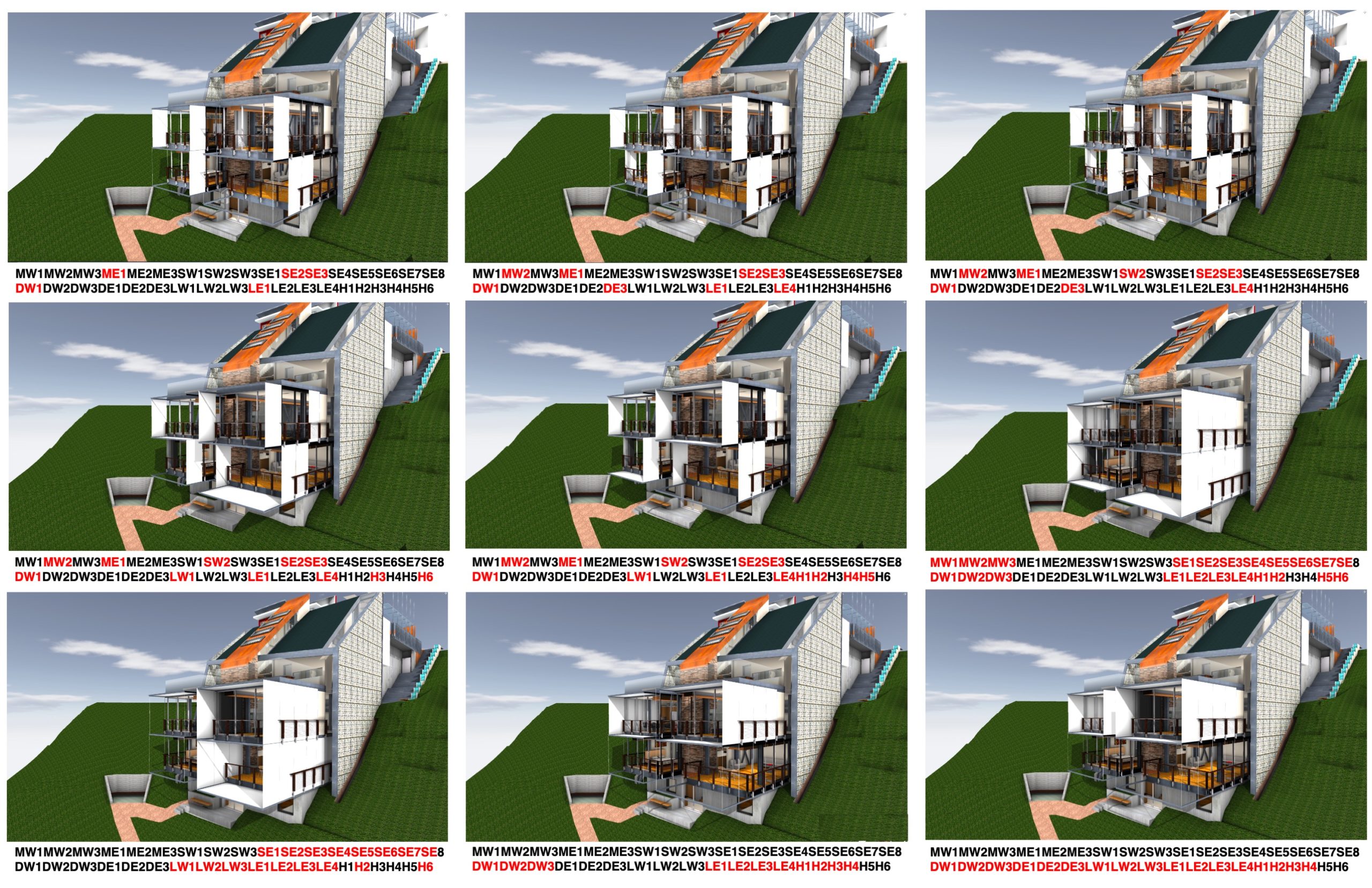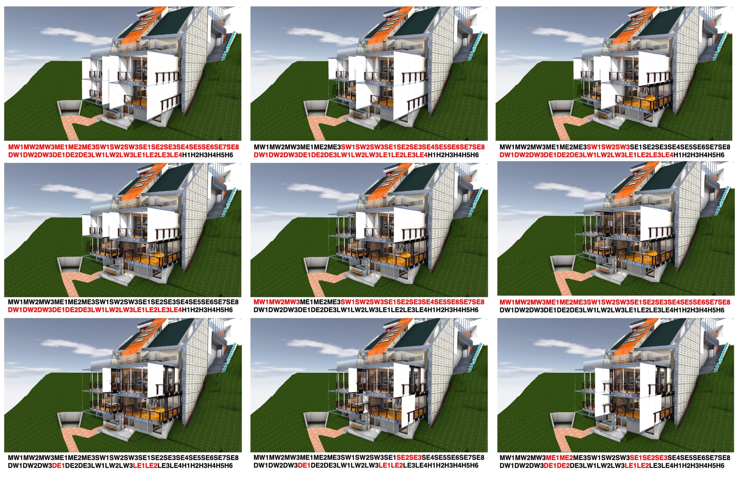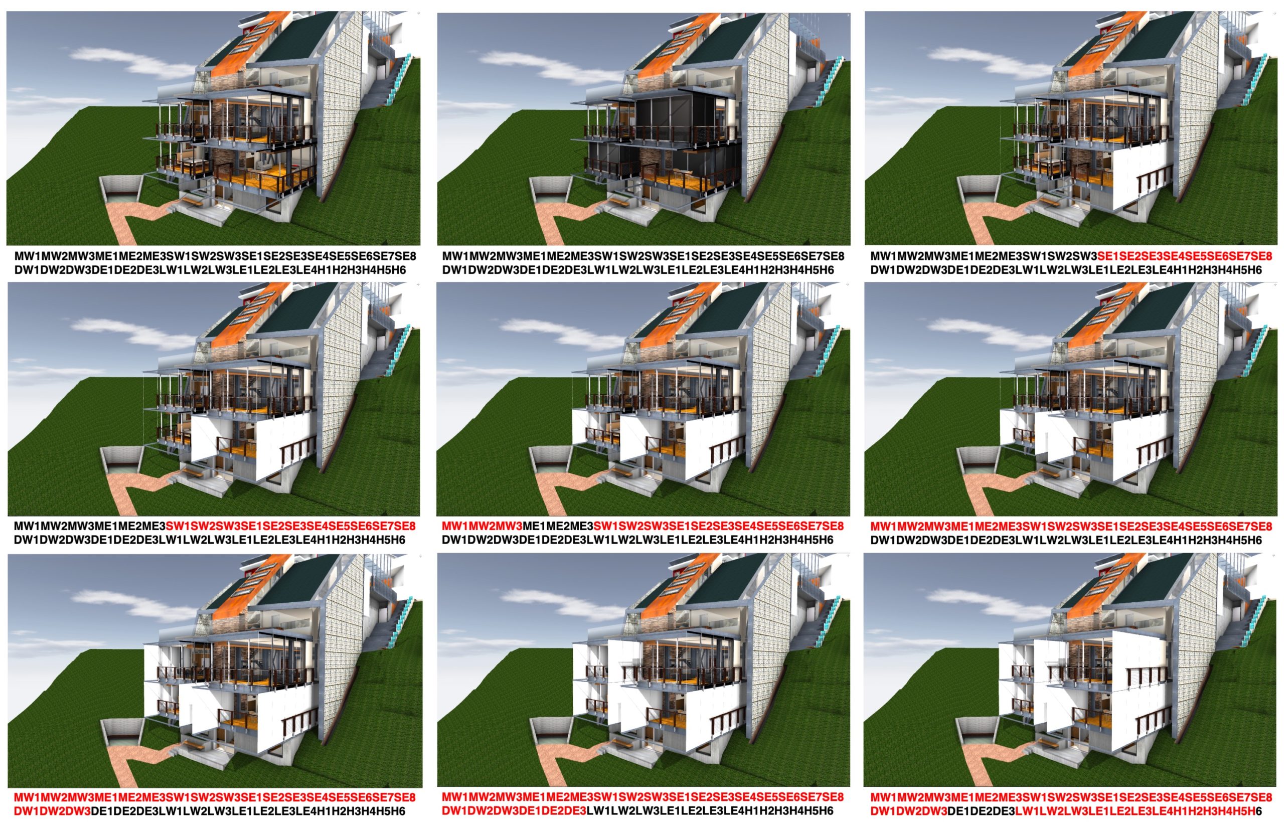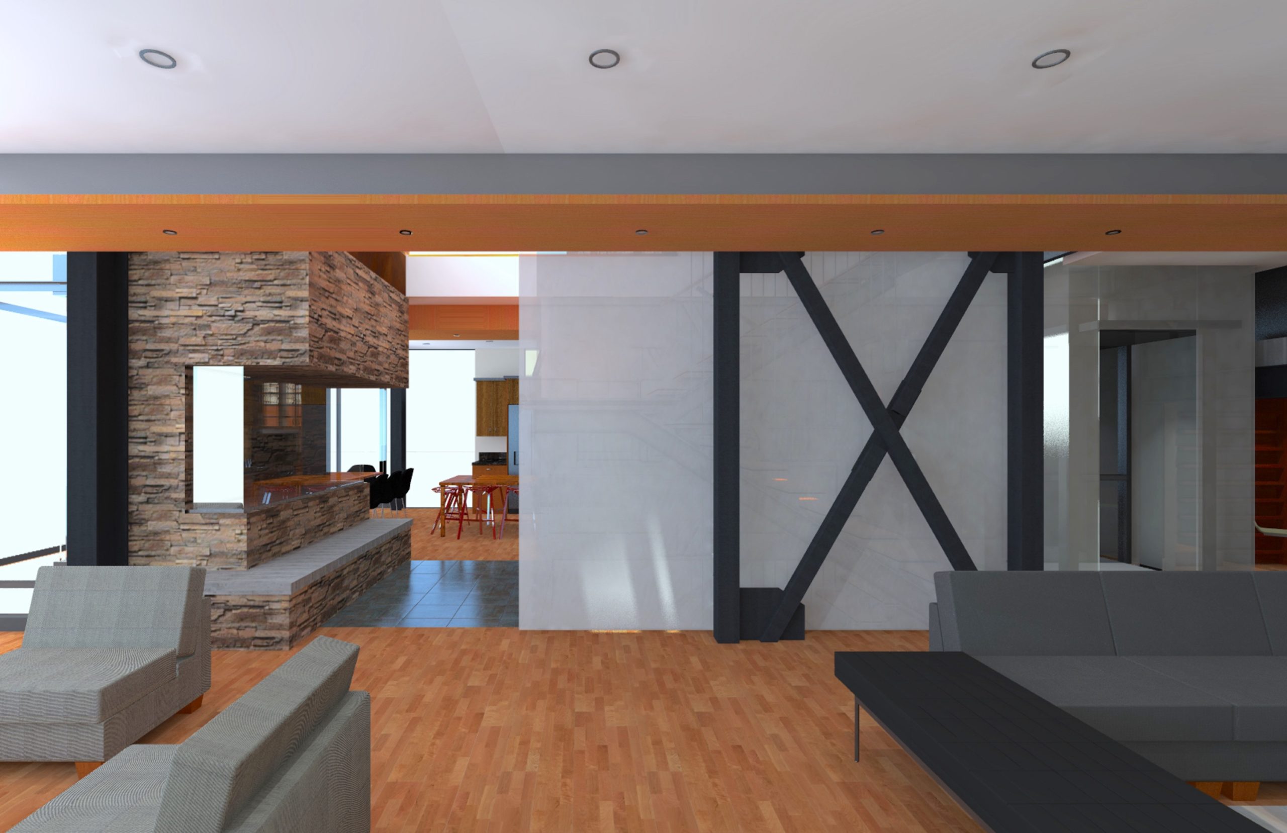 The eight individual shades in differing combinations provide both functional and visual configurations that change the use and perception of the main living space. The shades can direct how the house functions by blocking or allowing access to the up and or down portions of the main stair from the main level. The shades can both functionally and visually separate the open main living level into separate areas of living / media and kitchen / dining. The amount of visual separation can be controlled by the number of layers in the down position, the height of the shades in the down position, and the lighting of the two sides of each shade. Different height configurations address how the visual connections and spatial experiences differ when standing, when seated at the dining table or on sofas, and when laying on the sofas. Different lighting configurations alter the level of transparency and color of the shades. The shades are more opaque when lighted from the front, become transparent when lit from behind, and can become immaterial, approaching pure light when lit equally from front and rear.