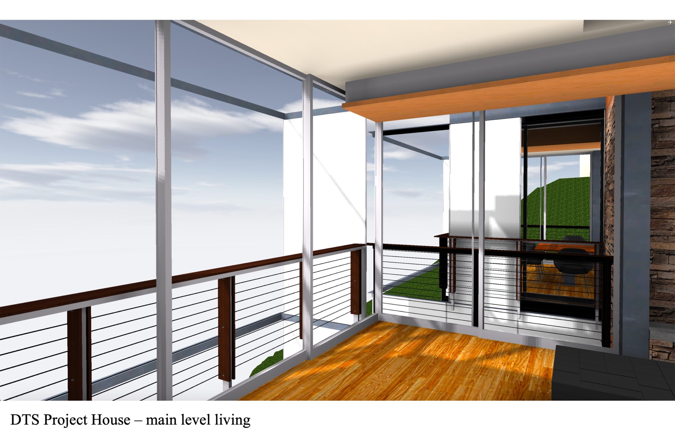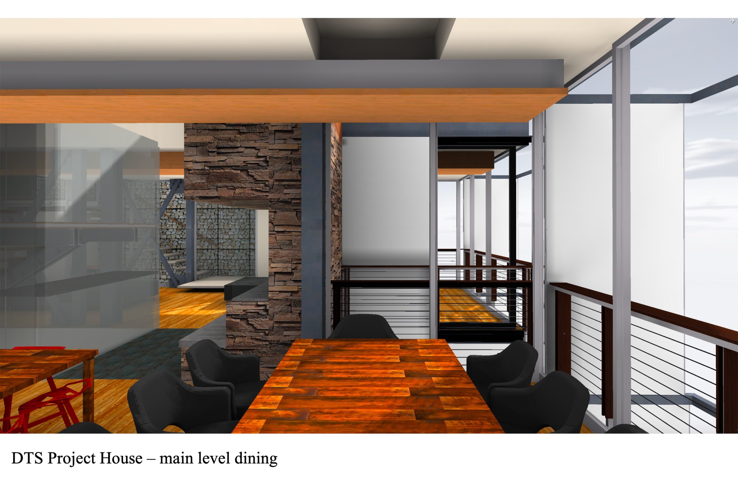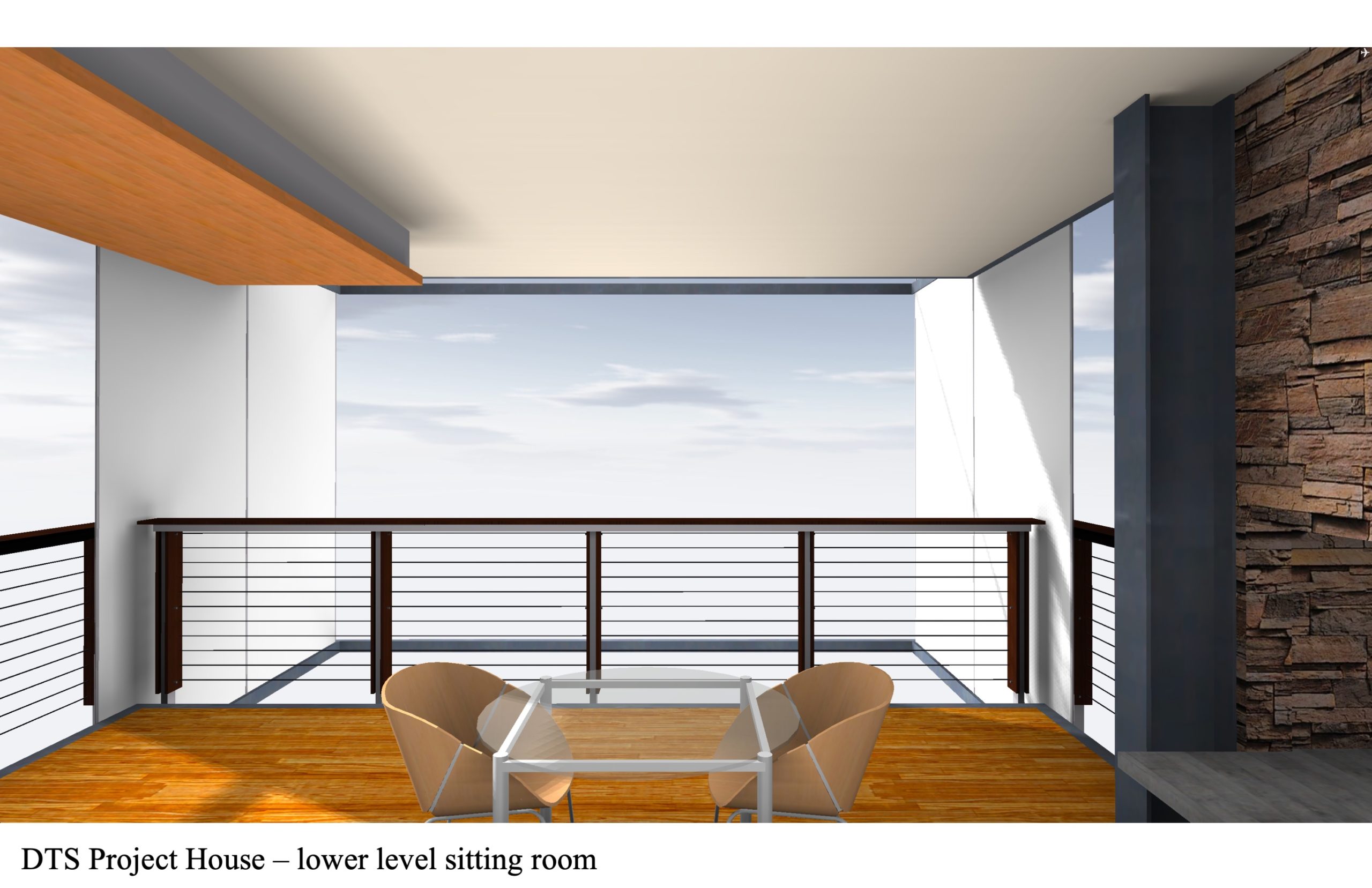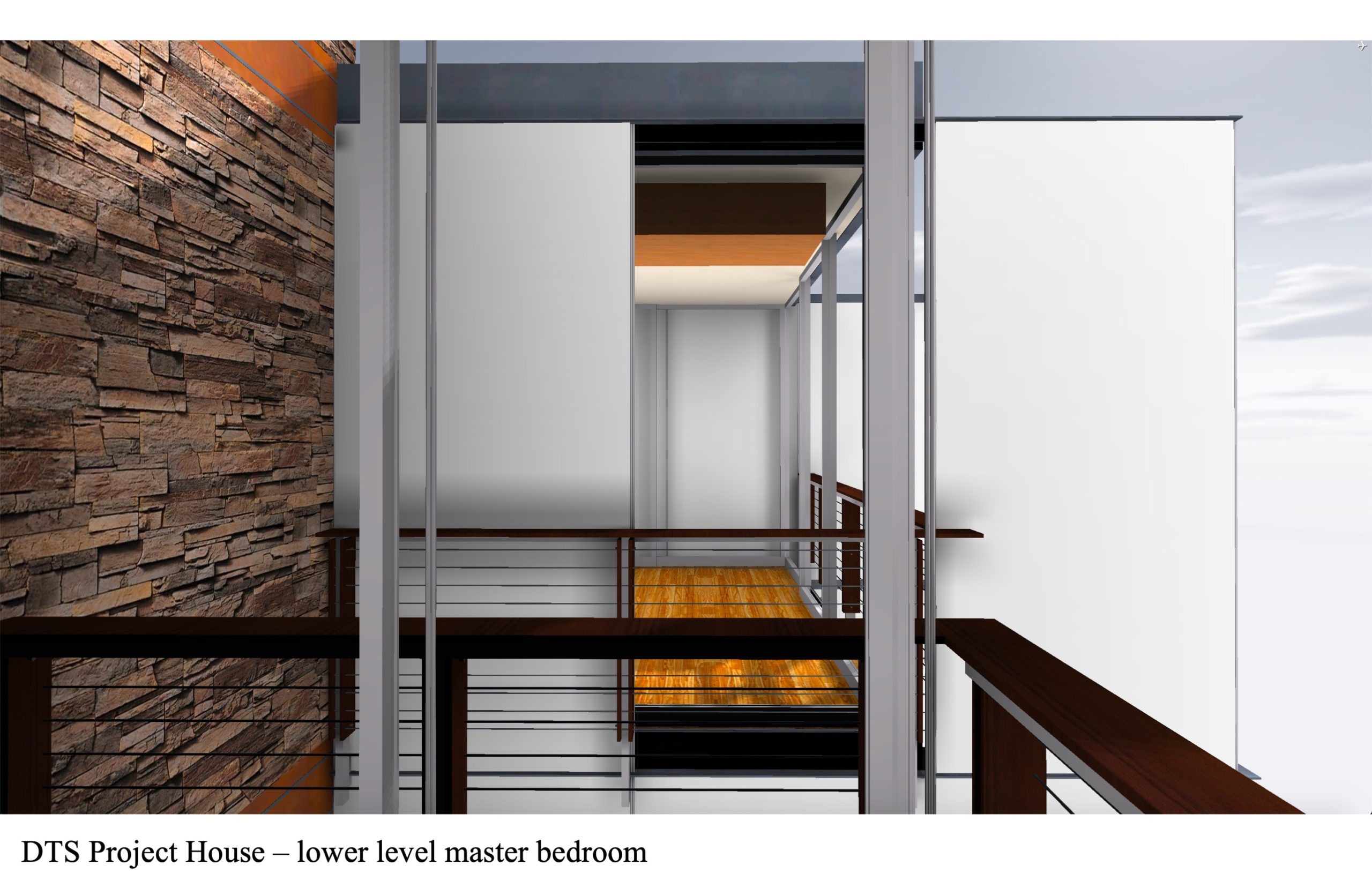 A glass enclosed elevator shaft is a central design element of the DTS Project House. The glass on two sides of the cab allows views out as you go up and down, but the more frequent experience of the elevator is looking into the glass enclosed shaft. The transparent enclosure allows views into the shaft and depending on your location relative to the cab, you either see into the cab itself, or see through the multiple sided glass enclosure, or see the interior surfaces of the shaft or bottom or top of the cab. The elevator cab and shaft have a strong visual presence and offer artistic opportunities.