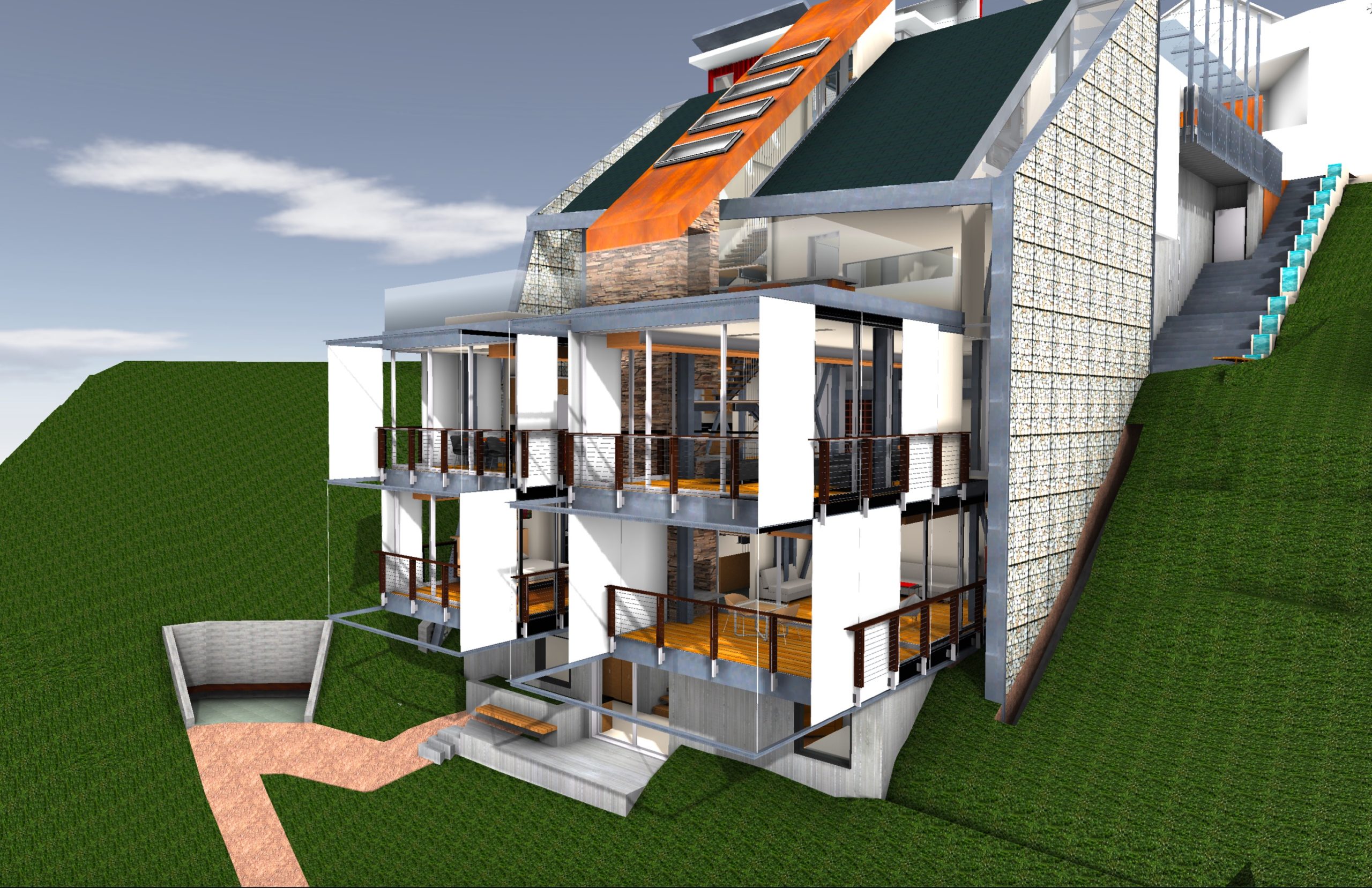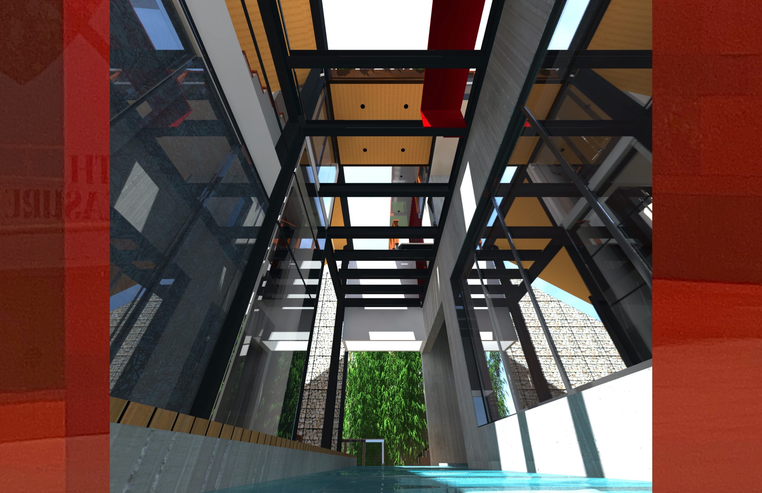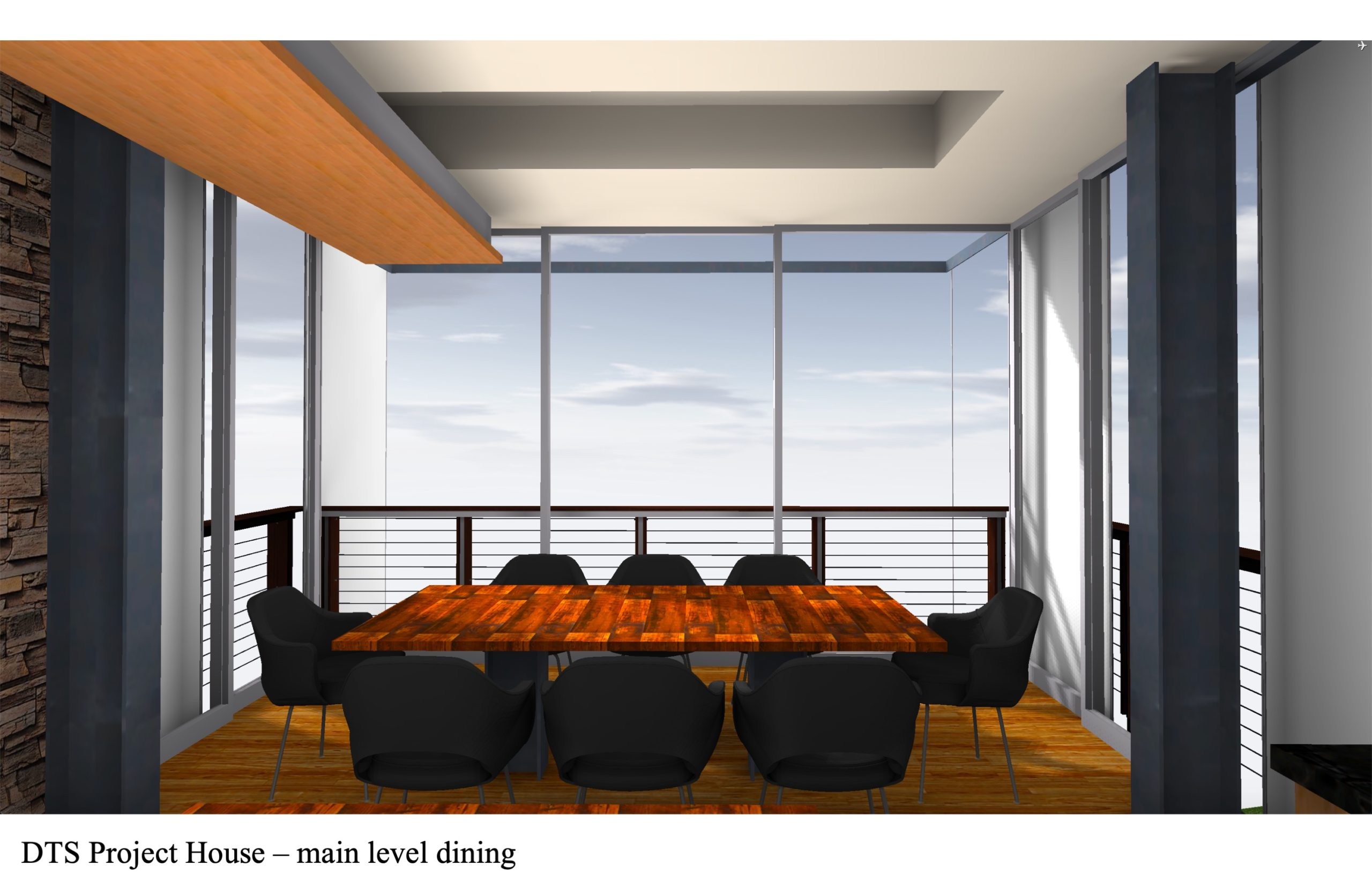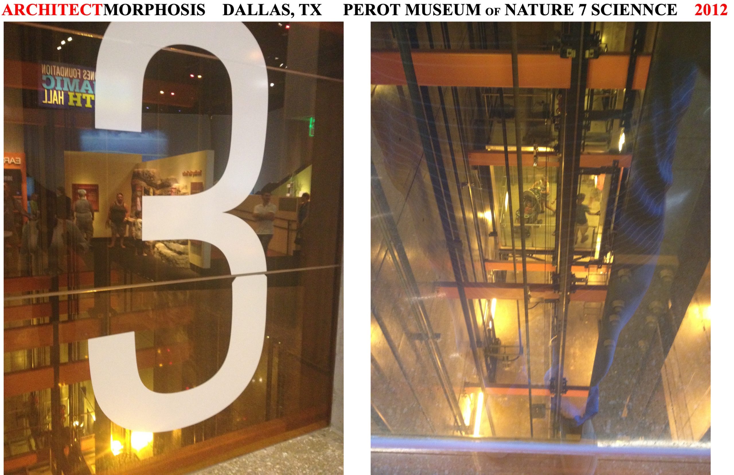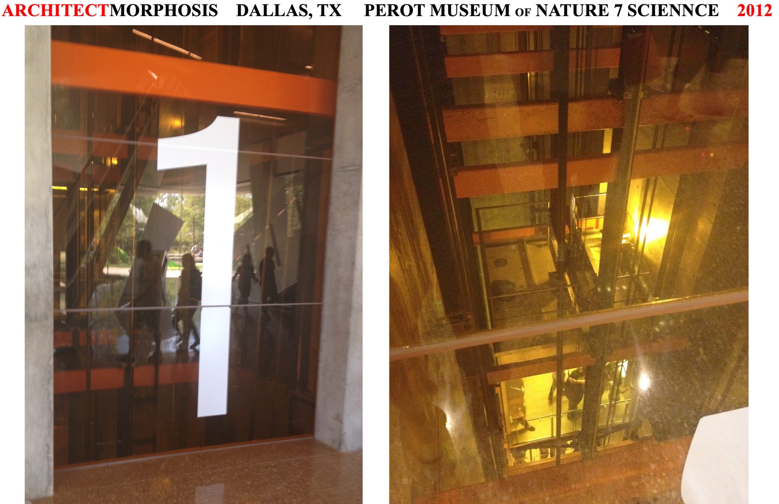 A glass enclosed elevator shaft is a central design element of the DTS Project House. The glass on two sides of the cab allows views out as you go up and down, but the more frequent experience of the elevator is looking into the glass enclosed shaft. The transparent enclosure allows views into the shaft and depending on your location relative to the cab, you either see into the cab itself, or see through the multiple sided glass enclosure, or see the interior surfaces of the shaft or bottom or top of the cab. The elevator cab and shaft have a strong visual presence and offer artistic opportunities.