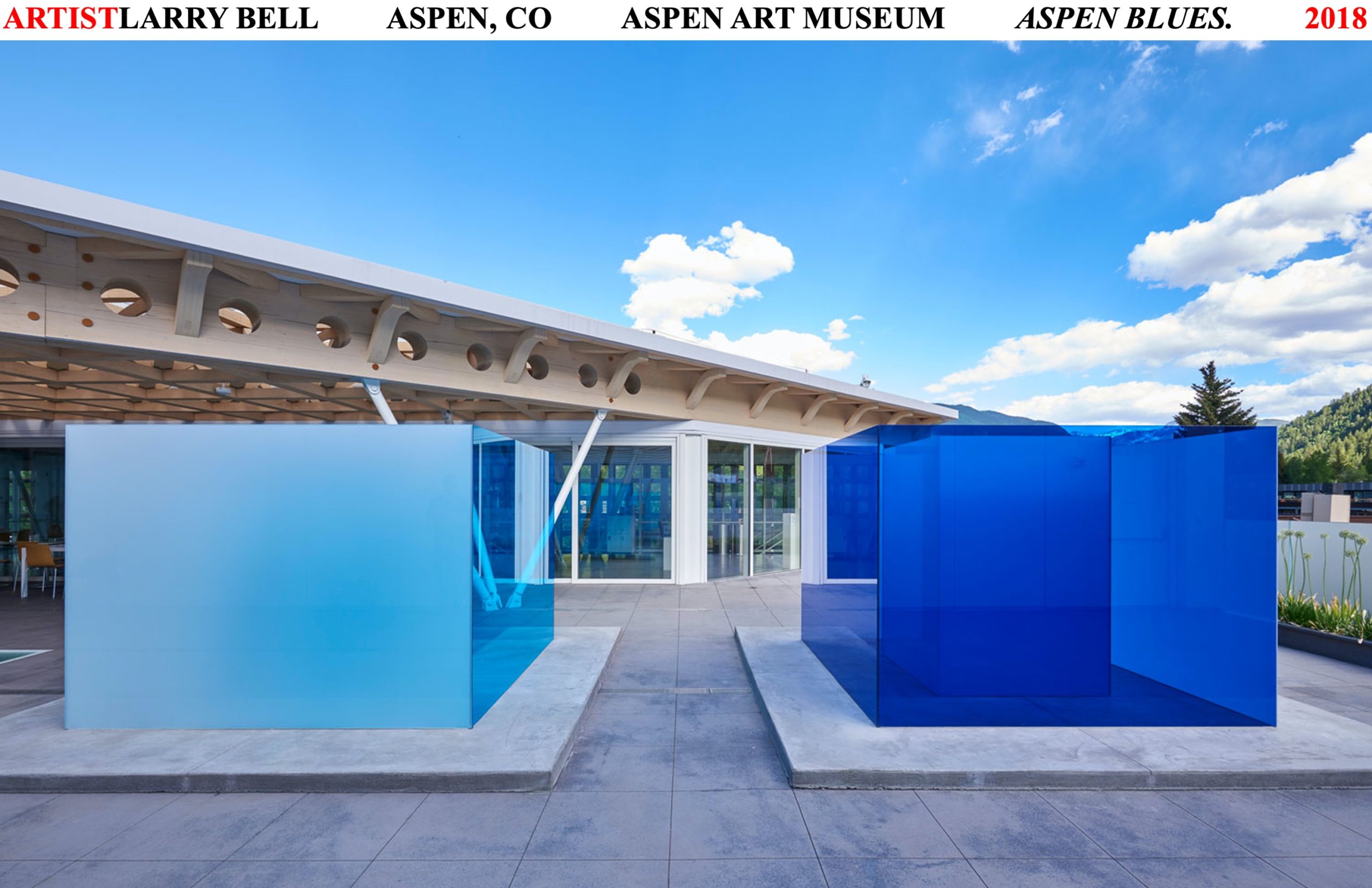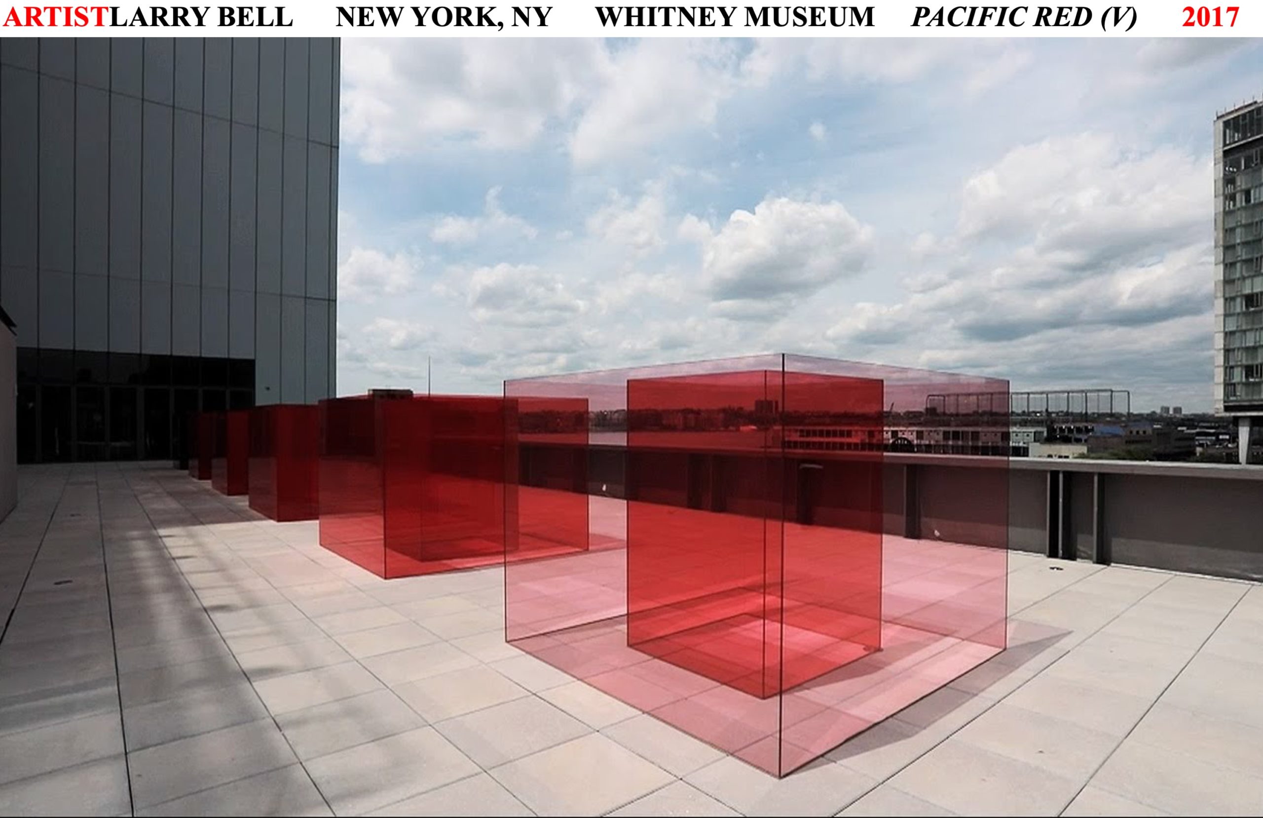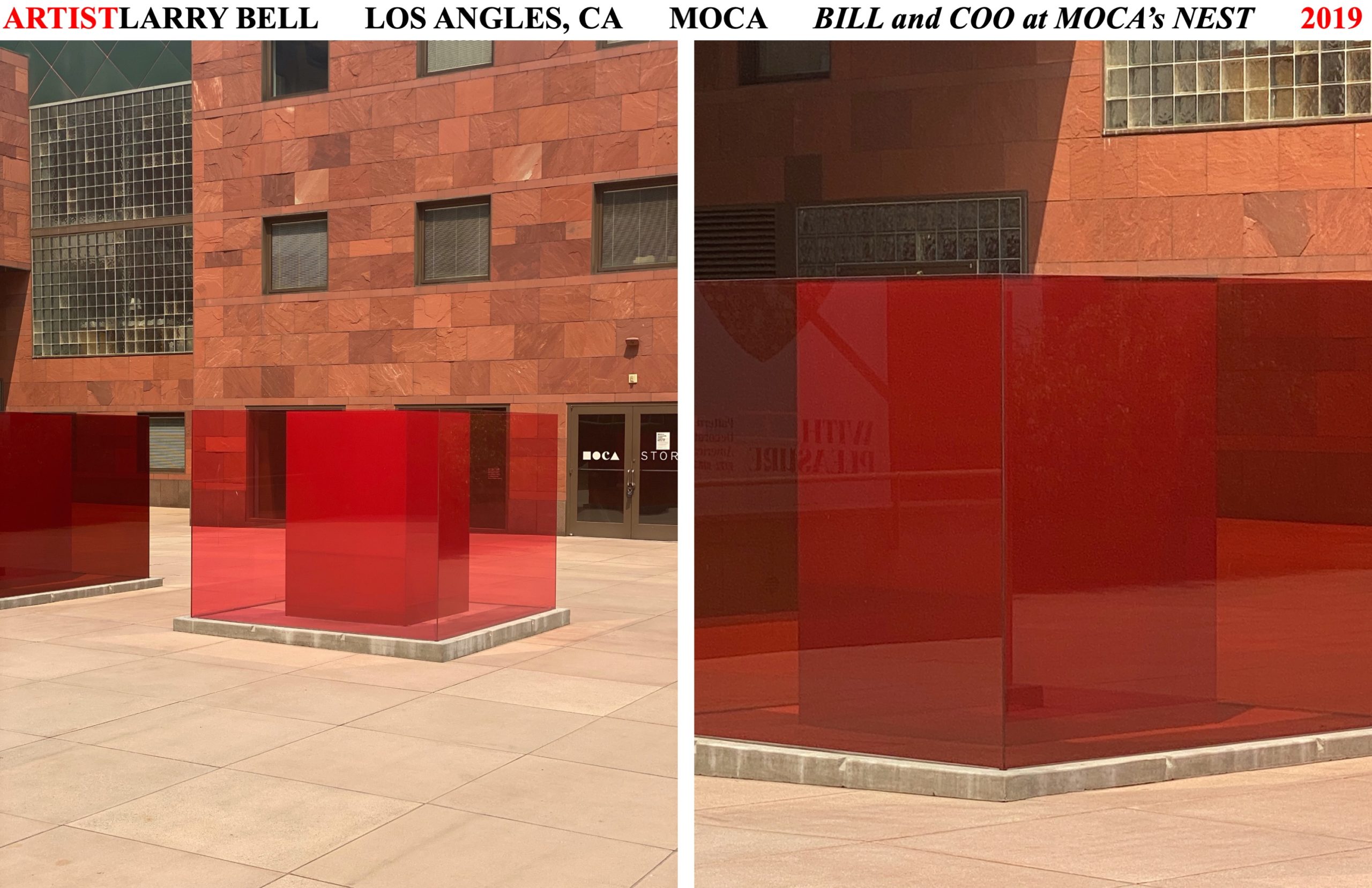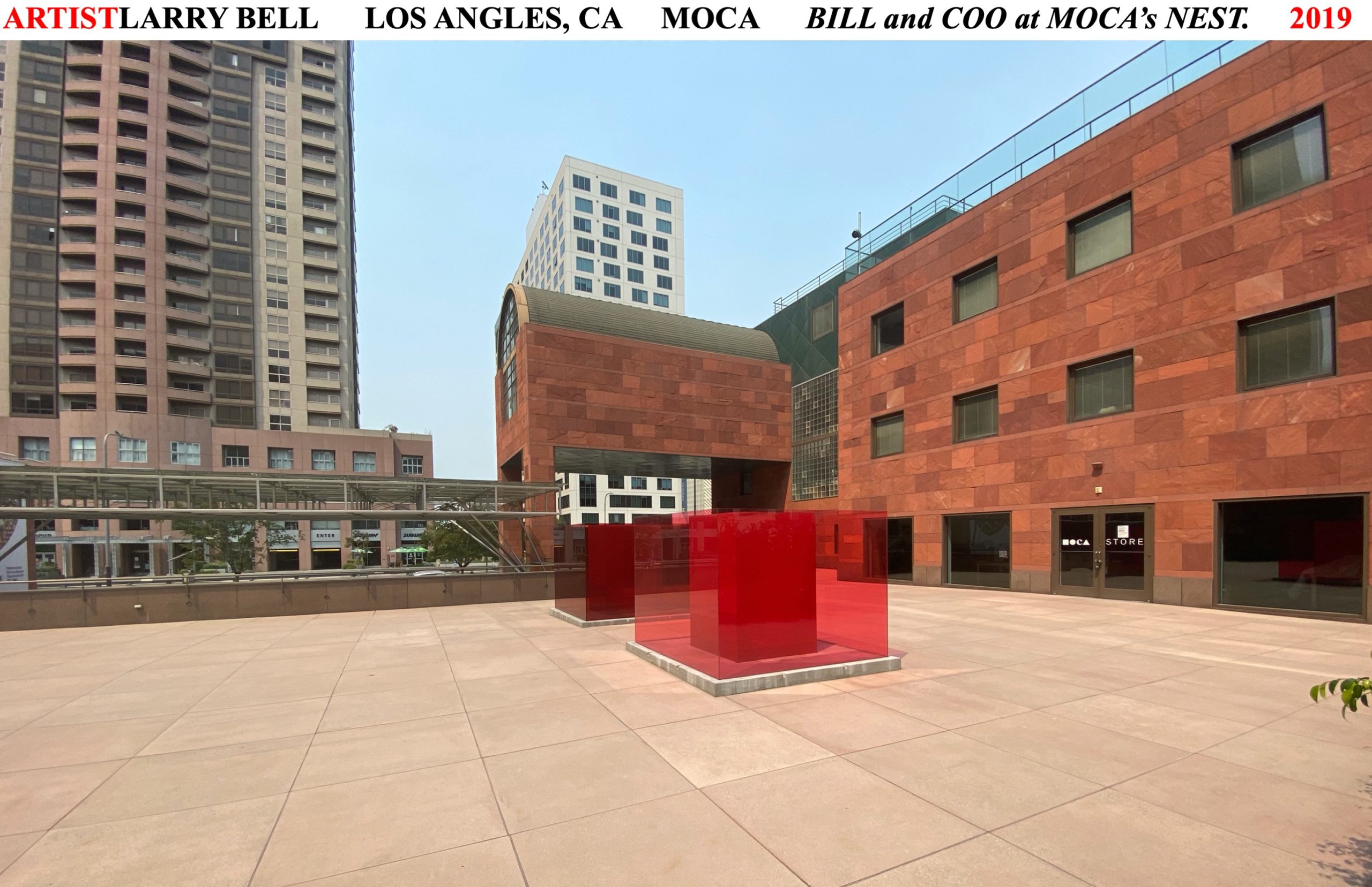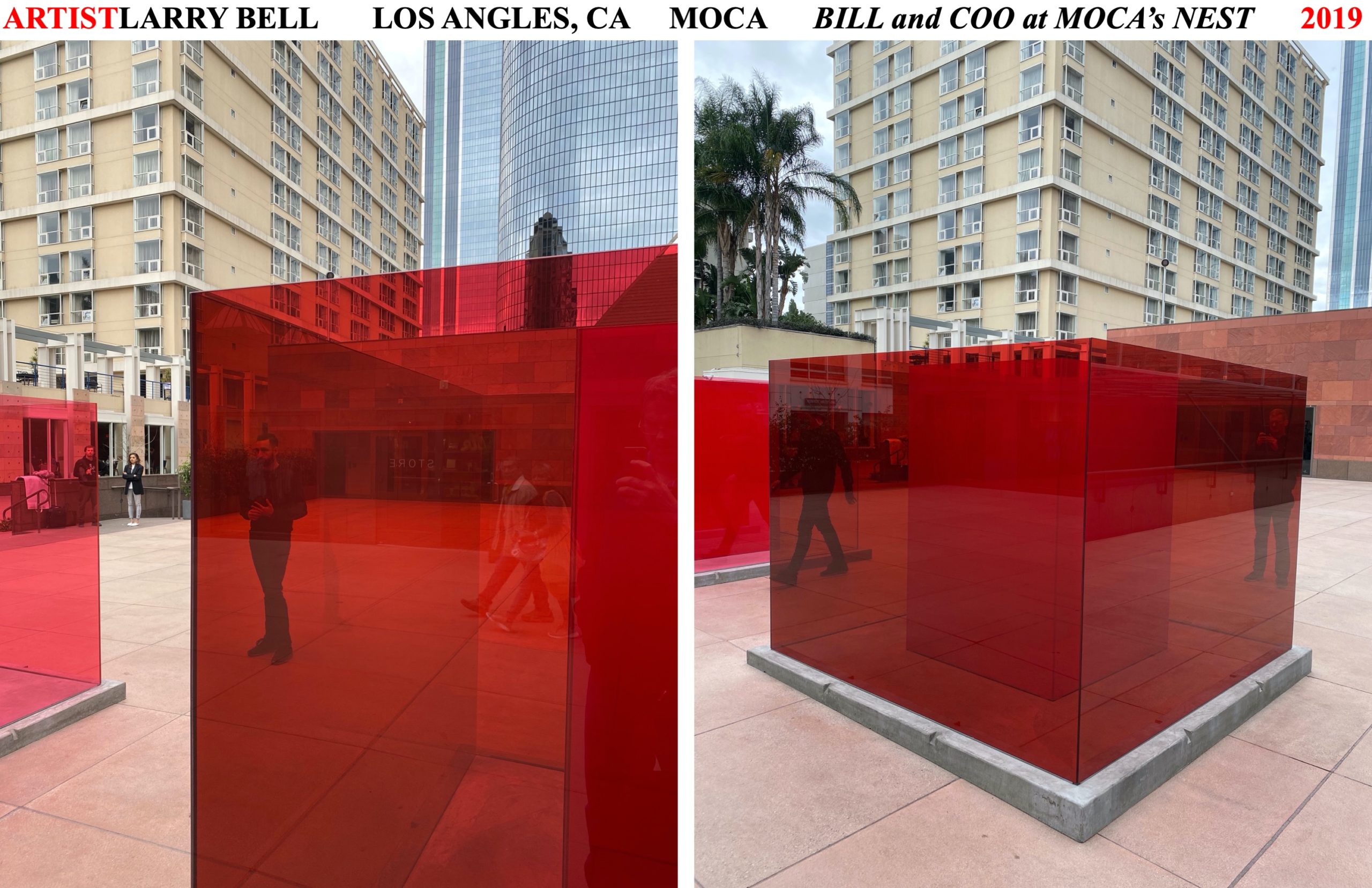 Bill and Coo at MOCA’s Nest, 2019, is among Larry Bell’s best public sculptures in the way the colored glass “cubes” dialogue with Arata Isozaki’s geometric architecture and accentuate the sun’s movement as the red “cubes” project ephemeral colored shade and shadows in a hard edged urban setting. The DTS Project House reverses Bell’s placing of a translucent and reflective glass construction in a hard edged context by placing a hard edged fabrication in a context of transparent, translucent, and reflective glass.