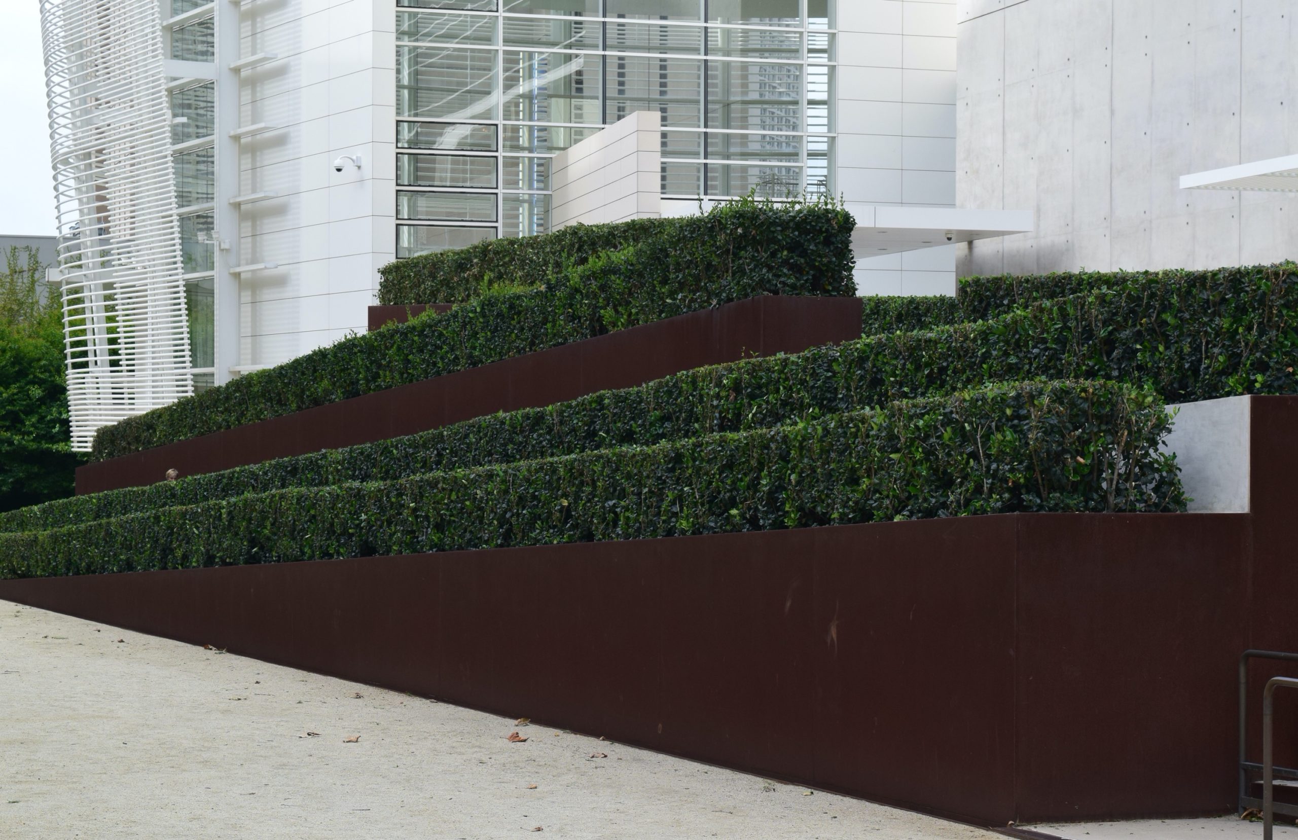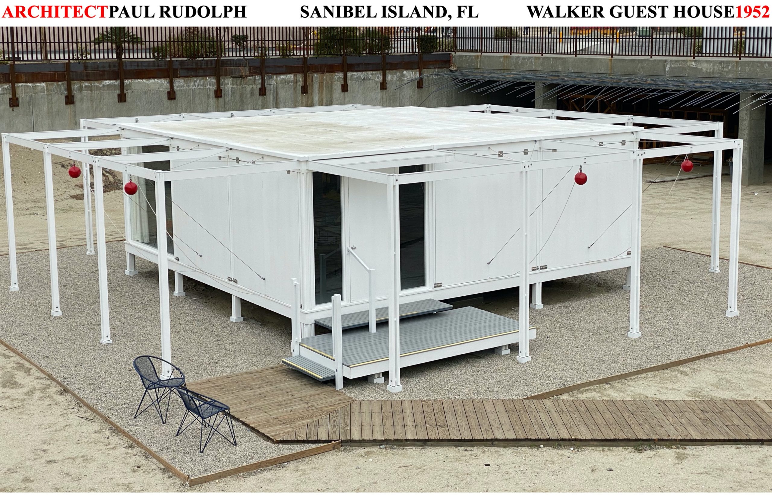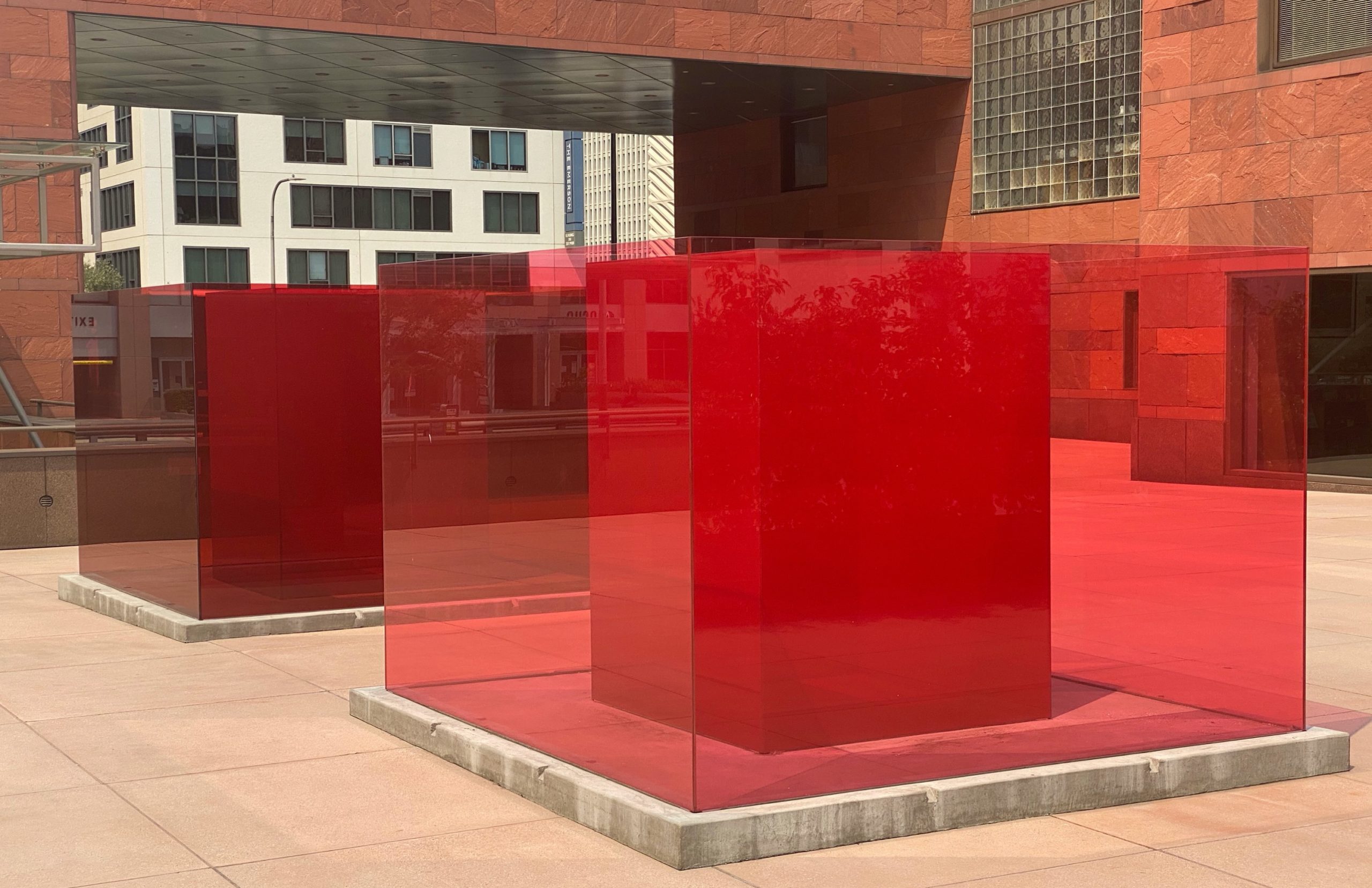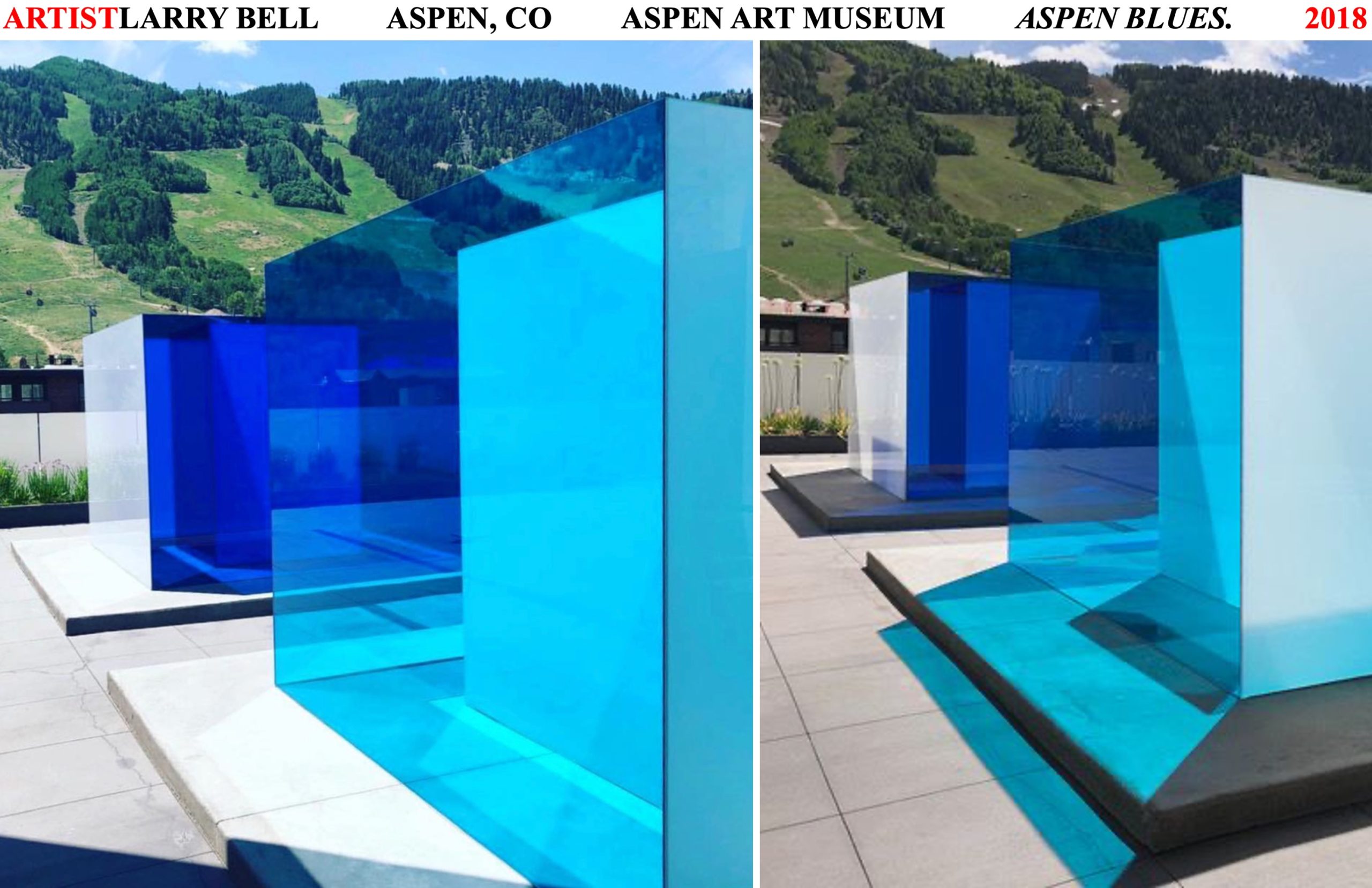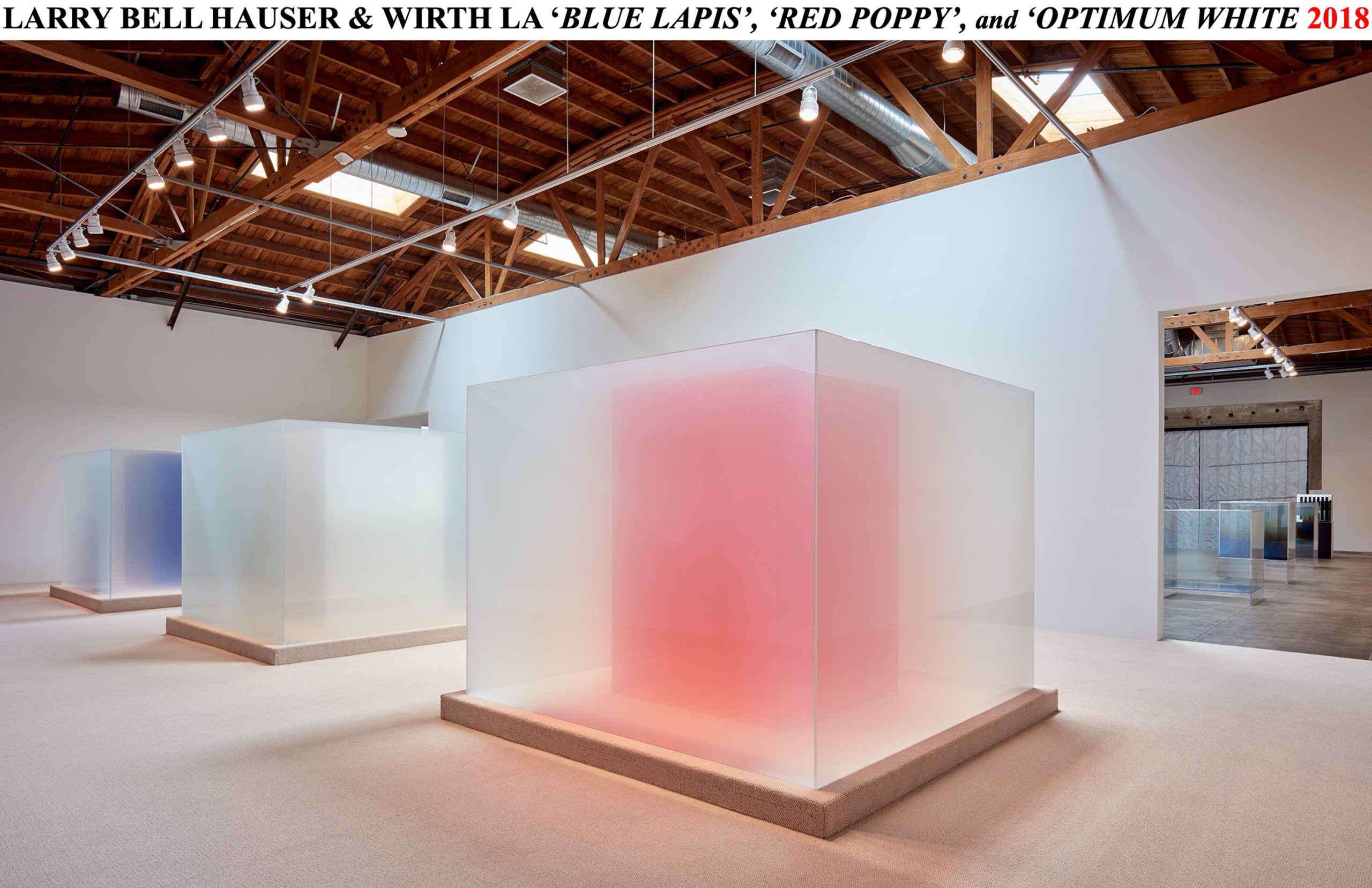 Bill and Coo at MOCA’s Nest, 2019, is among Larry Bell’s best public sculptures in the way the colored glass “cubes” dialogue with Arata Isozaki’s geometric architecture and accentuate the sun’s movement as the red “cubes” project ephemeral colored shade and shadows in a hard edged urban setting. The DTS Project House reverses Bell’s placing of a translucent and reflective glass construction in a hard edged context by placing a hard edged fabrication in a context of transparent, translucent, and reflective glass.