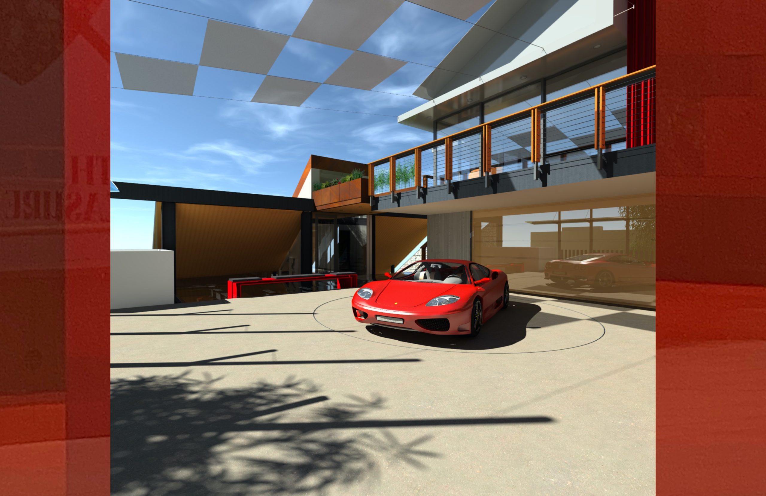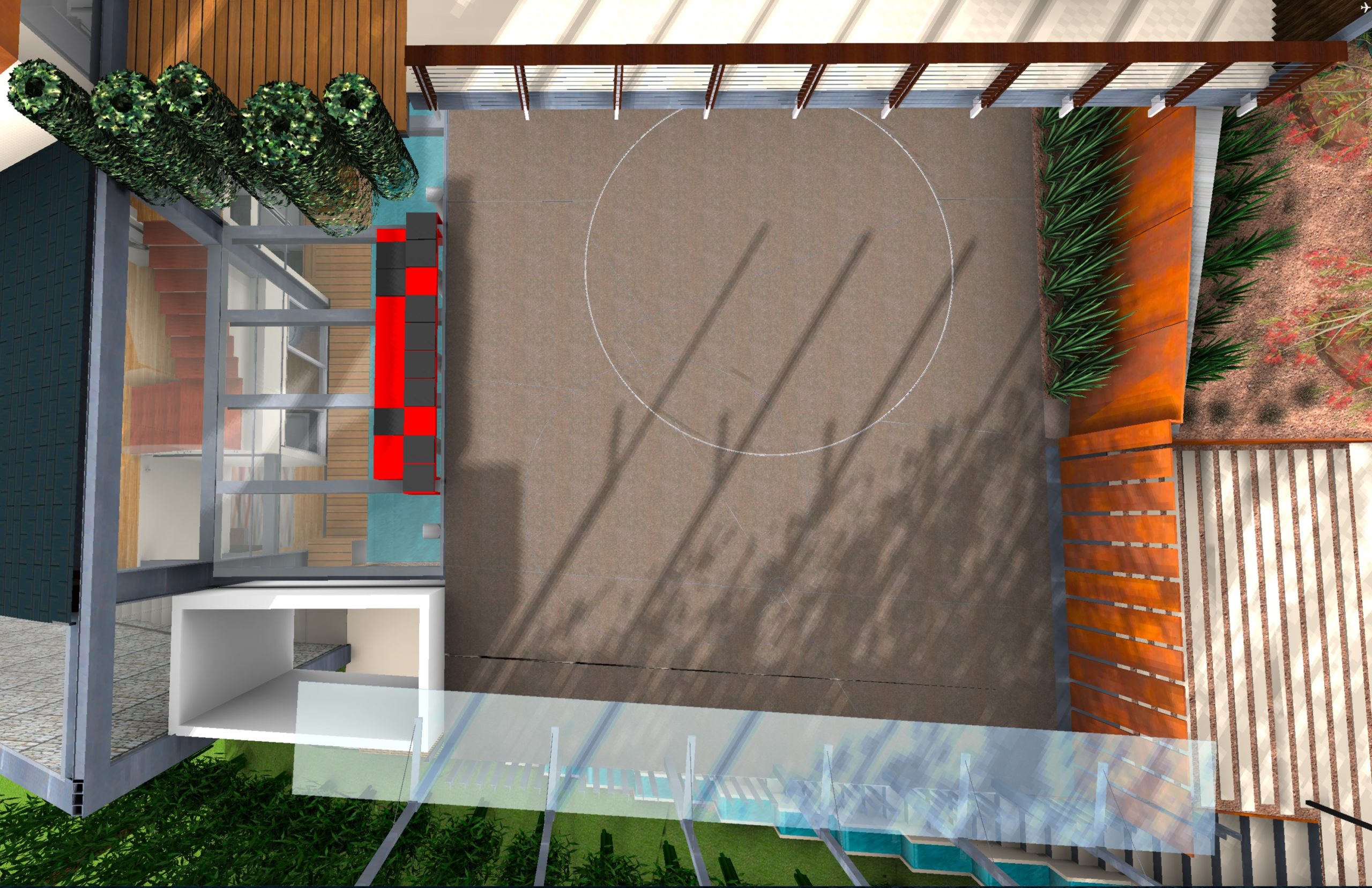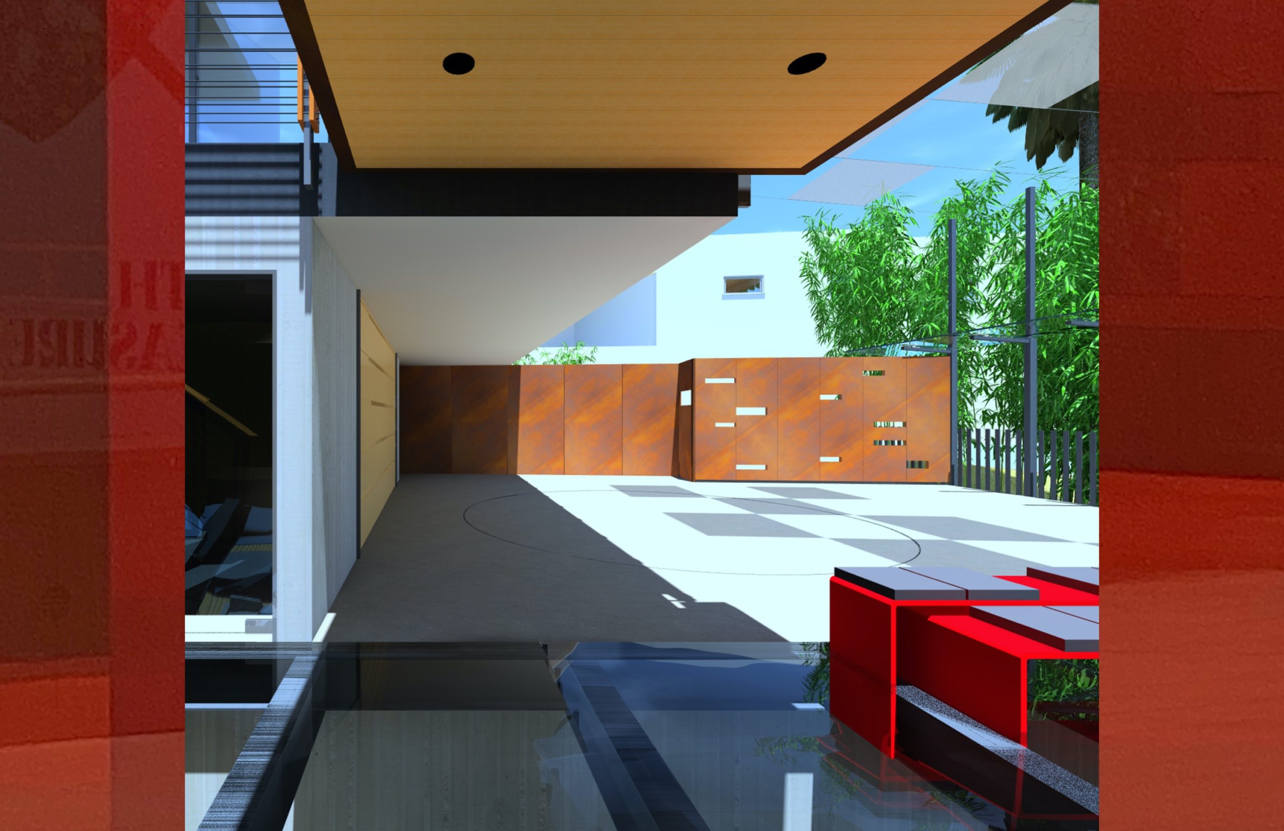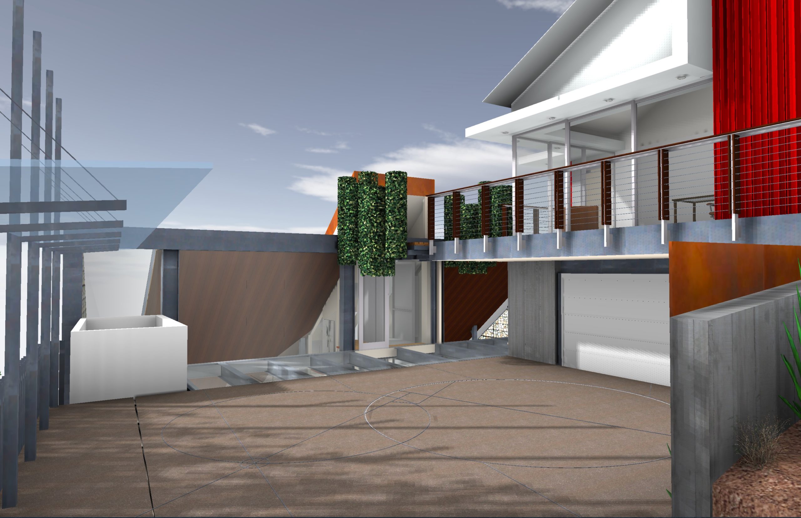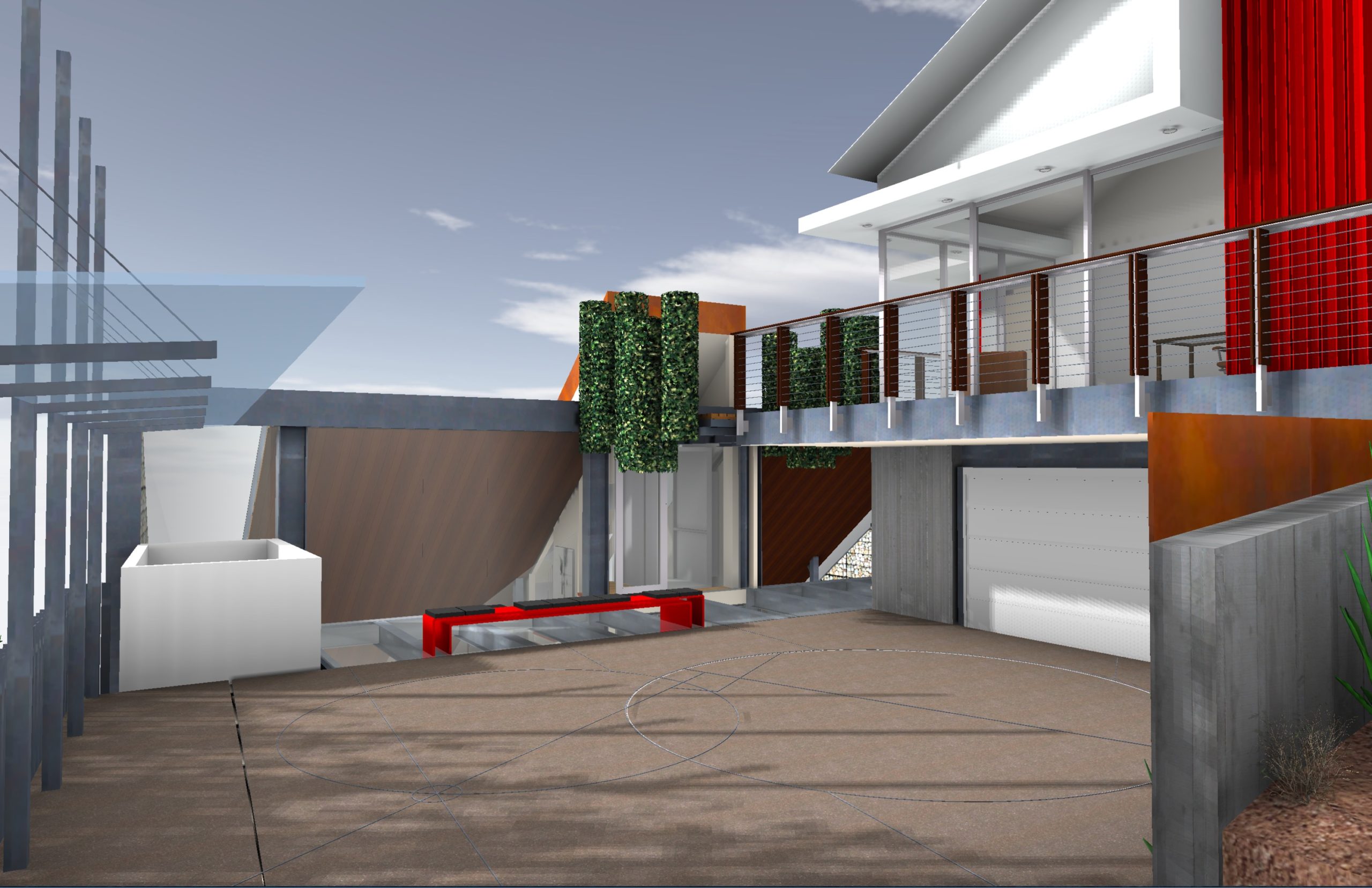 The DTS Project House’s enclosed street level hardscape space is equally motor court and “urban plaza” for social gathering. The glass floor that serves as the roof of the pool must assure no vehicle traffic for its own protection. The work of Artist Larry Bell, and specifically his colored “glass cubes” set in public plazas, pointed mills studio to an approach to meeting the requirement to keep vehicle traffic off of the glass floor and visually activate the “urban plaza” with a minimalist sculpture.