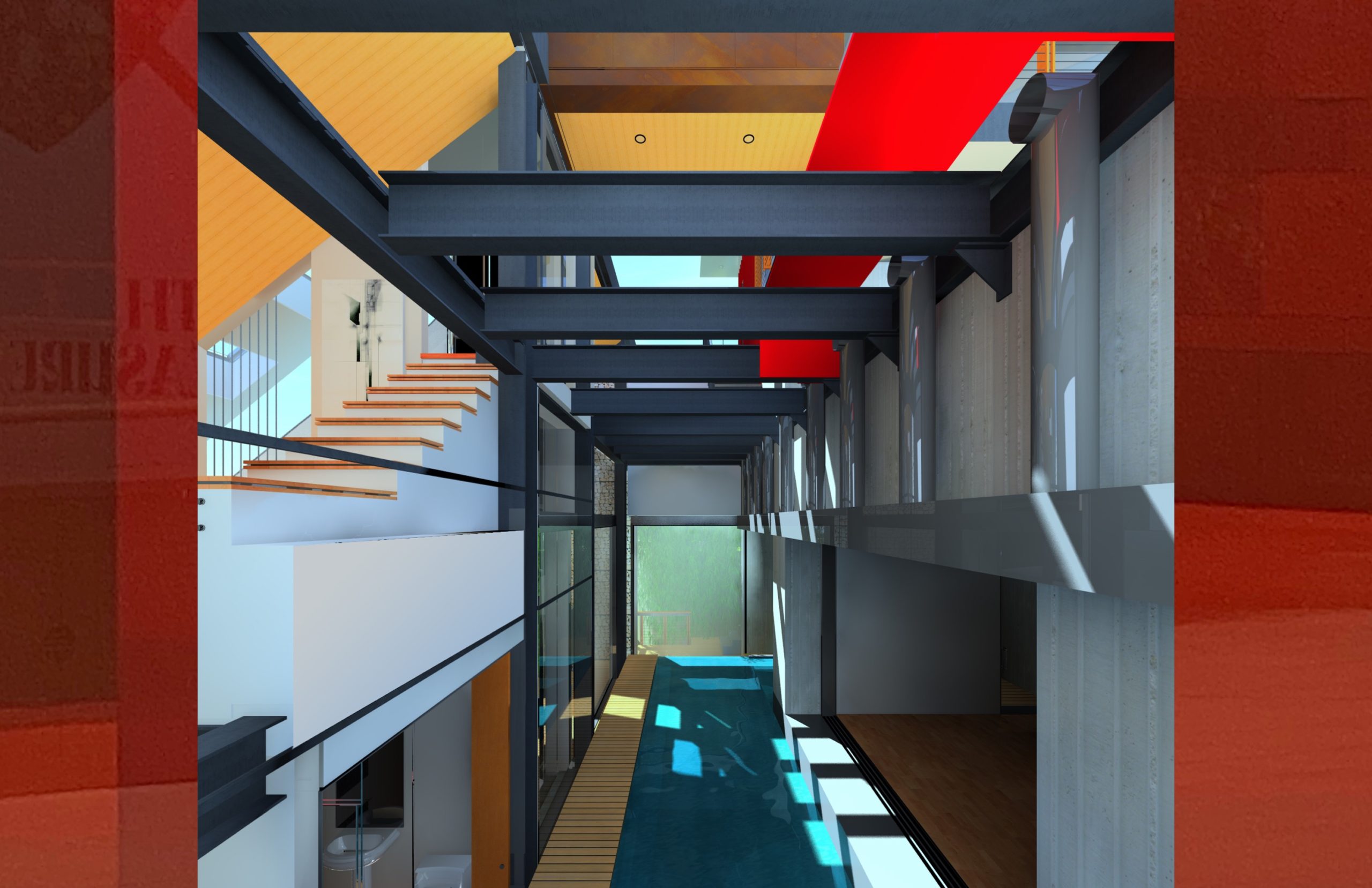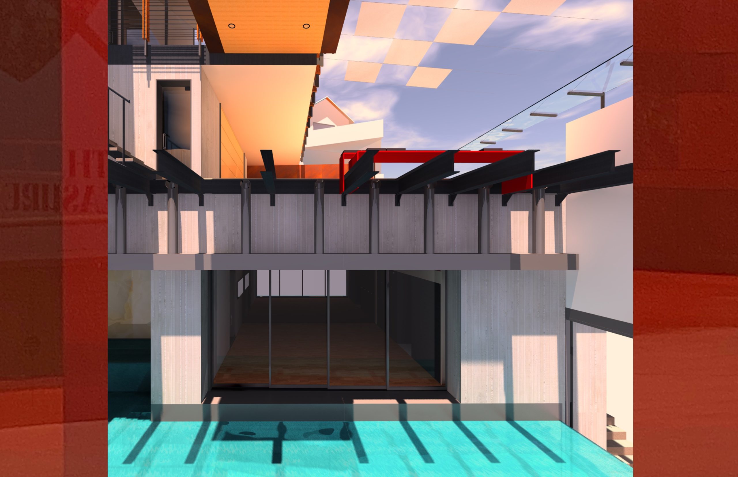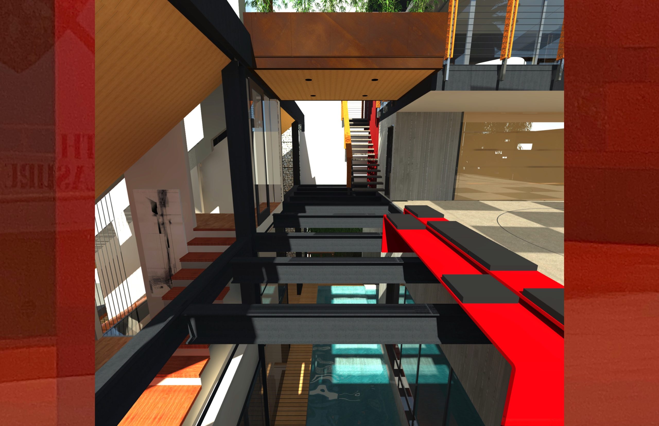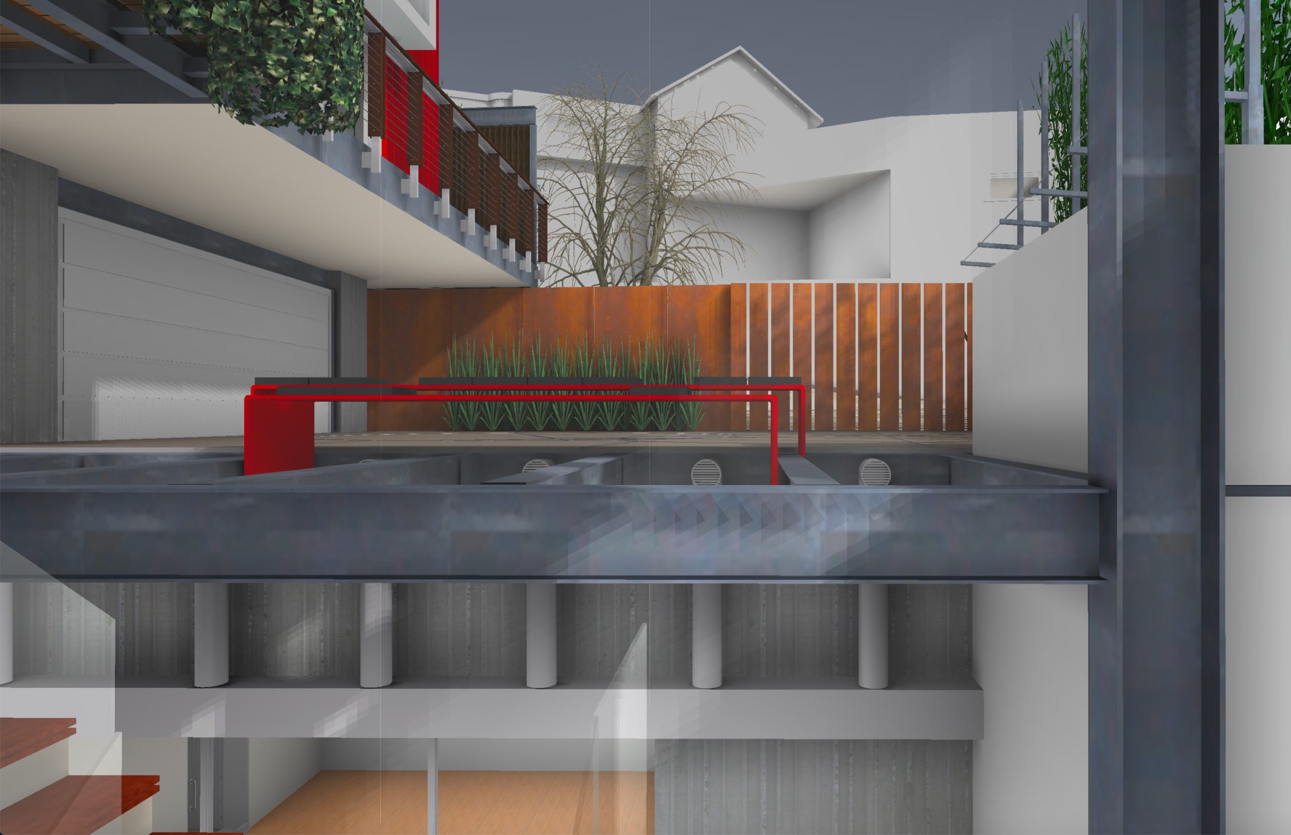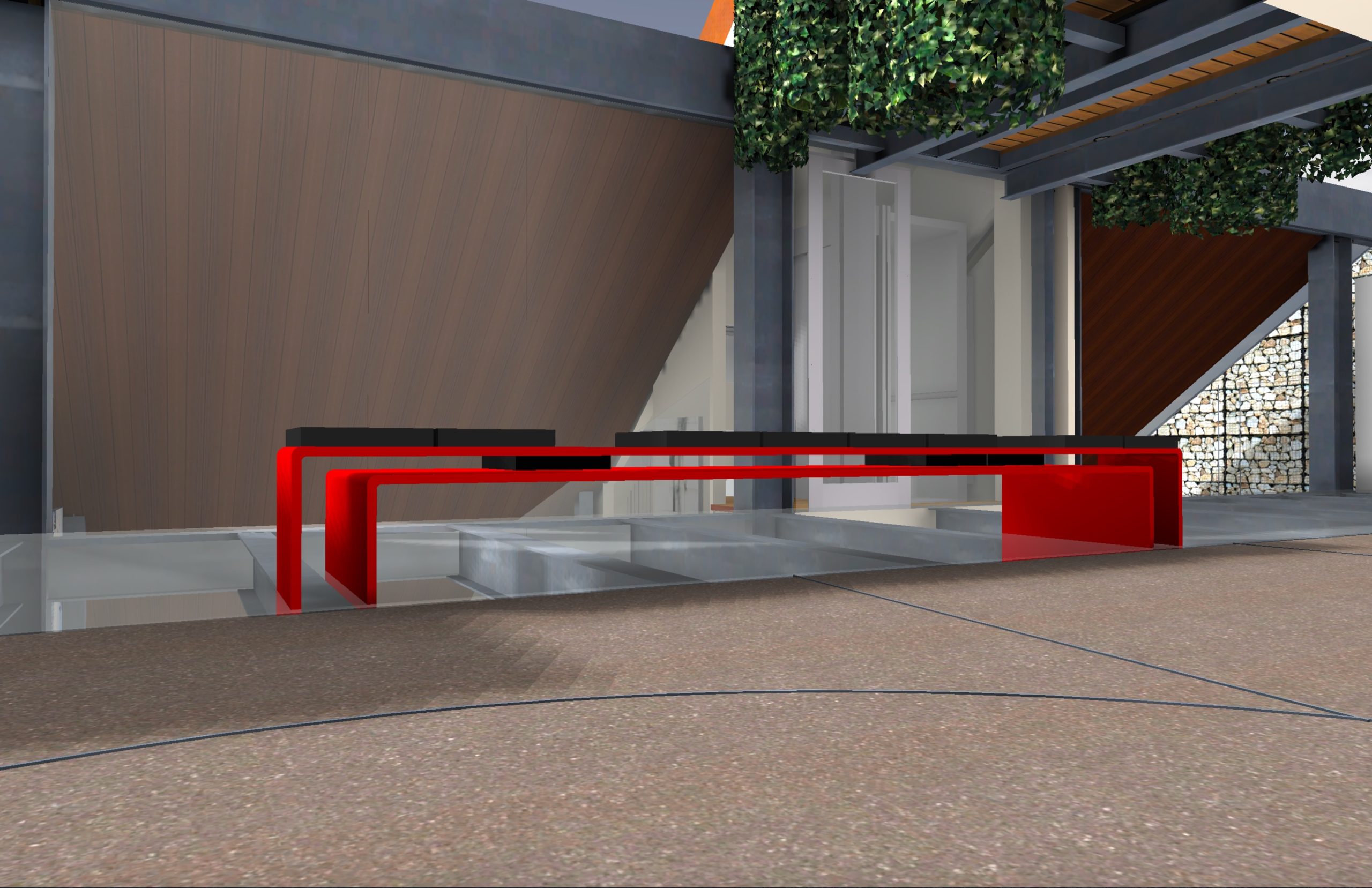 mills studio set a minimalist metal bench at the edge of the transition from the motor court’s hard surface to glass providing a barrier preventing vehicle tires from accidentally reaching the glass surface, providing seating for the gathering space, and helping make the plaza a visually active space. The bench consists of two bent metal plates with an outer fabrication with a highly glossed red finish and an inner fabrication of a non-reflective red finish. The outer high gloss red finish reflects the overhead sun and the inner duller metal appears in shadow when seen through the glass ceiling from the pool space below. The gap between the outer and inner layer is filled with RGBW lighting so that the minimalist sculpture acts as a light fixture for both plaza and pool. The red metal sculpture will reflect in both the horizontal glass floor above the pool and the reflective surface of the garage door. The functional sculpture will be experienced from below, from above and in pure elevation as one goes up and down the central staircase. What begins as a functional necessity is addressed in an artful way.