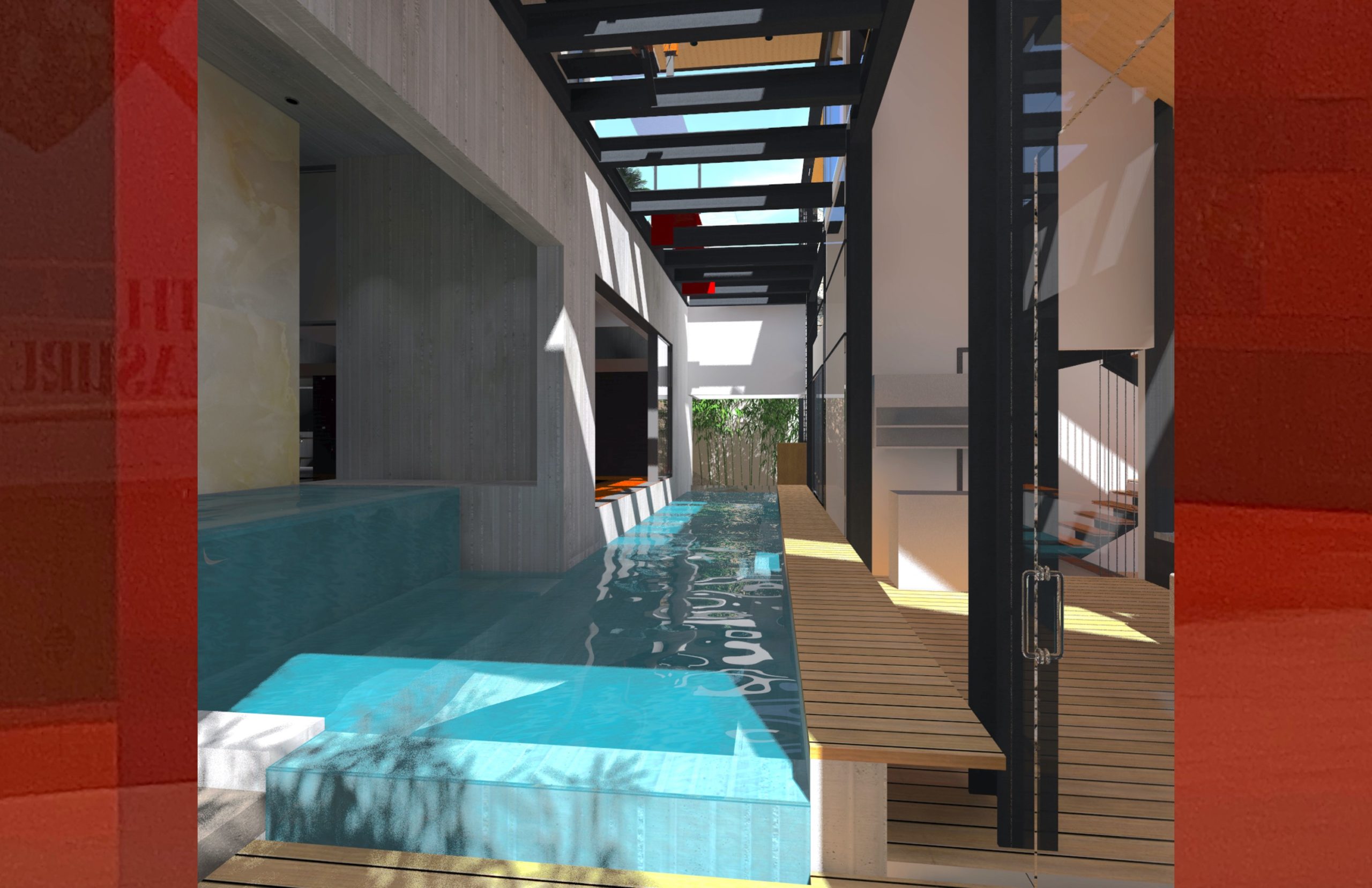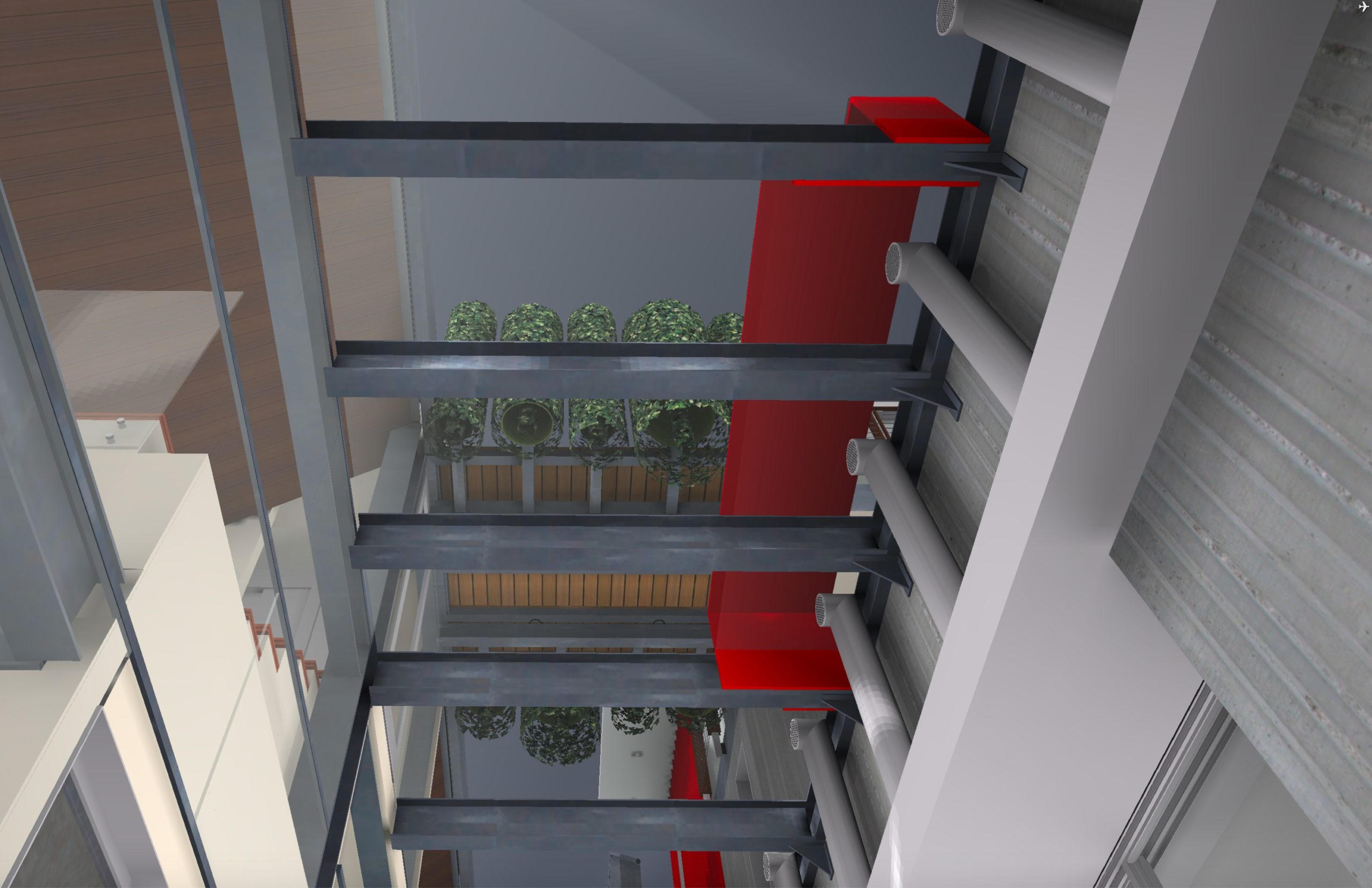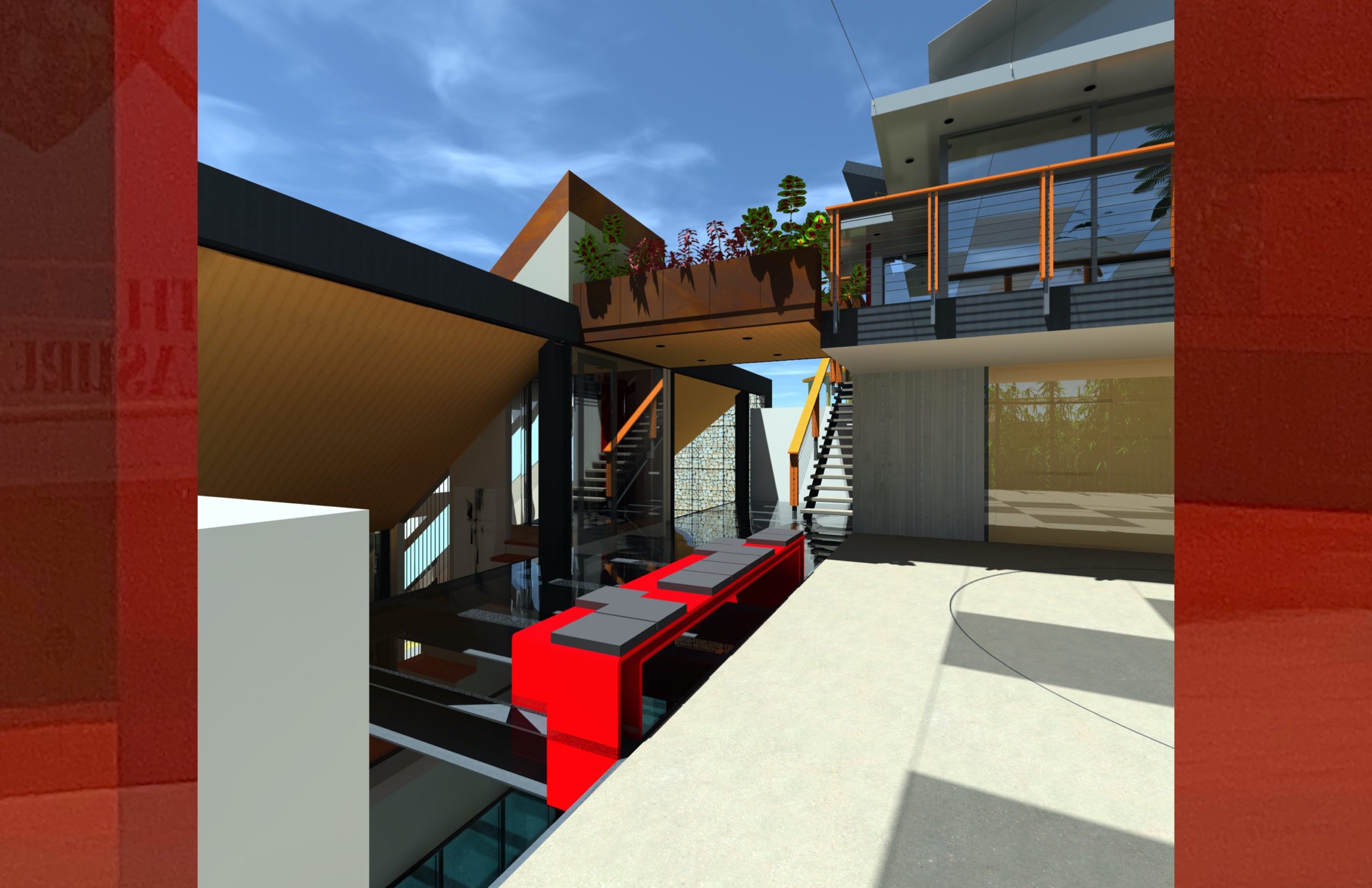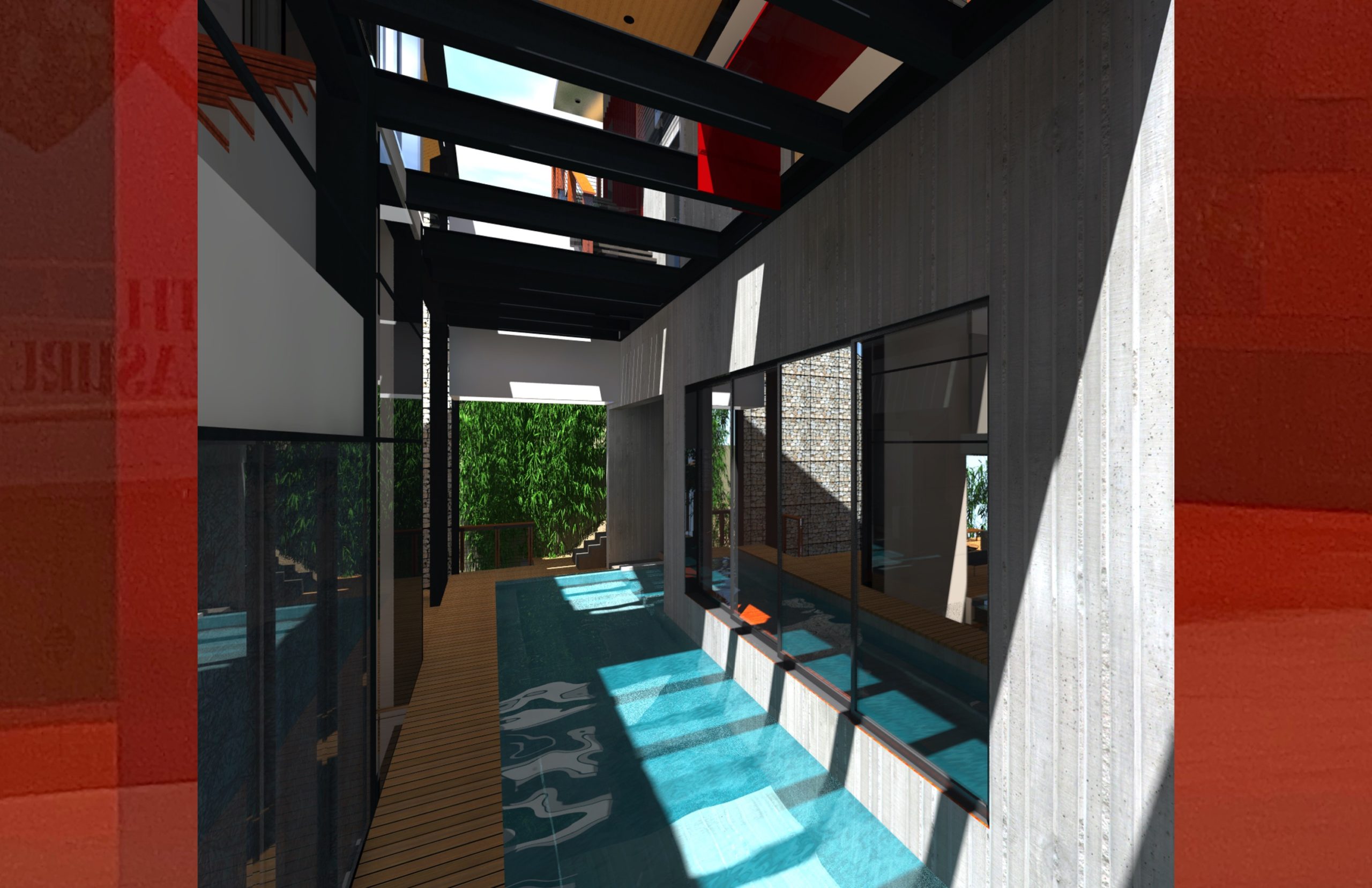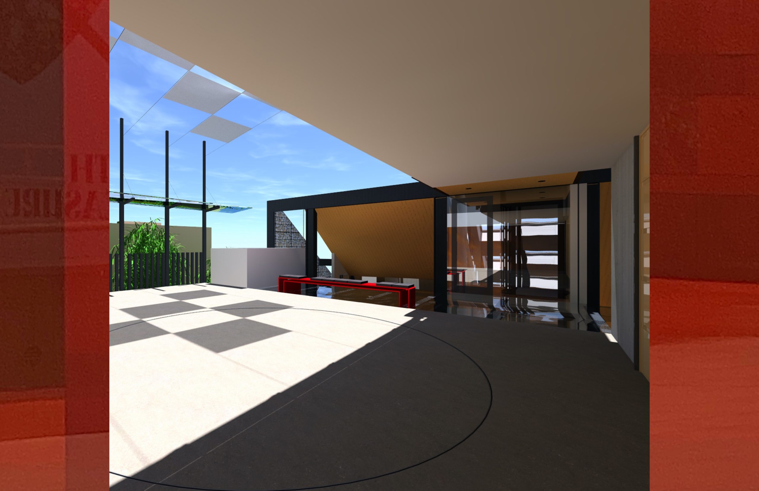 mills studio set a minimalist metal bench at the edge of the transition from the motor court’s hard surface to glass providing a barrier preventing vehicle tires from accidentally reaching the glass surface, providing seating for the gathering space, and helping make the plaza a visually active space. The bench consists of two bent metal plates with an outer fabrication with a highly glossed red finish and an inner fabrication of a non-reflective red finish. The outer high gloss red finish reflects the overhead sun and the inner duller metal appears in shadow when seen through the glass ceiling from the pool space below. The gap between the outer and inner layer is filled with RGBW lighting so that the minimalist sculpture acts as a light fixture for both plaza and pool. The red metal sculpture will reflect in both the horizontal glass floor above the pool and the reflective surface of the garage door. The functional sculpture will be experienced from below, from above and in pure elevation as one goes up and down the central staircase. What begins as a functional necessity is addressed in an artful way.