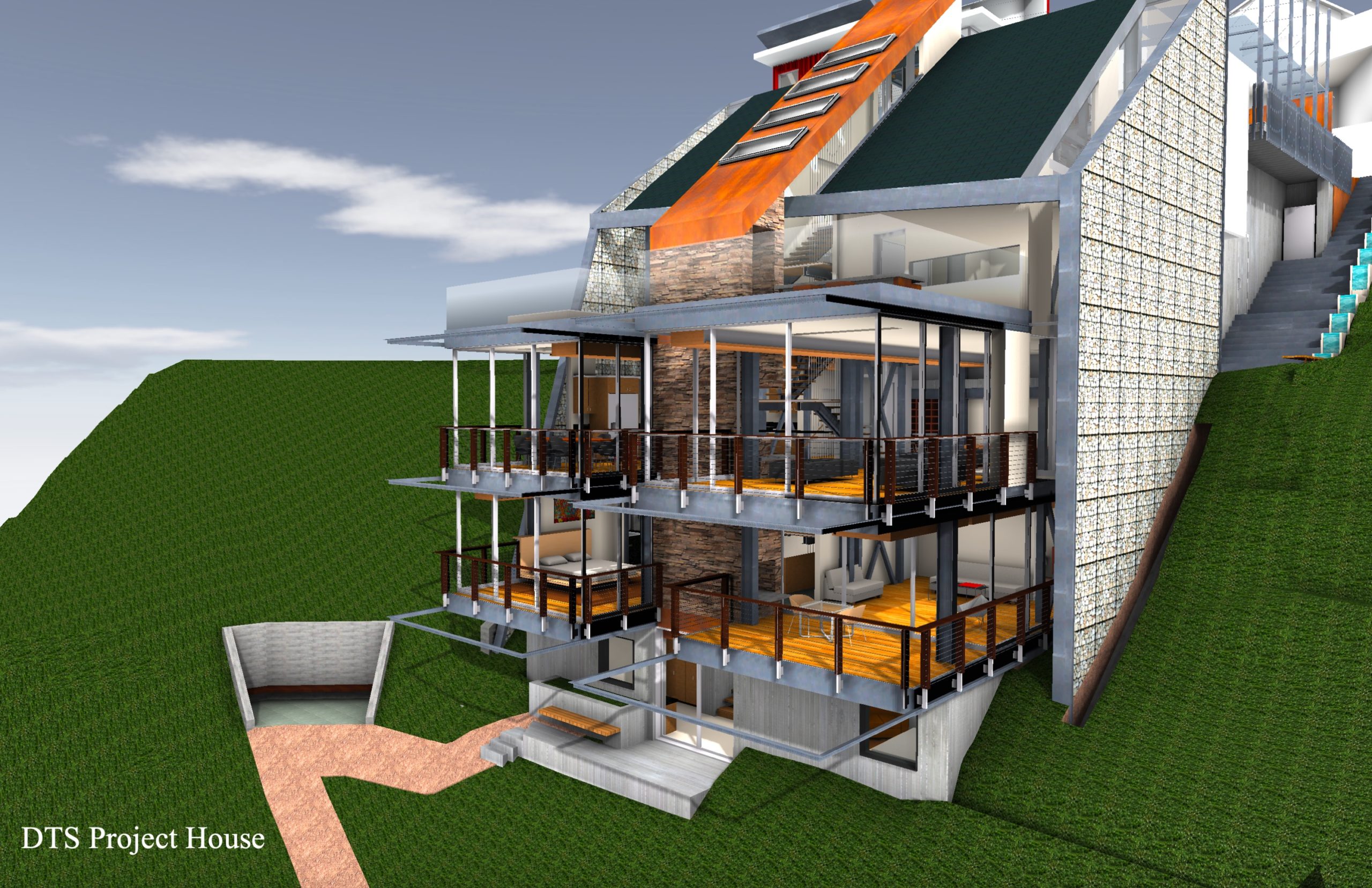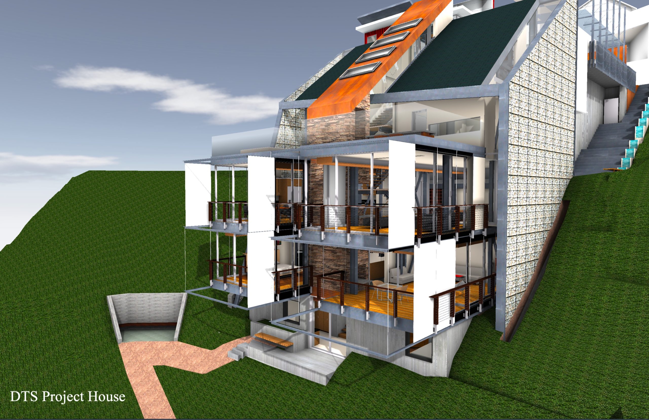 The DTS Project House uses a combination of horizontal shades on the south elevation and vertical shades on the east and west elevations to control the building’s exposure to the sun, provide privacy to both interior and exterior spaces, and make the building a performance piece. Thirty five shades are controlled individually and in groups by the home automation system with input from the weather station so that many multiple configurations respond to environmental factors, time of day, lighting conditions, and the desires of inhabitants wanting to change their surroundings. The multiple configurations alter the interior experience in individual rooms or levels of the house and in turn alter the visual experience of the exterior in seemingly random configurations.