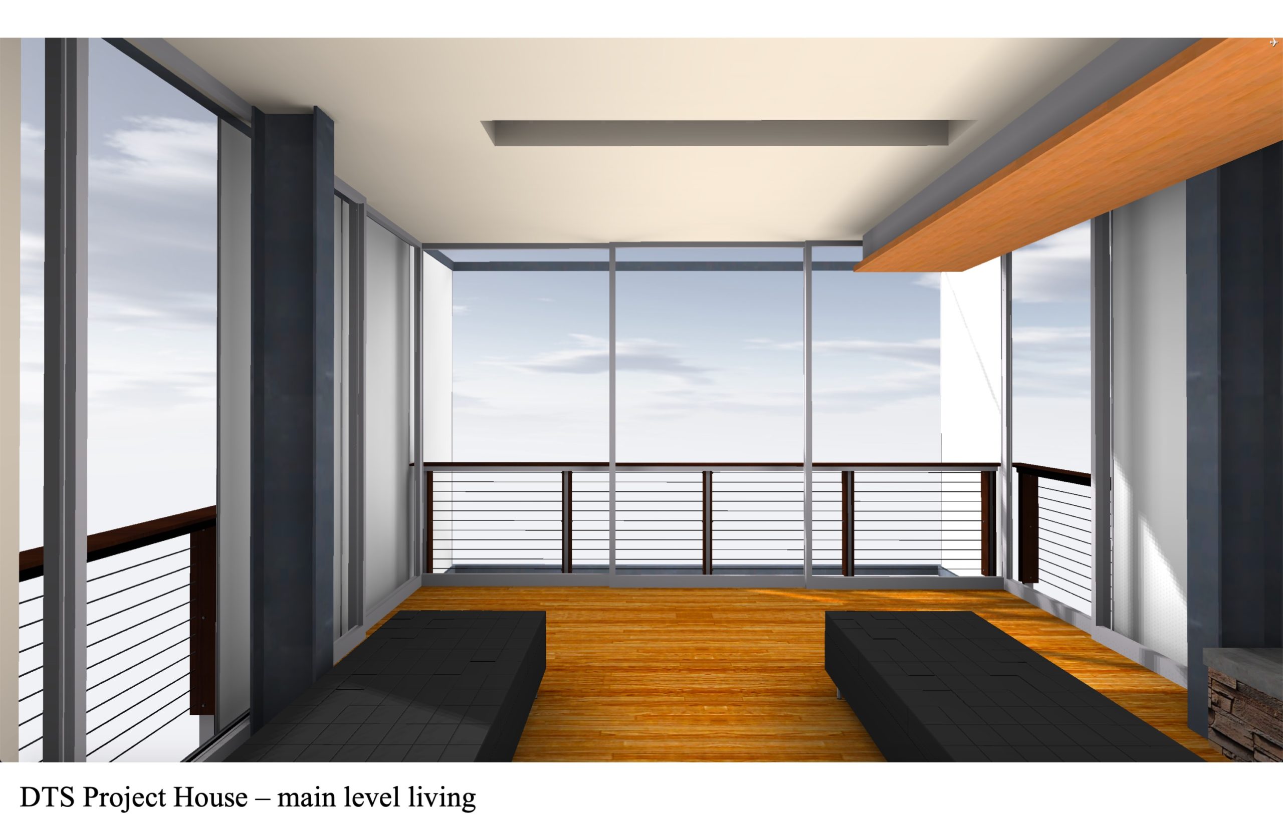 The DTS Project House main living level is open with few solid divisions between areas and defined functions. The central stair is the functional and visual separator of areas. The work of Robert Irwin and specifically his works with scrims, is the motivation for thinking about the possibilities for spatially transforming the open main living space. The central stair in combination with roll down shades and light has the ability to act as a functional and visual divider, transform the stair into its own discrete spatial experience, and provide for a dynamically changing main living level.