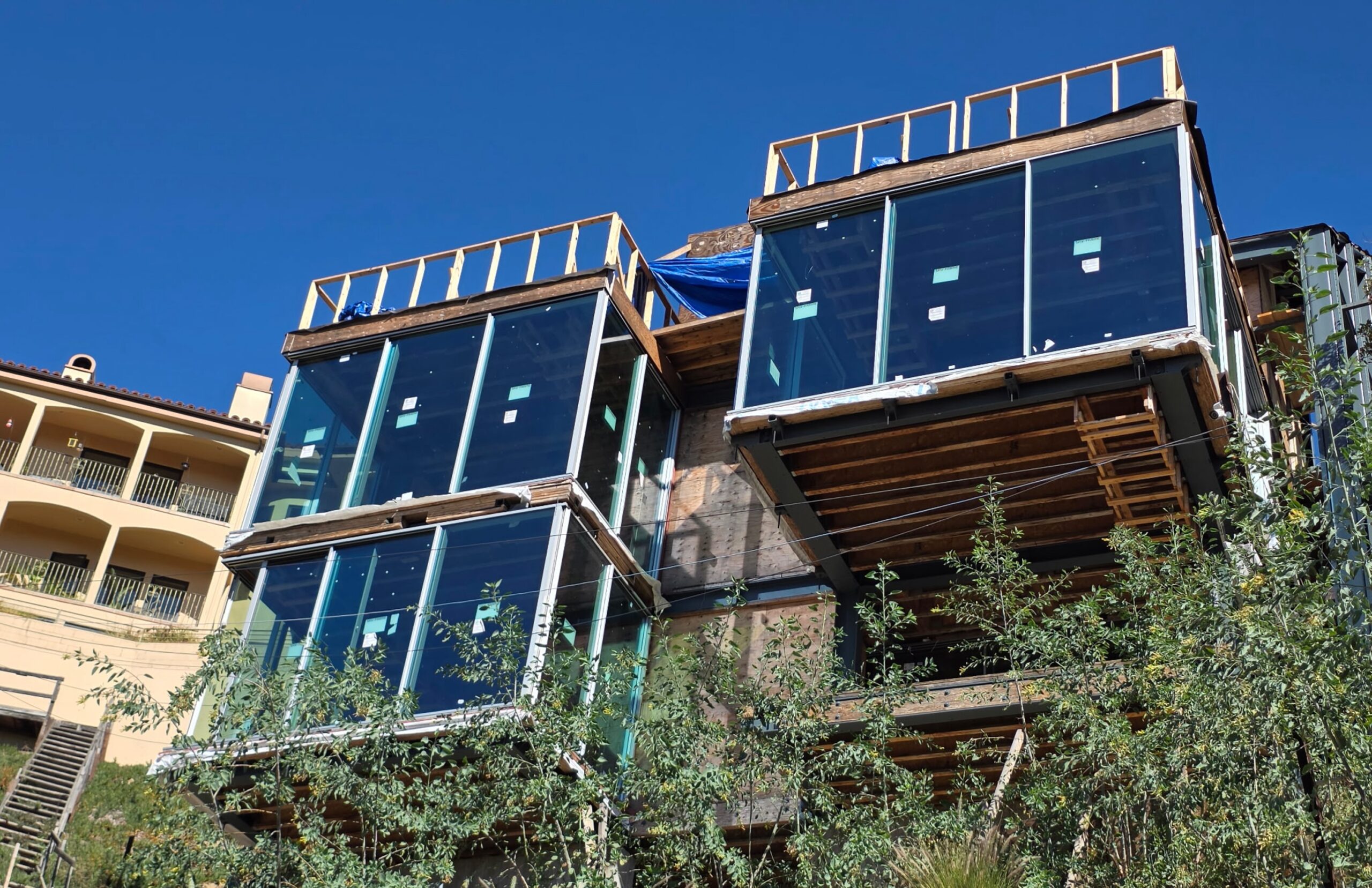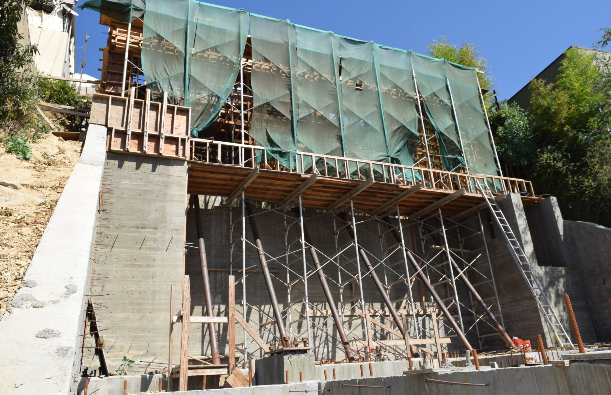 The construction process began with a thorough set of Contract Documents documenting the design intent sufficiently to define the parameters of design integration, but also allow for adjustments and improvements that take advantage of expert input and developing technologies. The Contract Documents outline the integrated design intent and provide a criteria for evaluating the proposed modifications and refinements during construction. mills studio’s creation of Contract Documents continues during the construction as Shop Drawings detailing particular aspects of the construction such as concrete formwork, steel rebar, and steel framing. The exposed structure of concrete and steel will necessarily show the marks of the construction methods and sequencing in the finished building so all construction means and methods must be accounted for. Pre-planning and documented construction sequencing assure that the integrated design intent is not lost during construction on the challenging limited access hillside.
