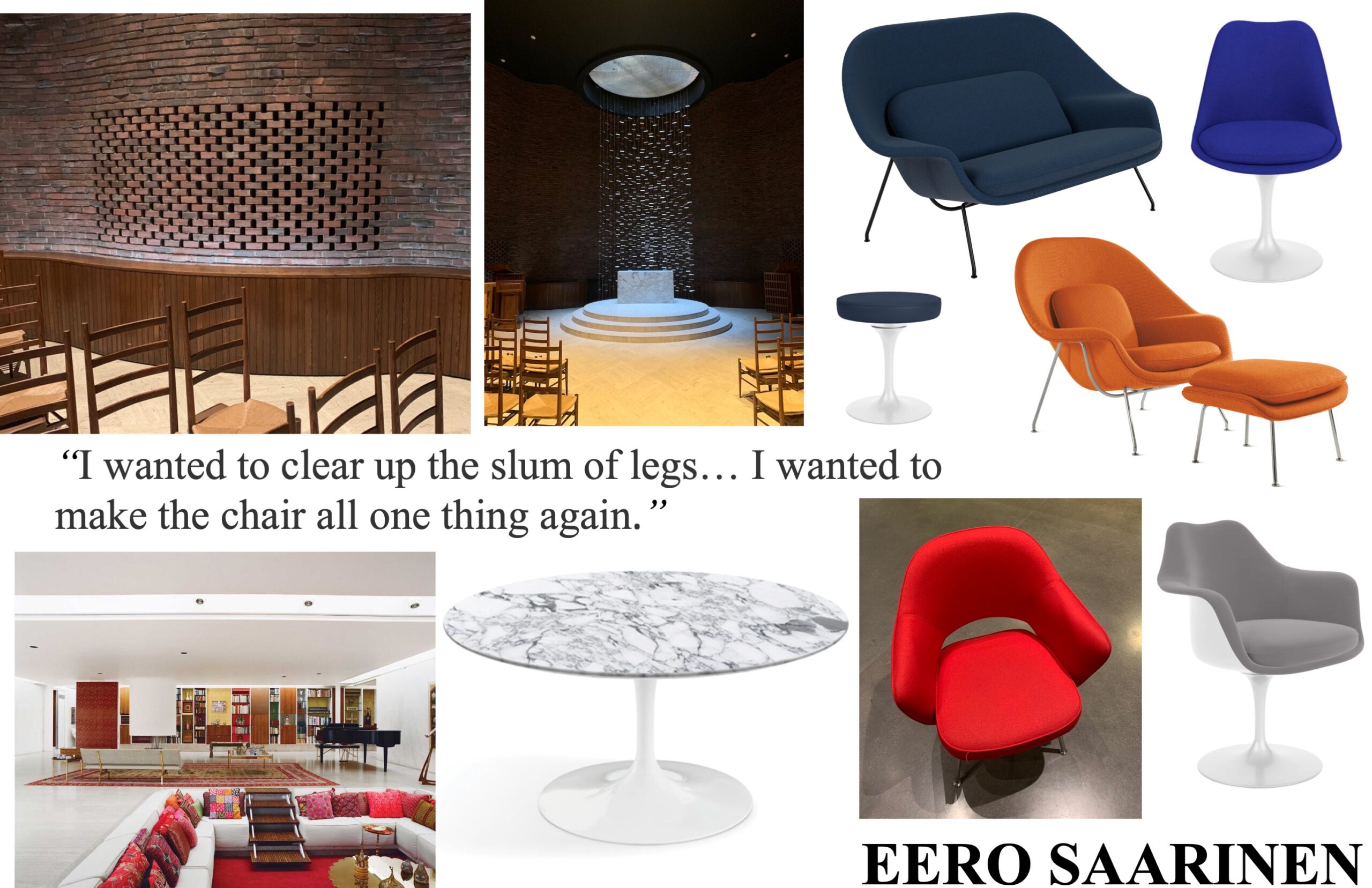 mills studio and the Owners looked at individual furniture pieces designed for a specific project and pieces designed for mass production to see how context or lack of context affects an objects design and aesthetic. It is instructive to see what these pieces have in common since it is not an architectural context. This evaluation helps determine what is universal and what is particular about each furniture type’s design. Architect’s and designer’s own houses, offices, or environments are of prime importance to evaluate as we can see how interior design unfettered by any third-party concerns contributes to the architectural experience.